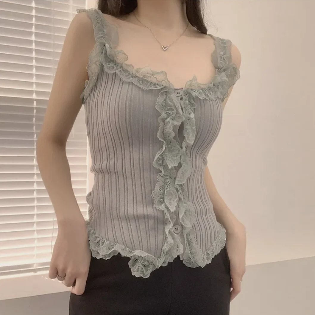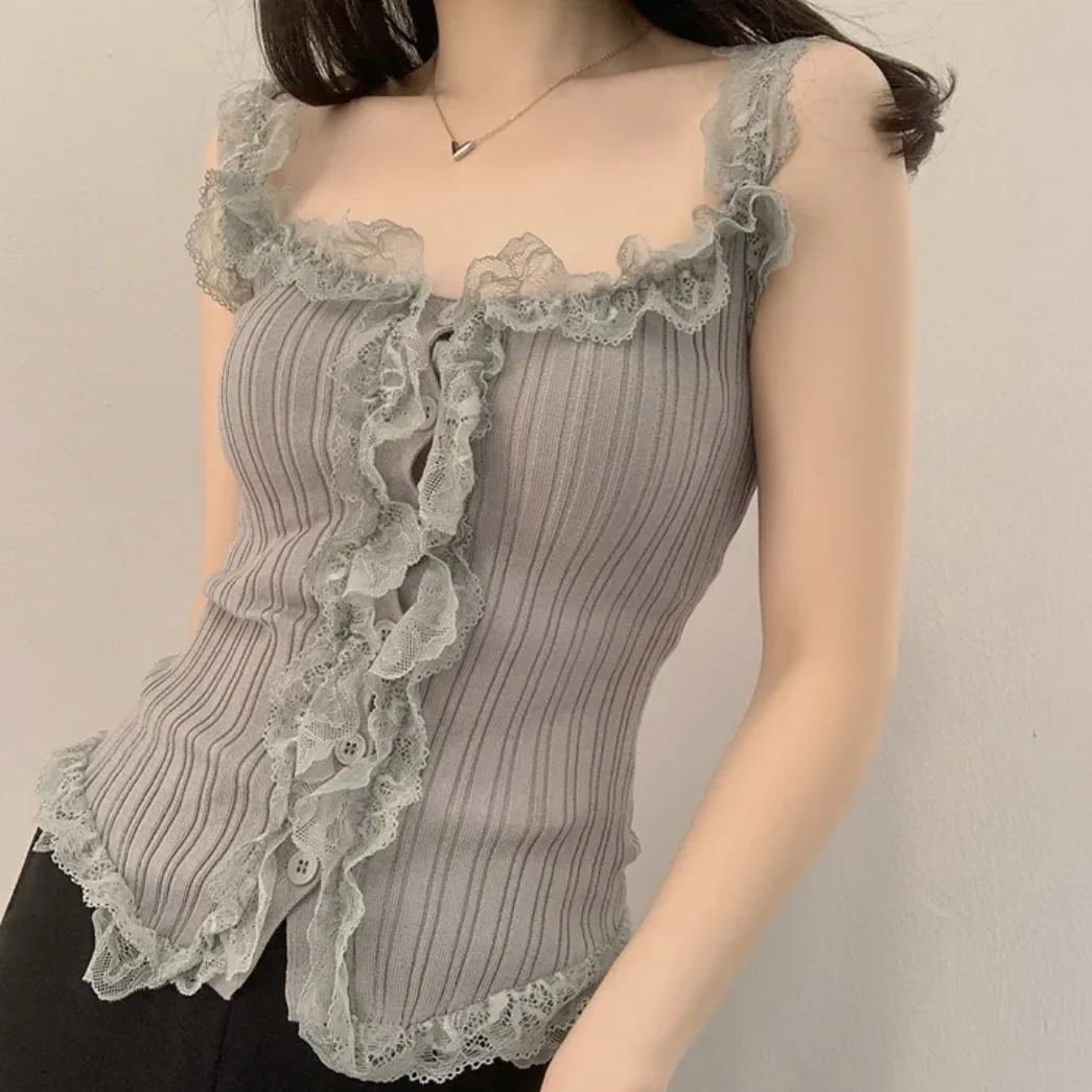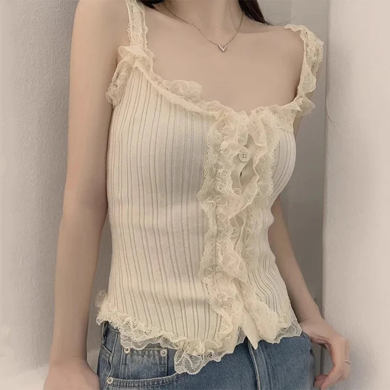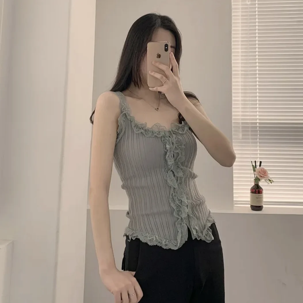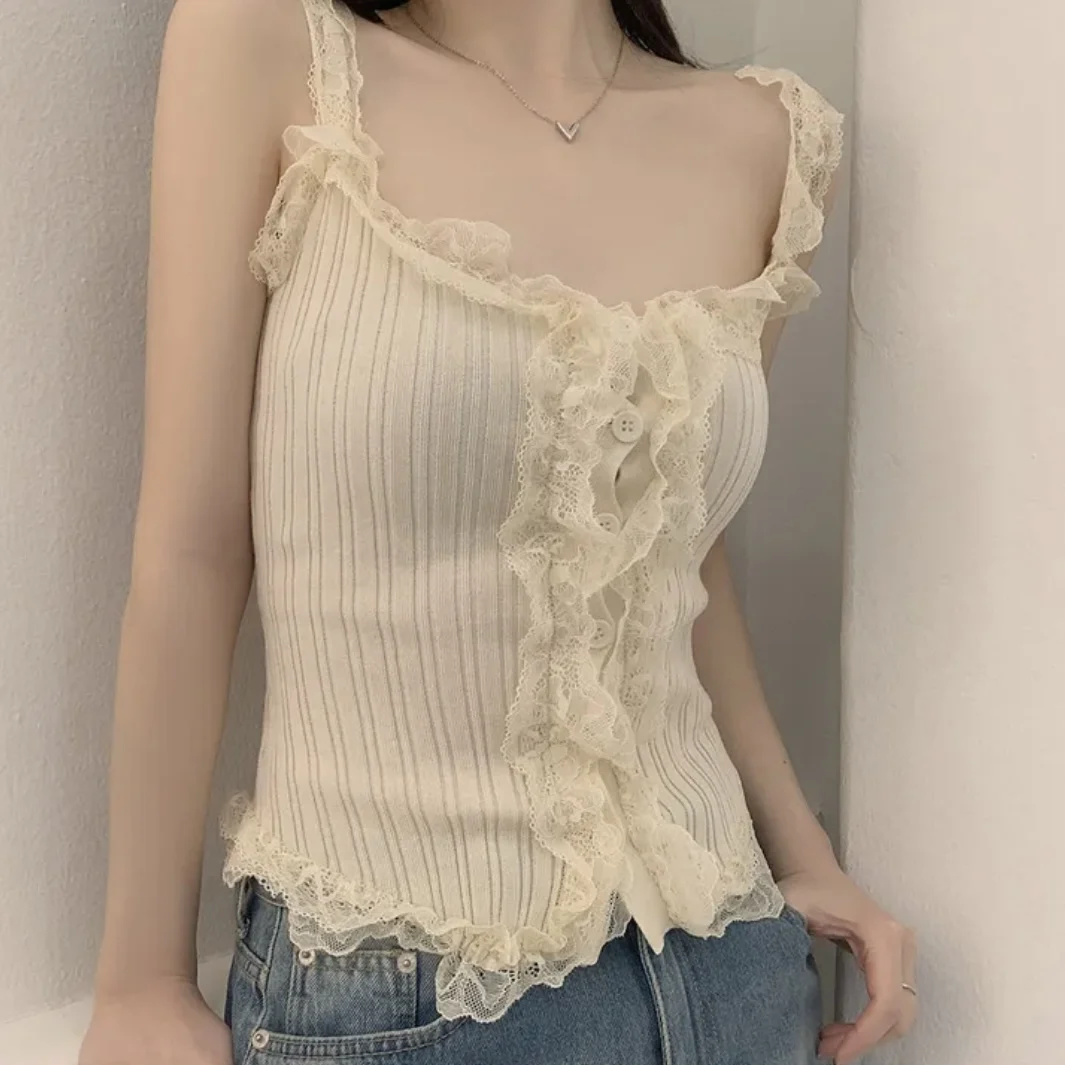 KYLETHOMASW - Korean Lace Patchwork Knitted Vest Women Summer New Style Niche Age Reducing Outerwear Short Ice Silk Camisole Top