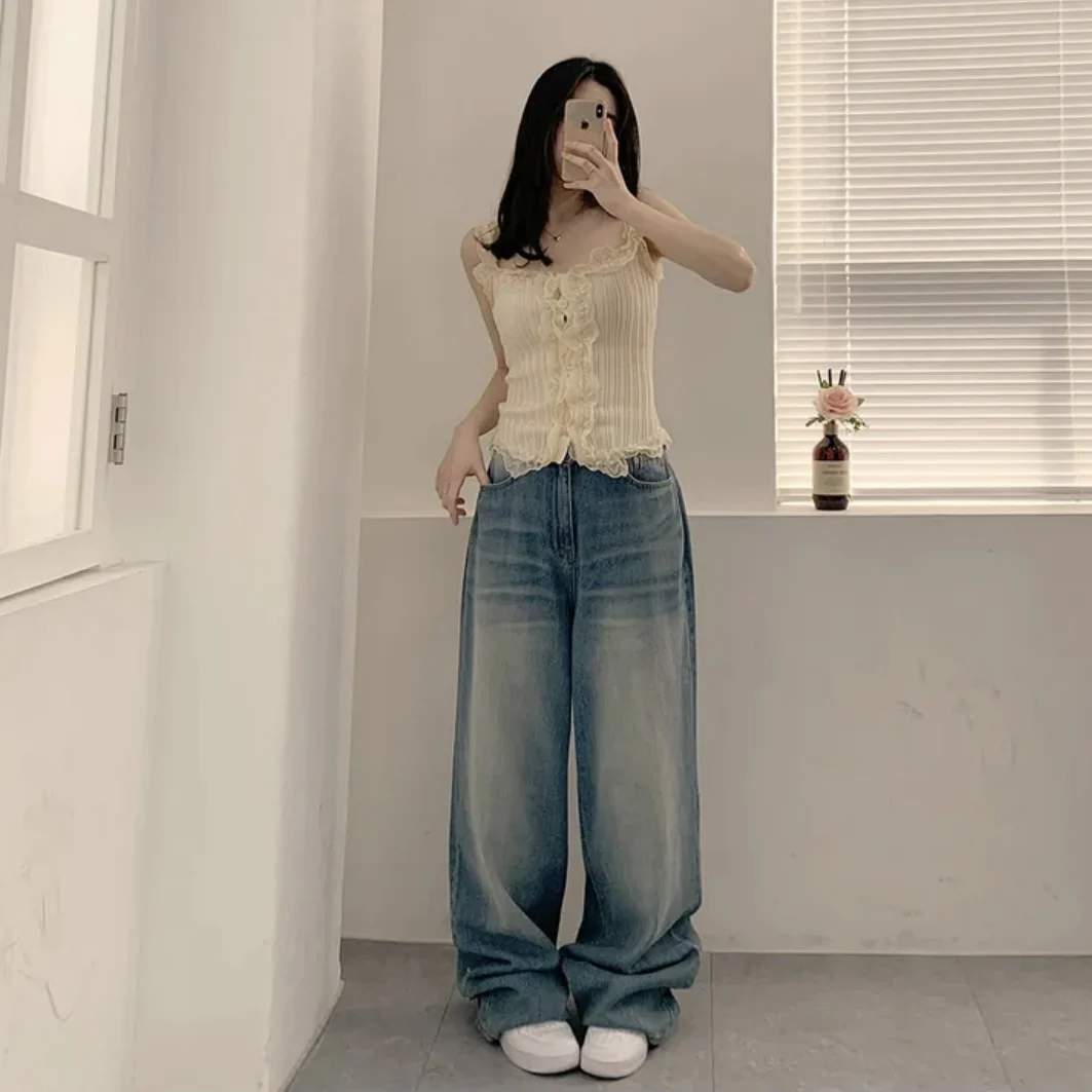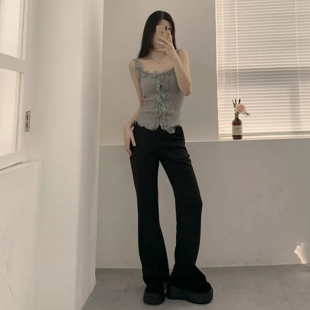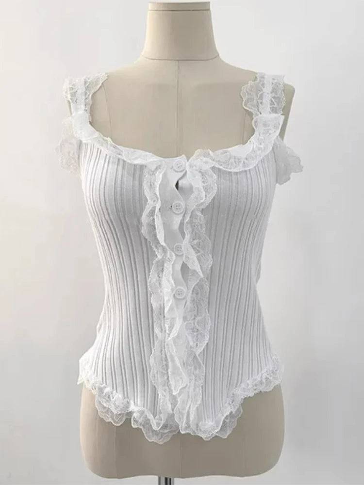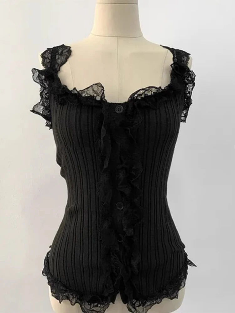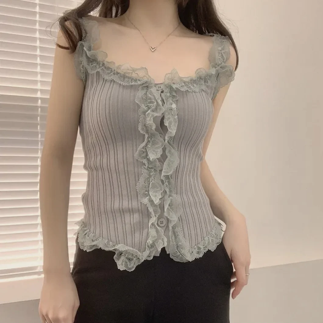 KYLETHOMASW - Korean Lace Patchwork Knitted Vest Women Summer New Style Niche Age Reducing Outerwear Short Ice Silk Camisole Top