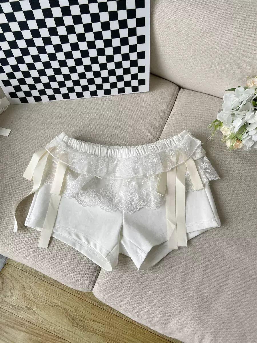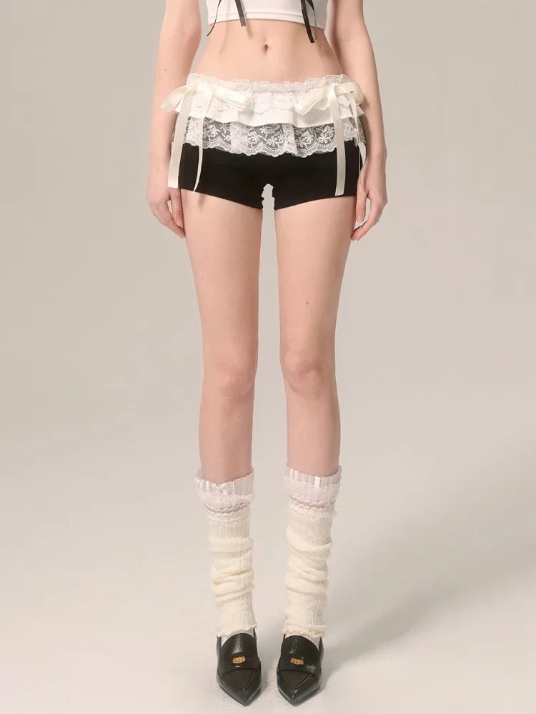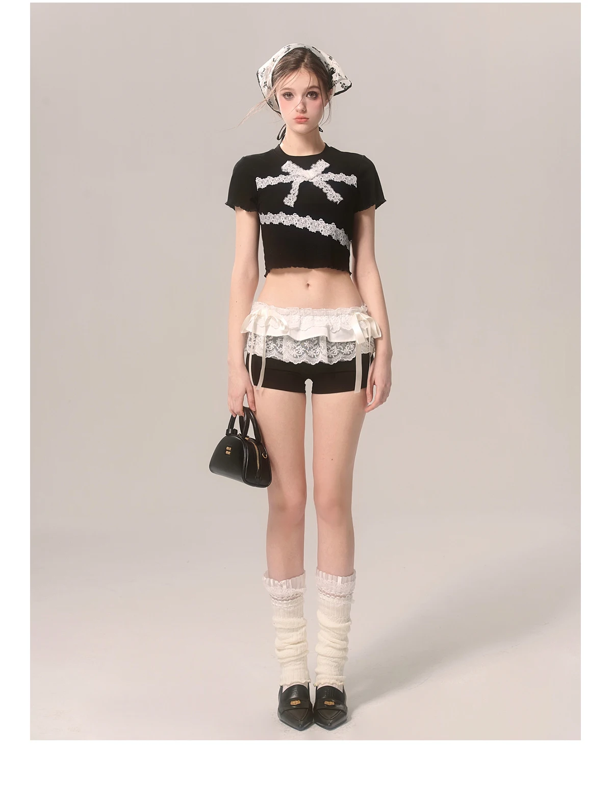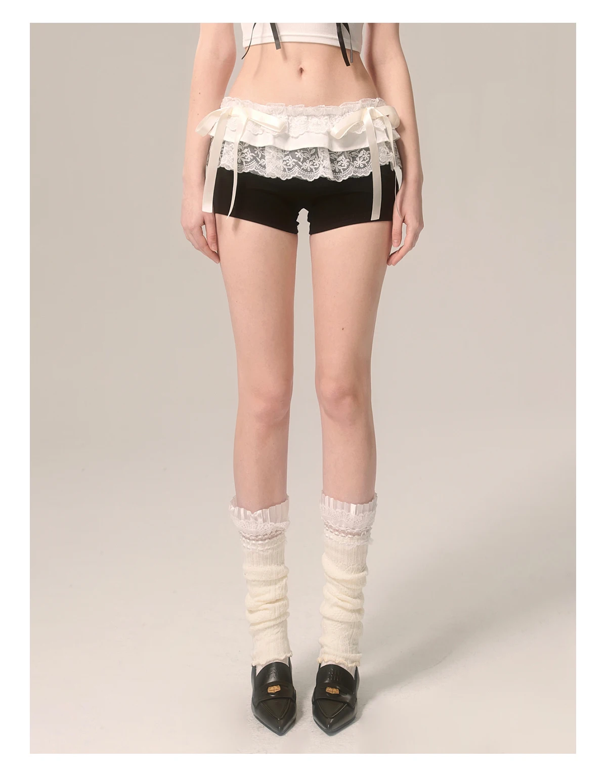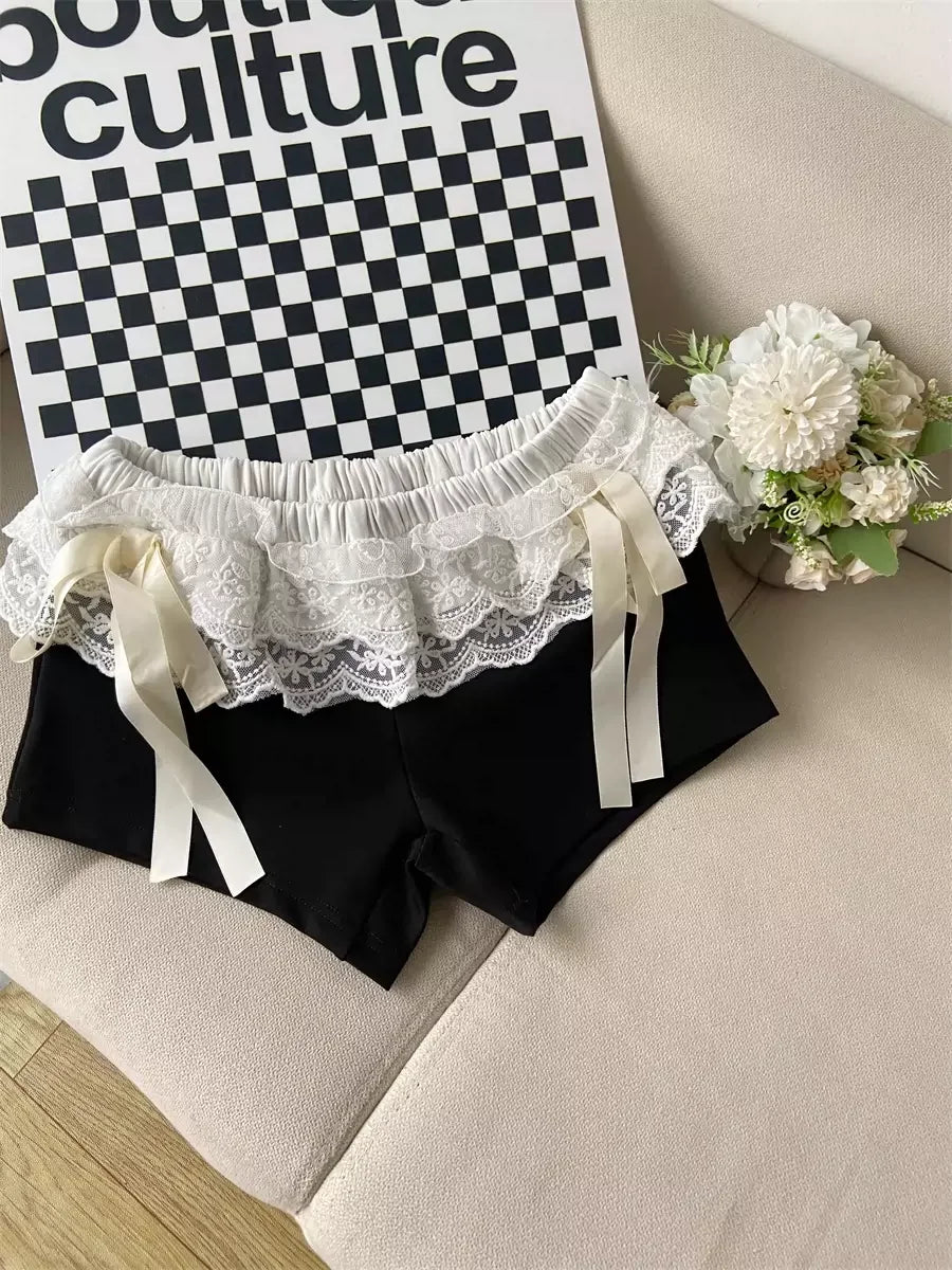 KYLETHOMASW - Lace Patchwork Black Shorts Women Bow Elastic Waist Sexy Girl Tight Short Pants Summer Ballet Style Chic Kawaii Clothes