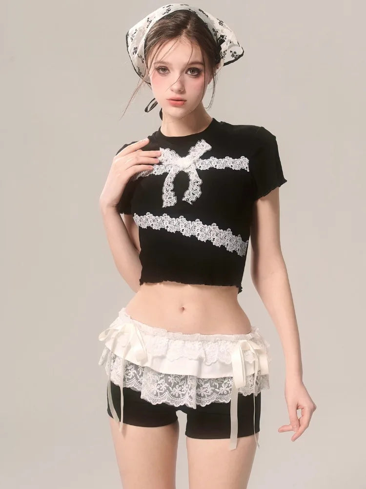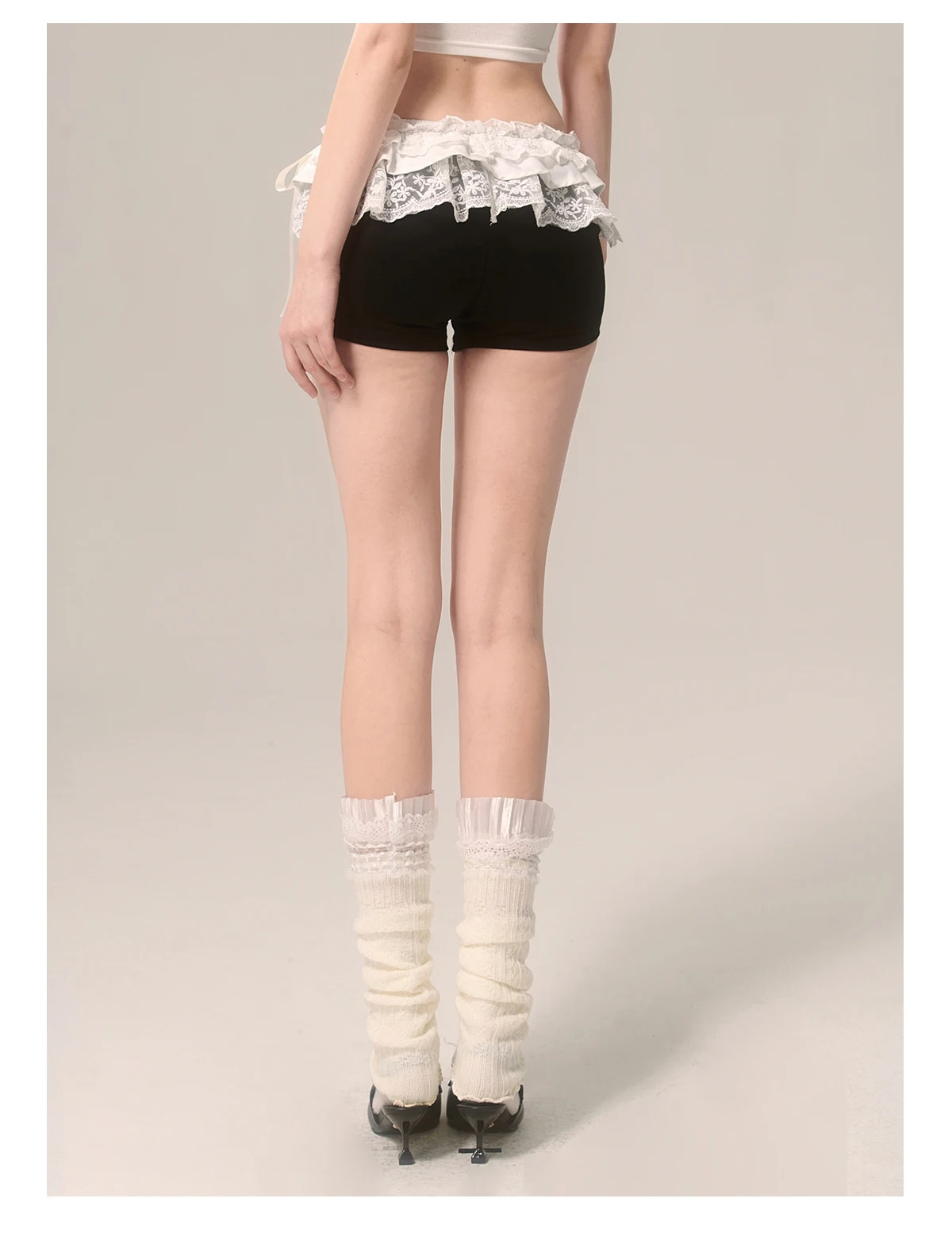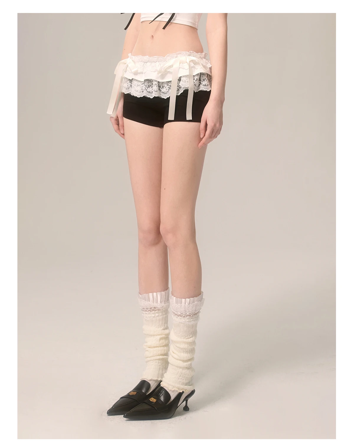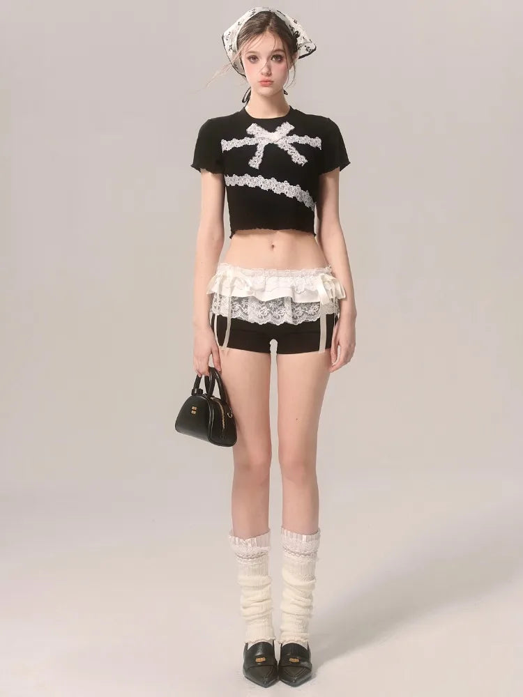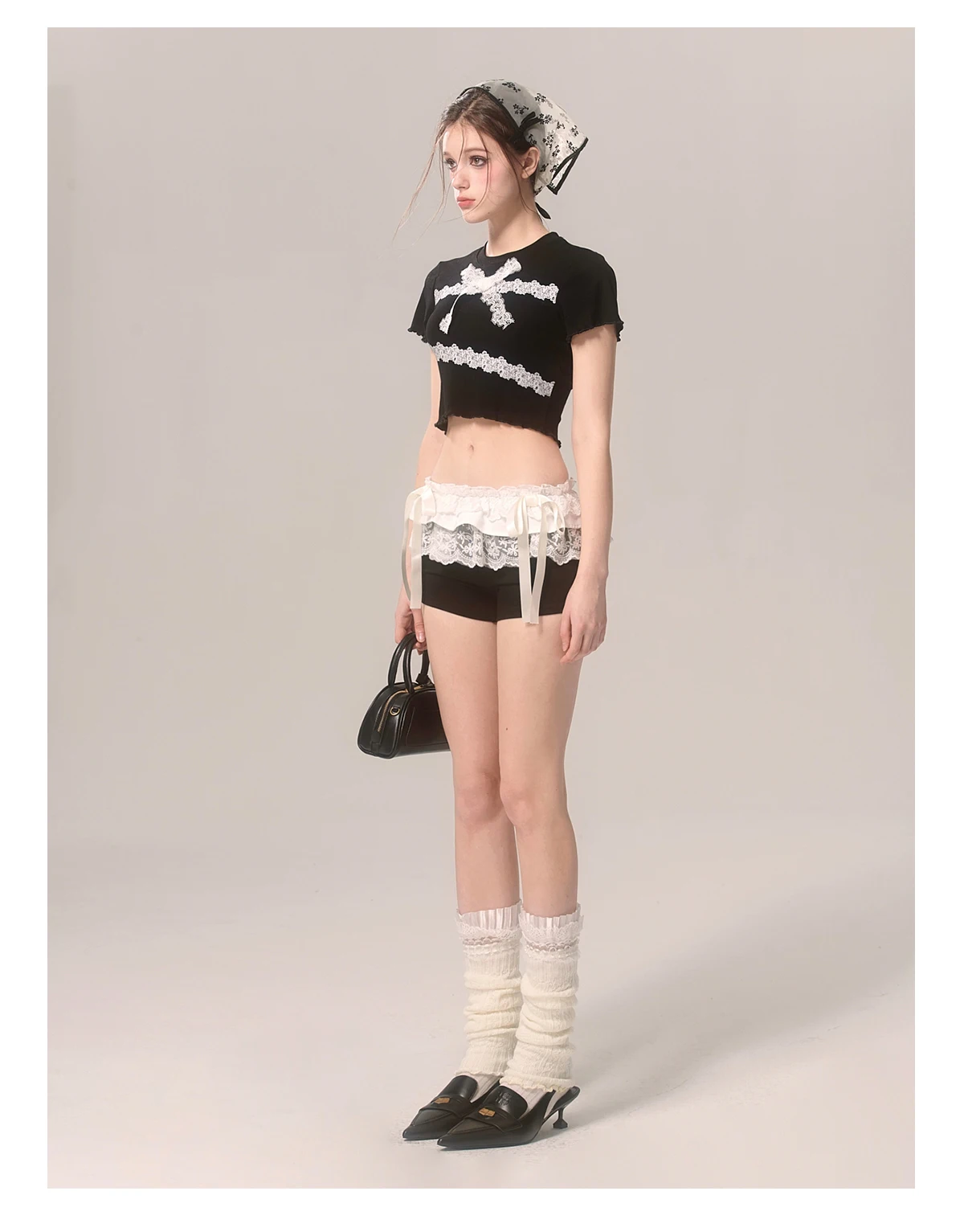 KYLETHOMASW - Lace Patchwork Black Shorts Women Bow Elastic Waist Sexy Girl Tight Short Pants Summer Ballet Style Chic Kawaii Clothes