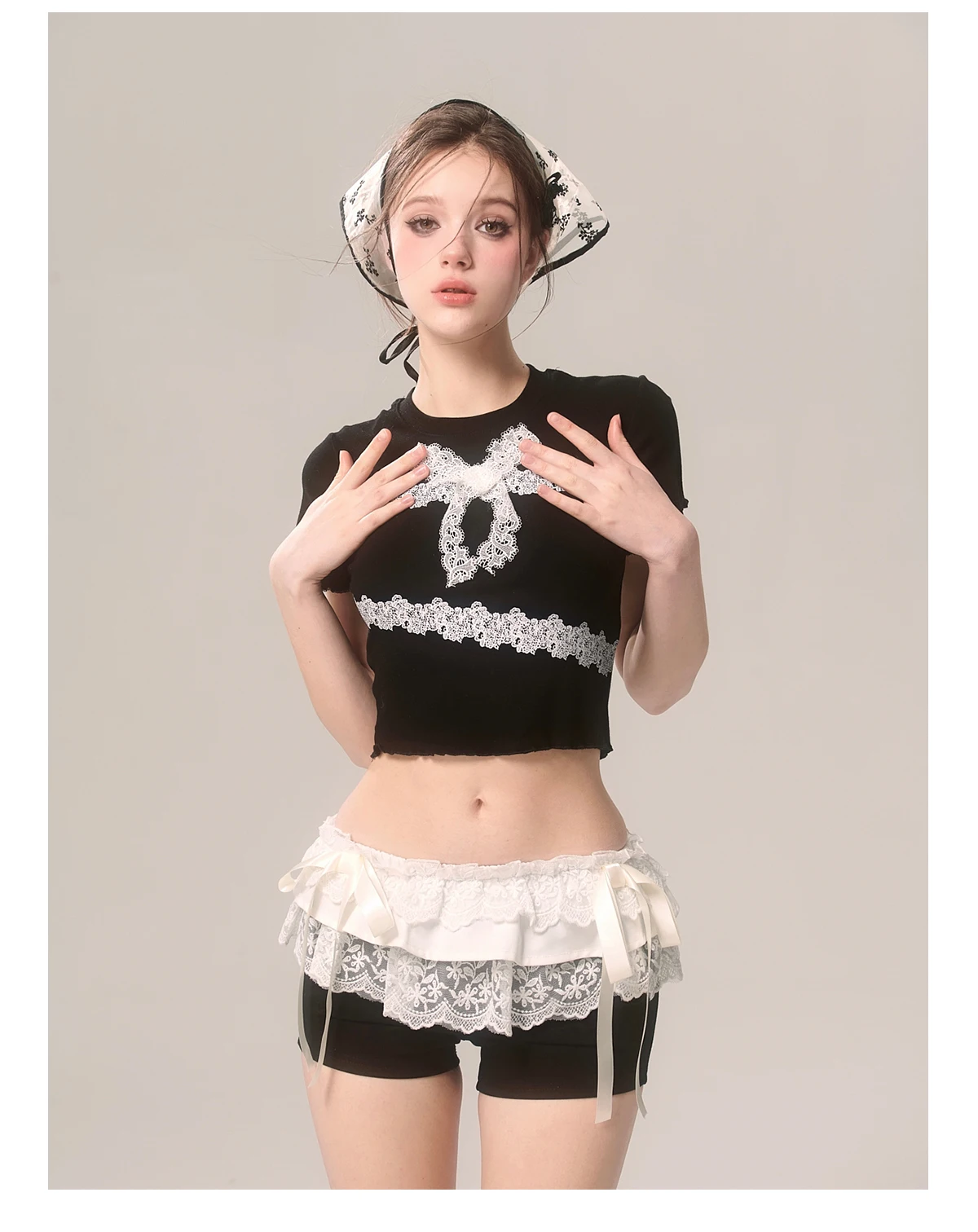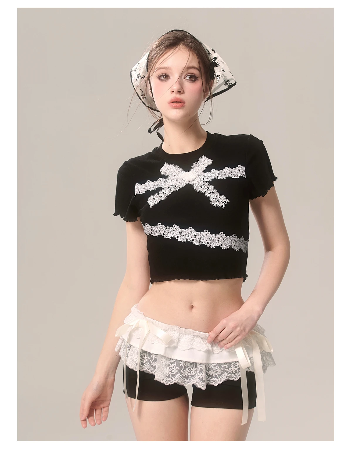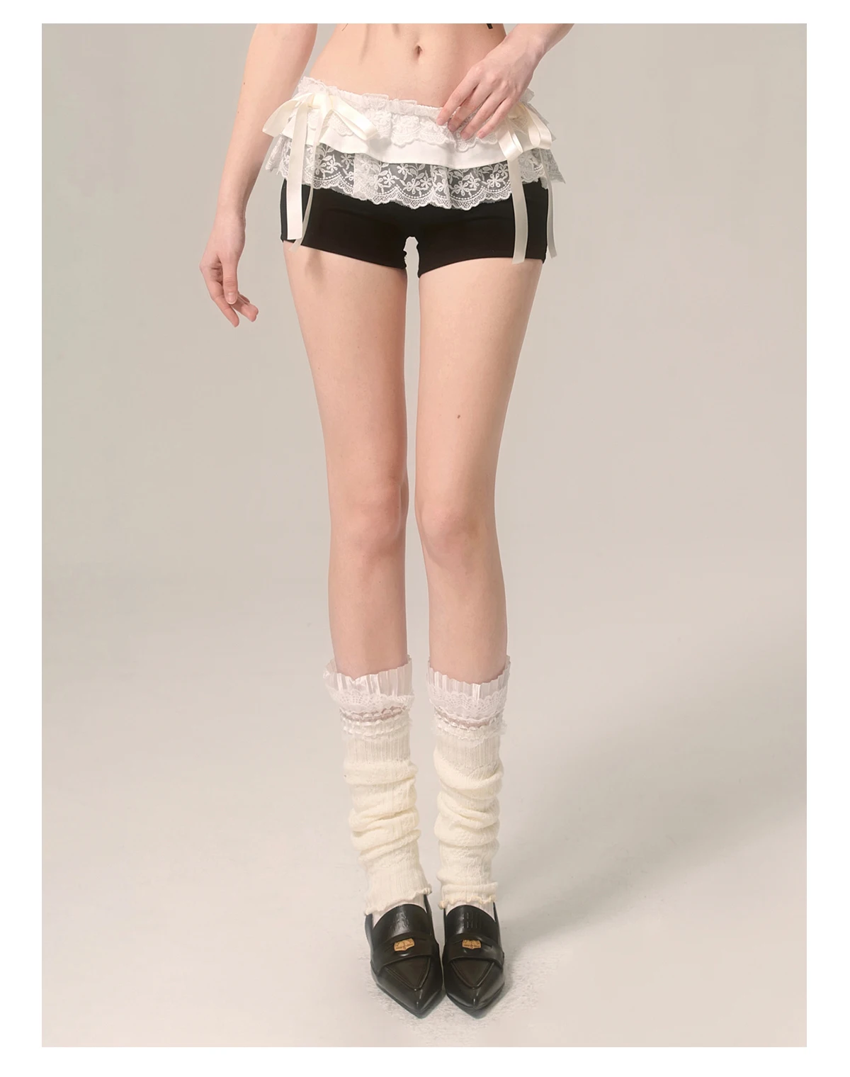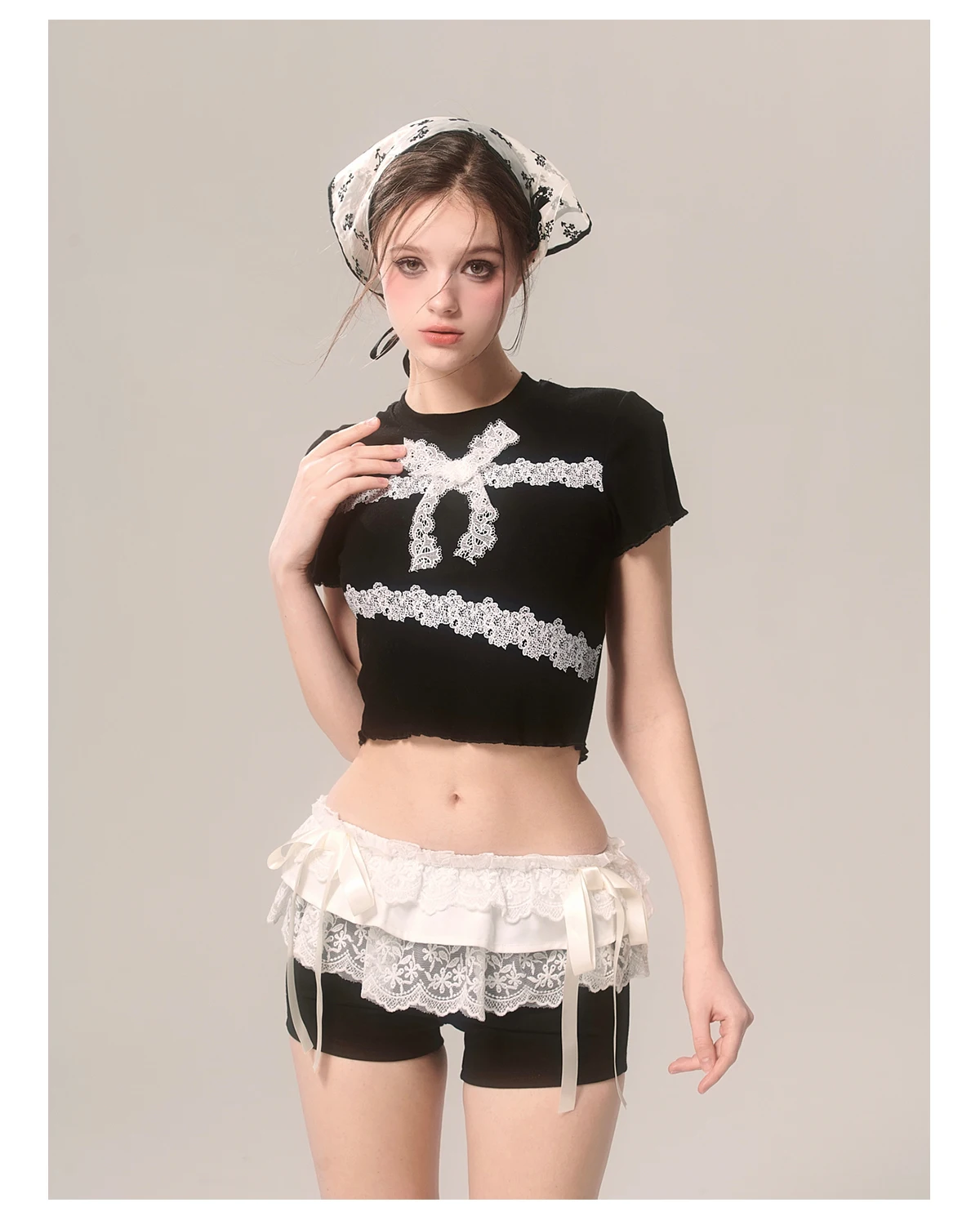KYLETHOMASW - Lace Patchwork Black Shorts Women Bow Elastic Waist Sexy Girl Tight Short Pants Summer Ballet Style Chic Kawaii Clothes