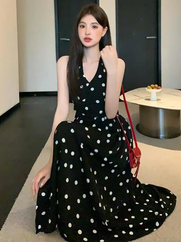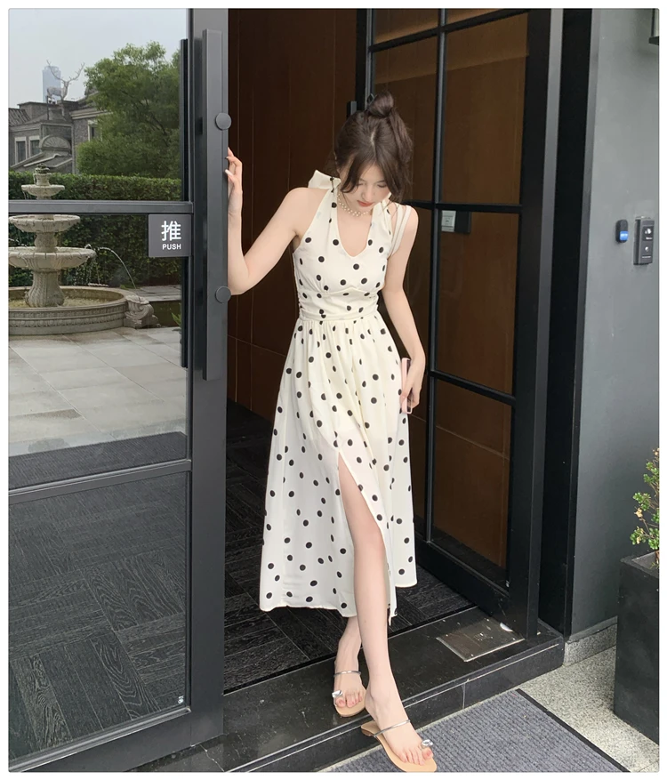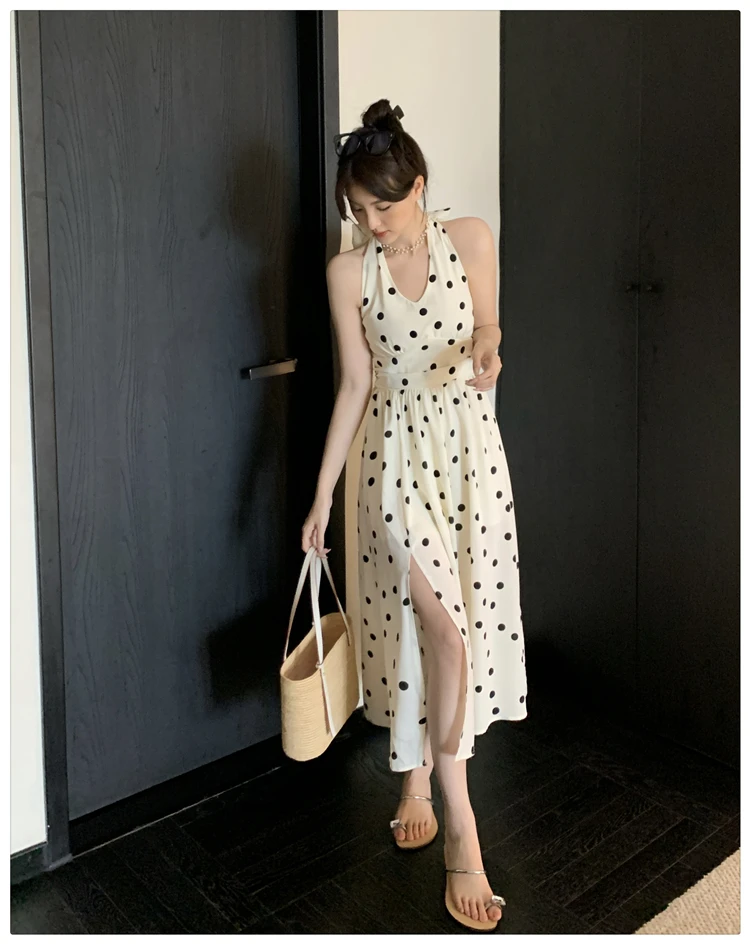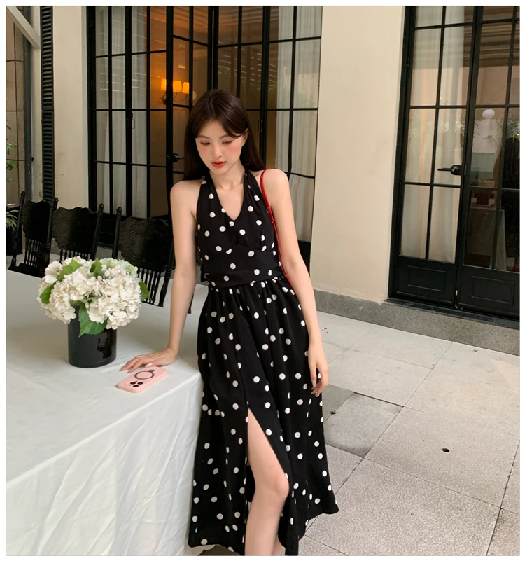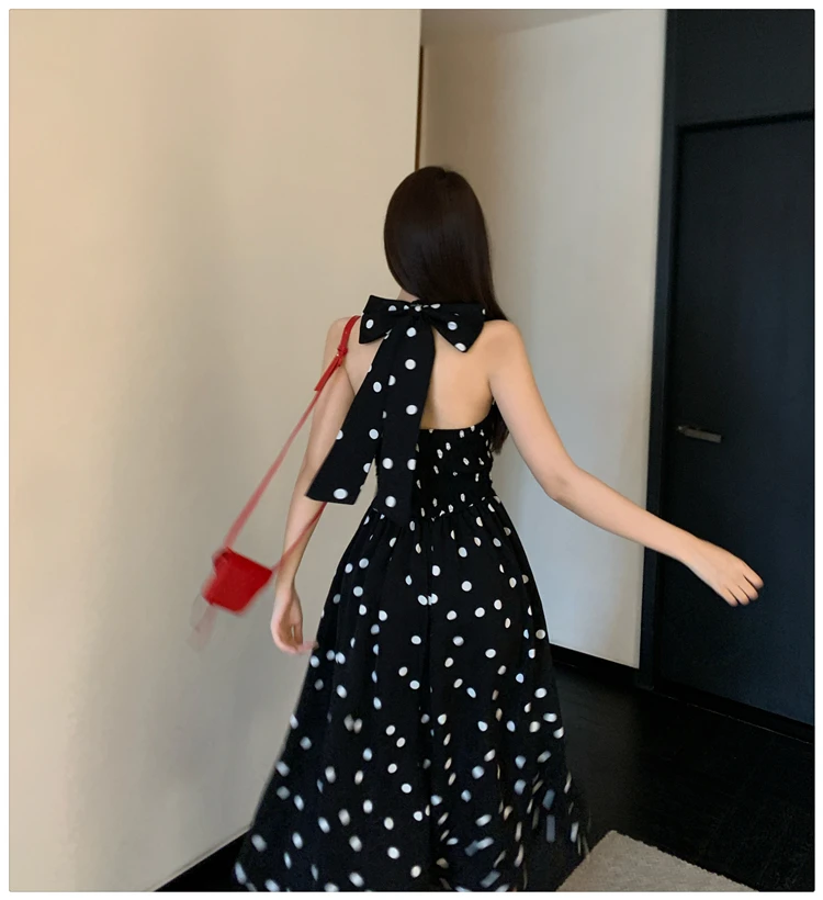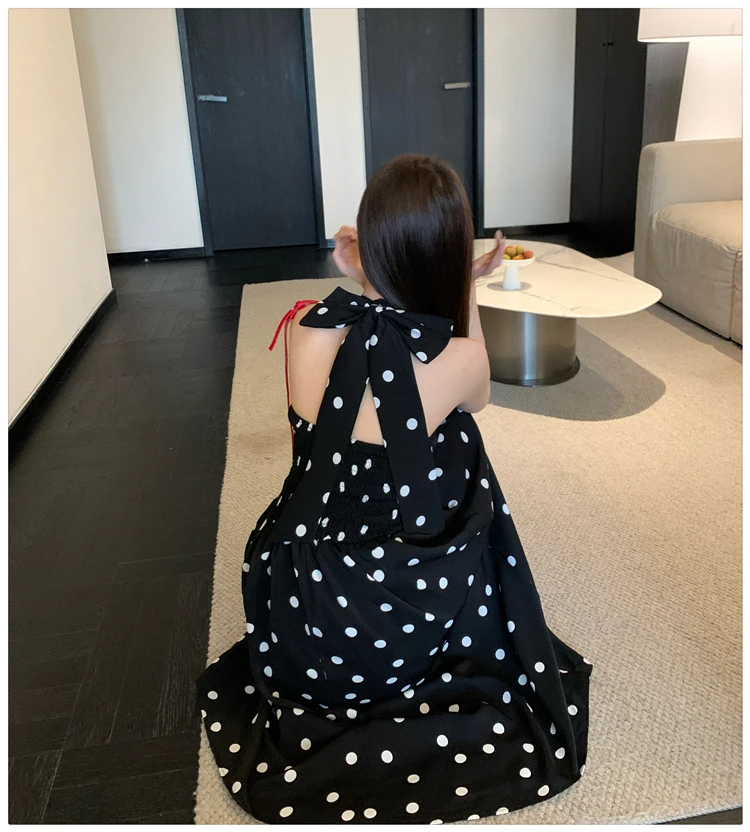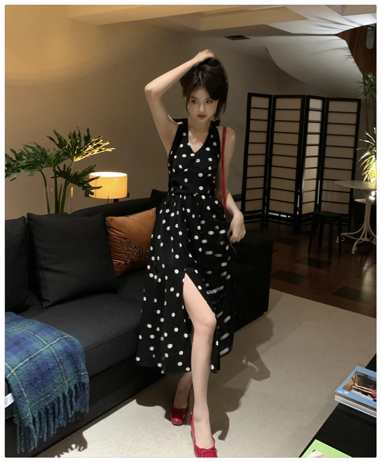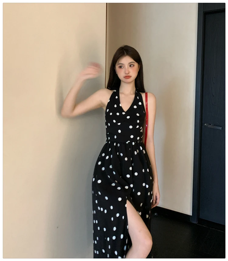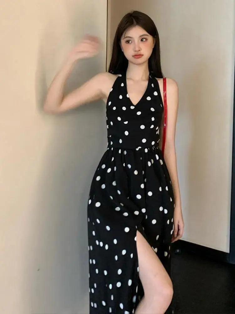 KYLETHOMASW - Ladies Black Dot Sexy Club Pleated Split Long Dresses Sleeveless Halter V Neck Bow Lace-up Dress Summer Backless Party Sundress