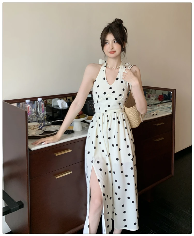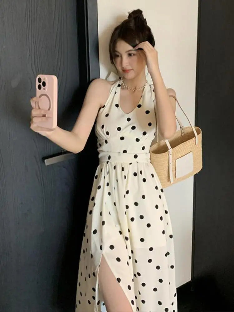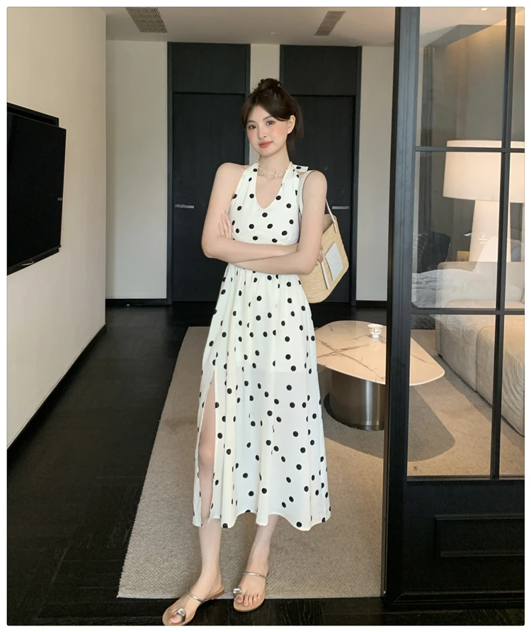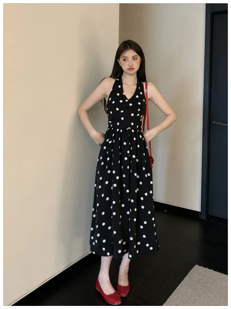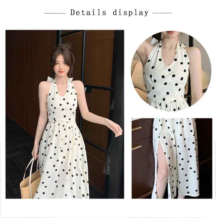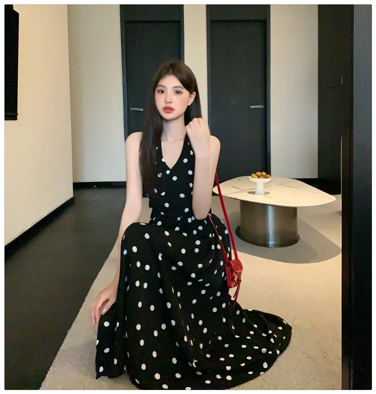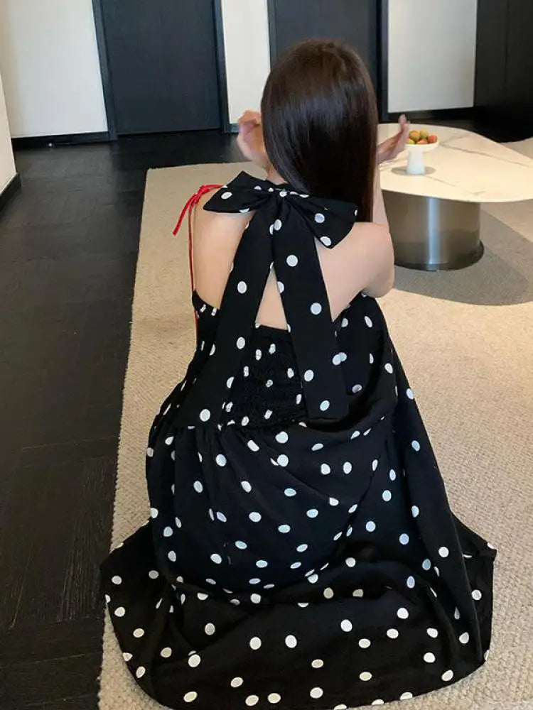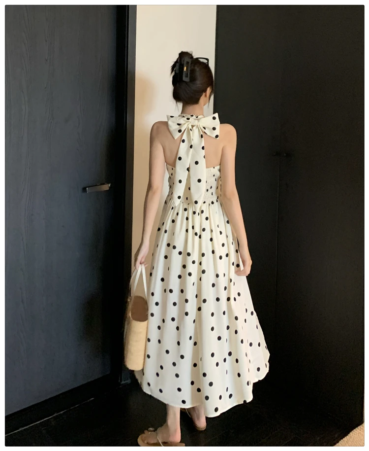 KYLETHOMASW - Ladies Black Dot Sexy Club Pleated Split Long Dresses Sleeveless Halter V Neck Bow Lace-up Dress Summer Backless Party Sundress