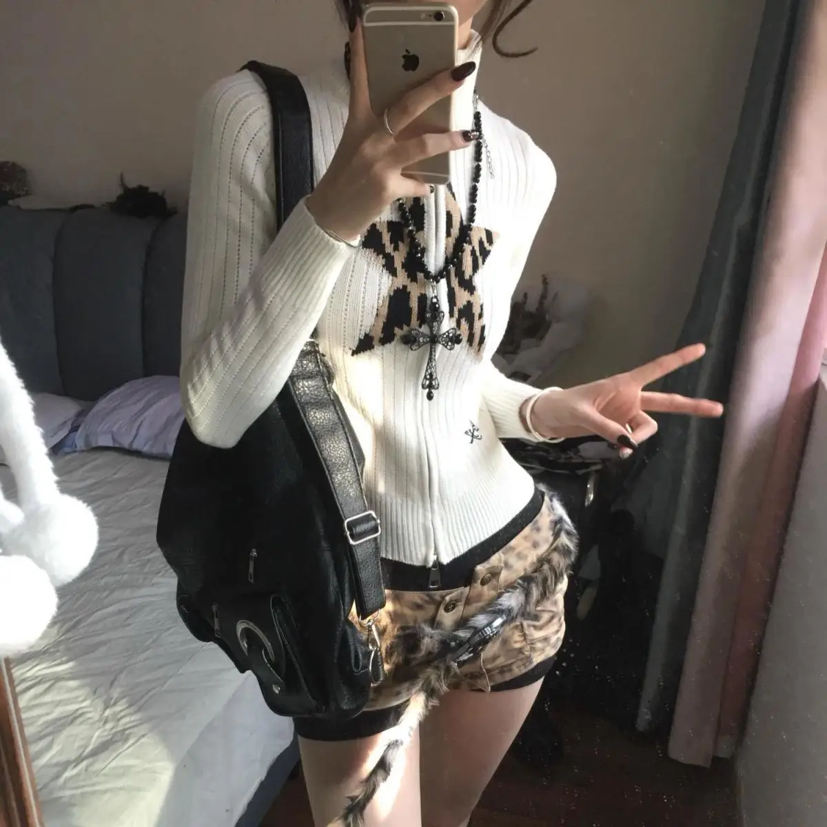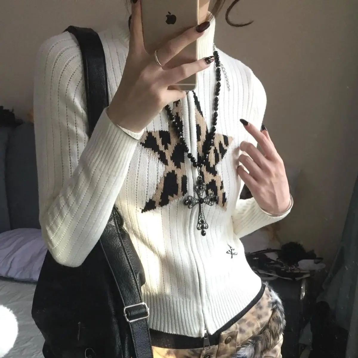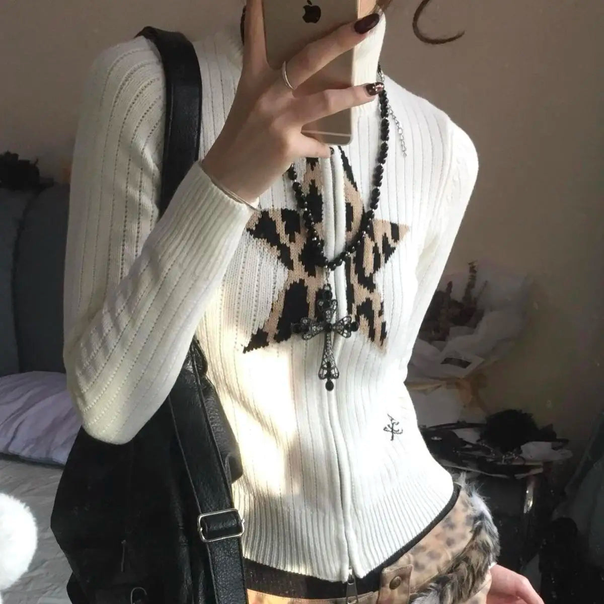 KYLETHOMASW - New Fashion Leopard Star Jacquard High Collar Zipper Sweater Coat Women Top American Retro Beige Slim Knitted Cardigan Women Top
