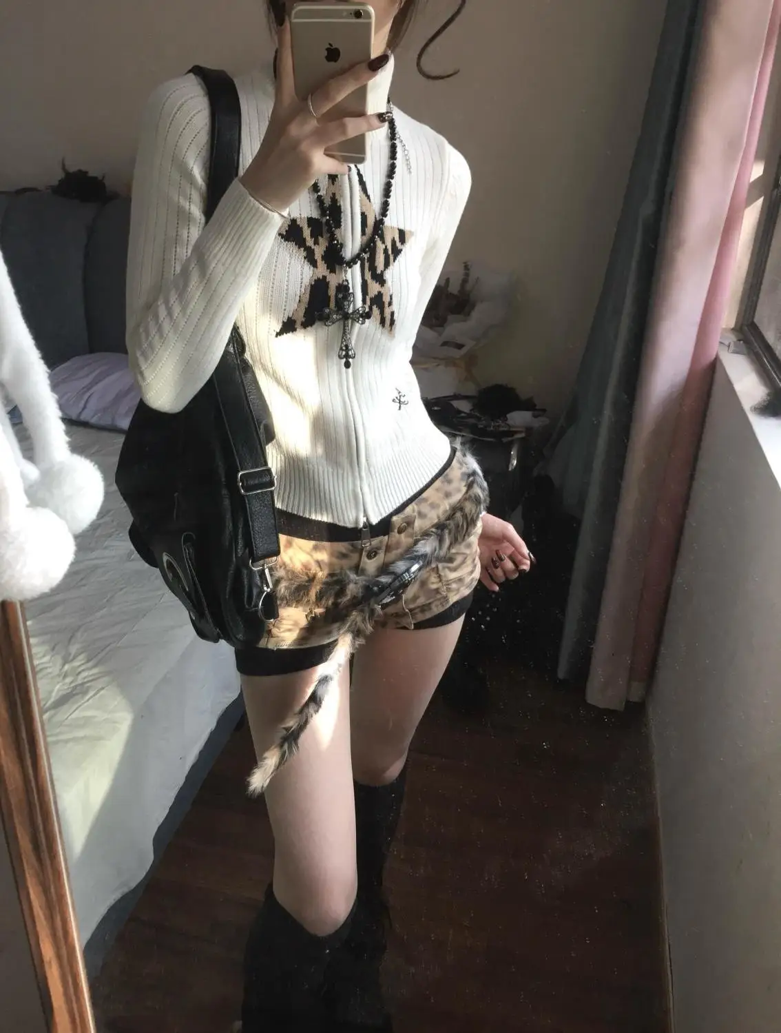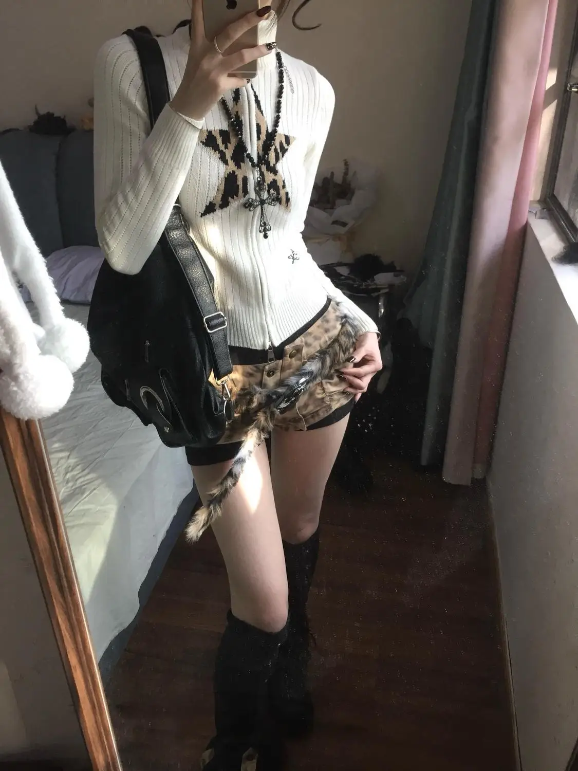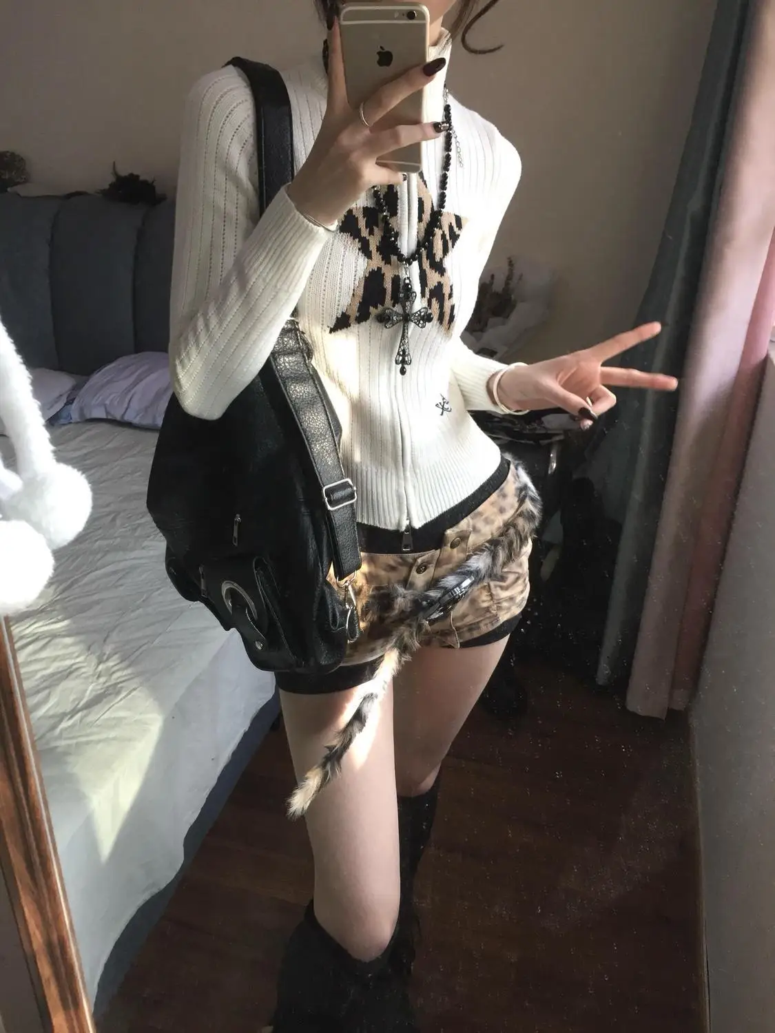 KYLETHOMASW - New Fashion Leopard Star Jacquard High Collar Zipper Sweater Coat Women Top American Retro Beige Slim Knitted Cardigan Women Top
