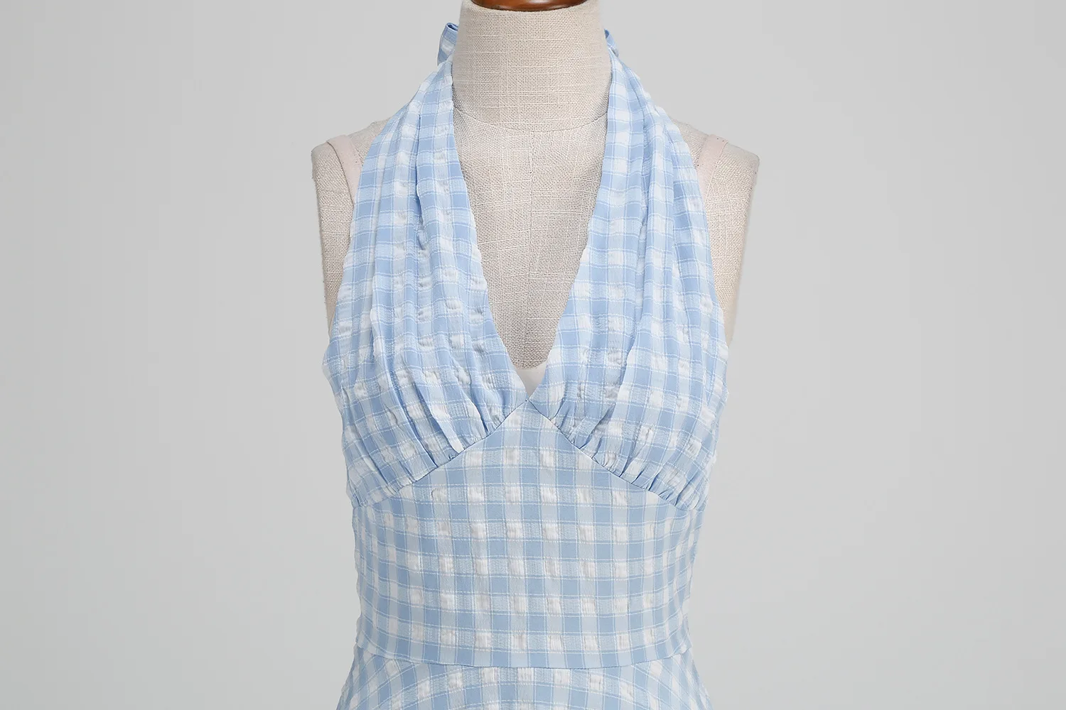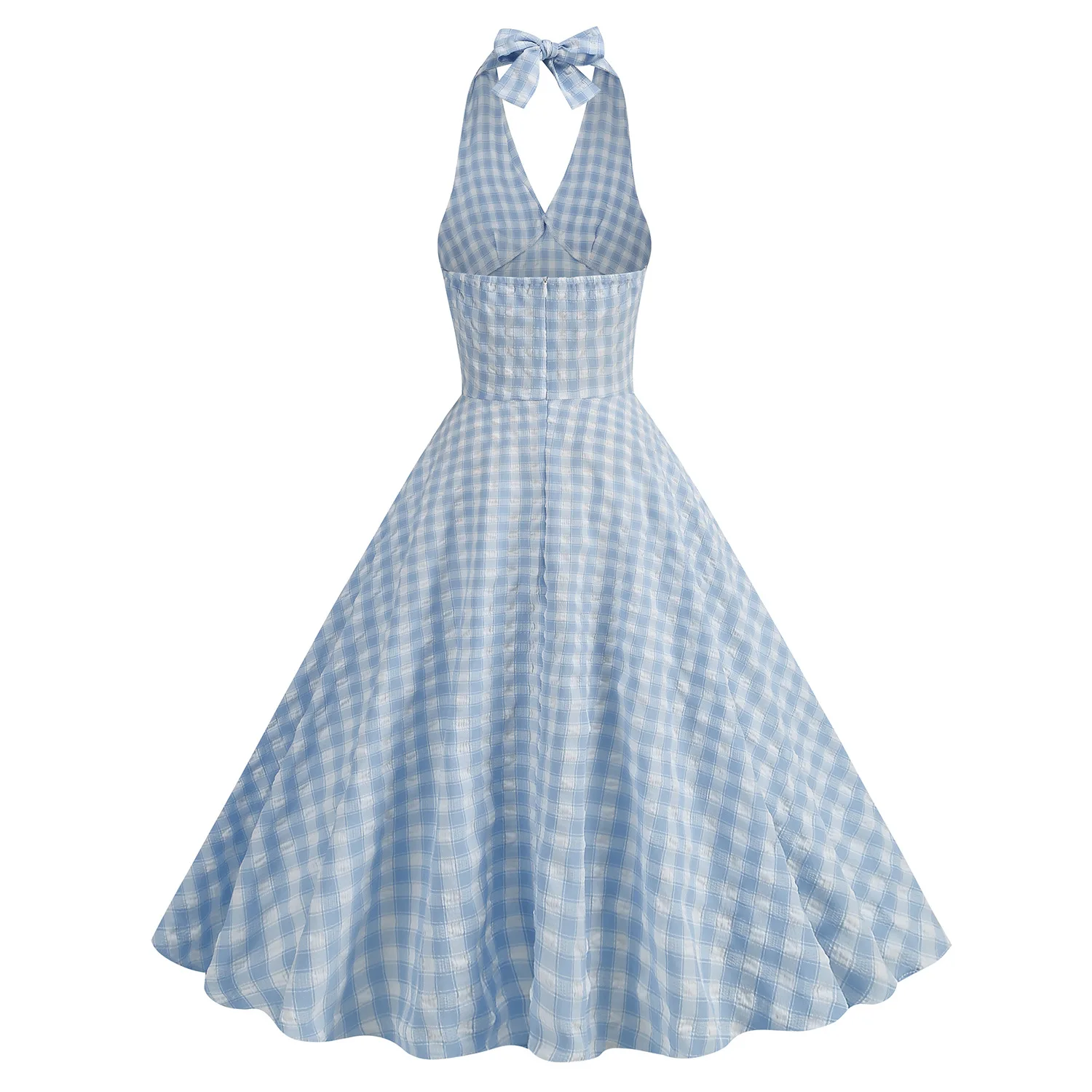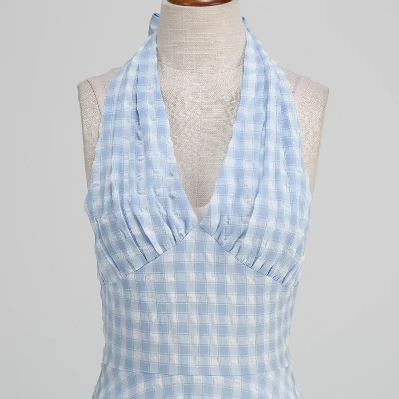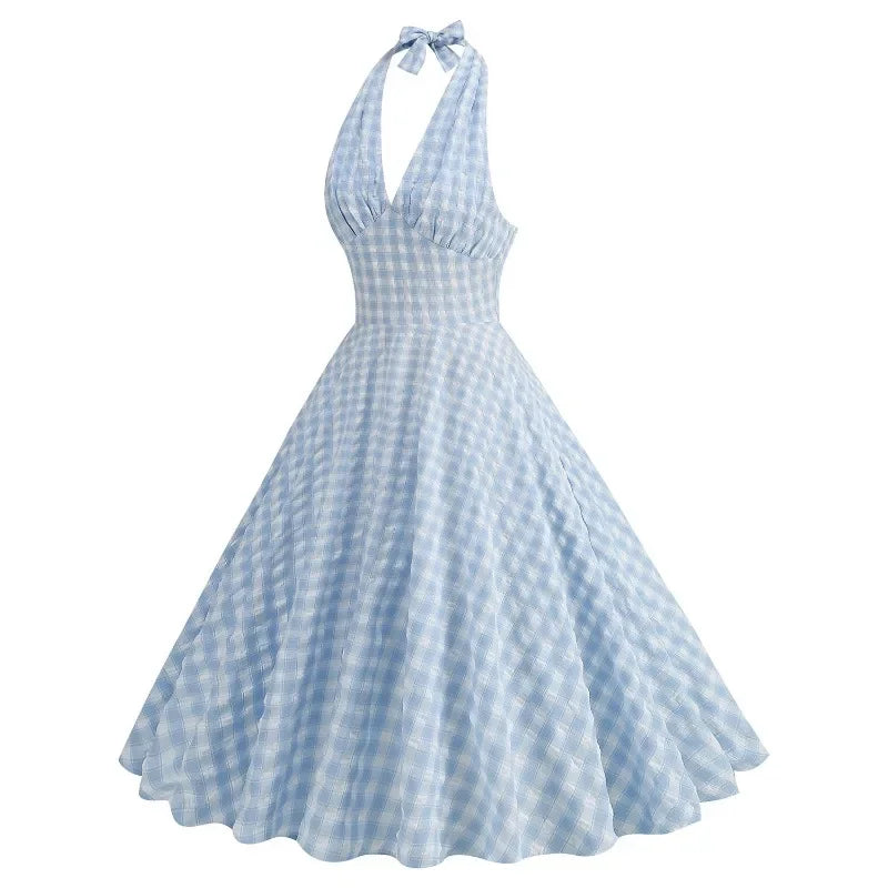 KYLETHOMASW - New Hepburn Vintage Blue and White Plaid Holiday Women Summer Dresses Sexy Halter High Waist Fit and Flare Rockabilly Dress