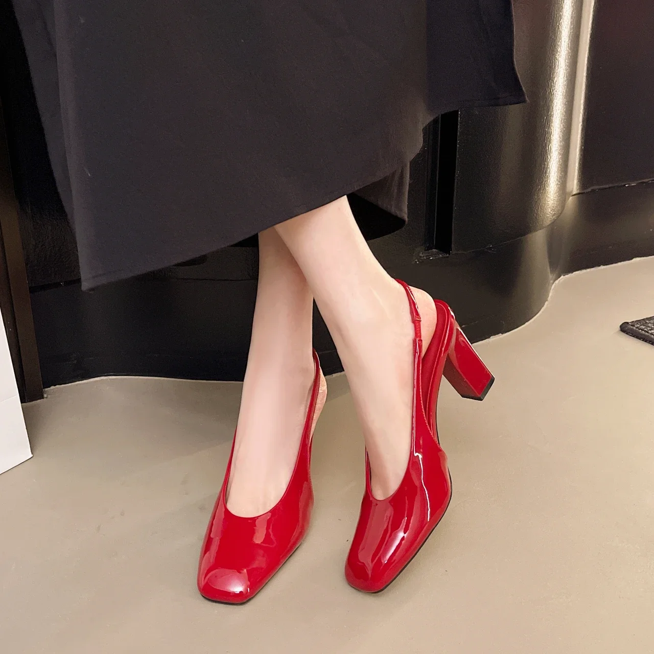 KYLETHOMASW - Patent leather sexy high heels women's square toe open-heeled dress shoes women's fashion elegant party dress shoes large size