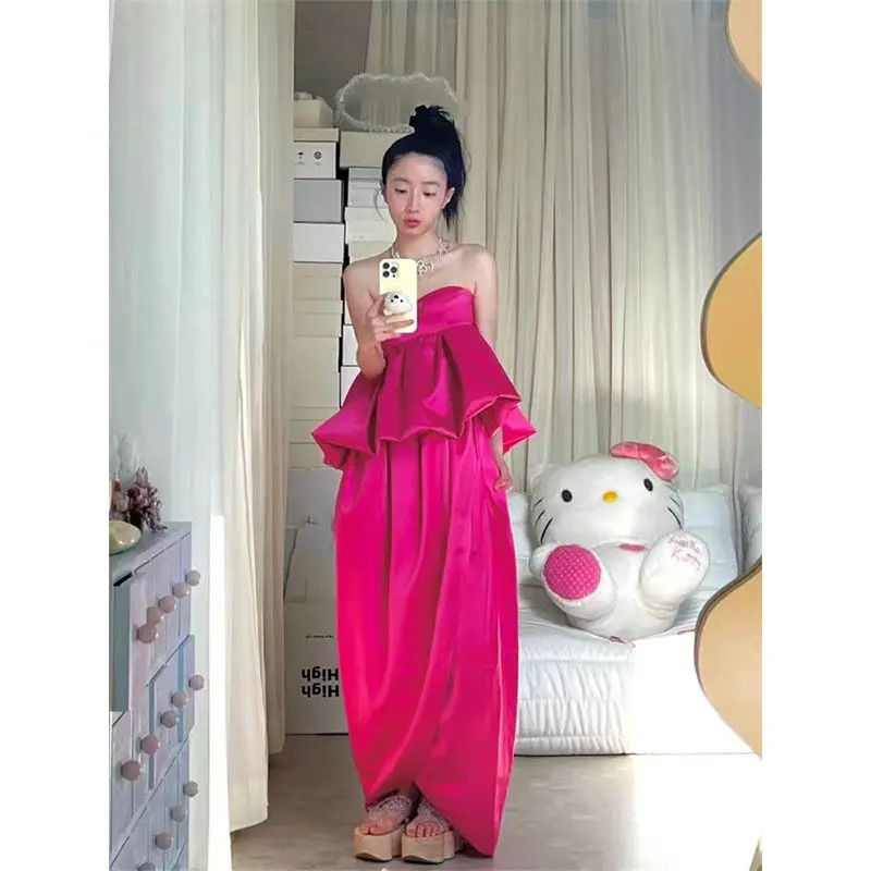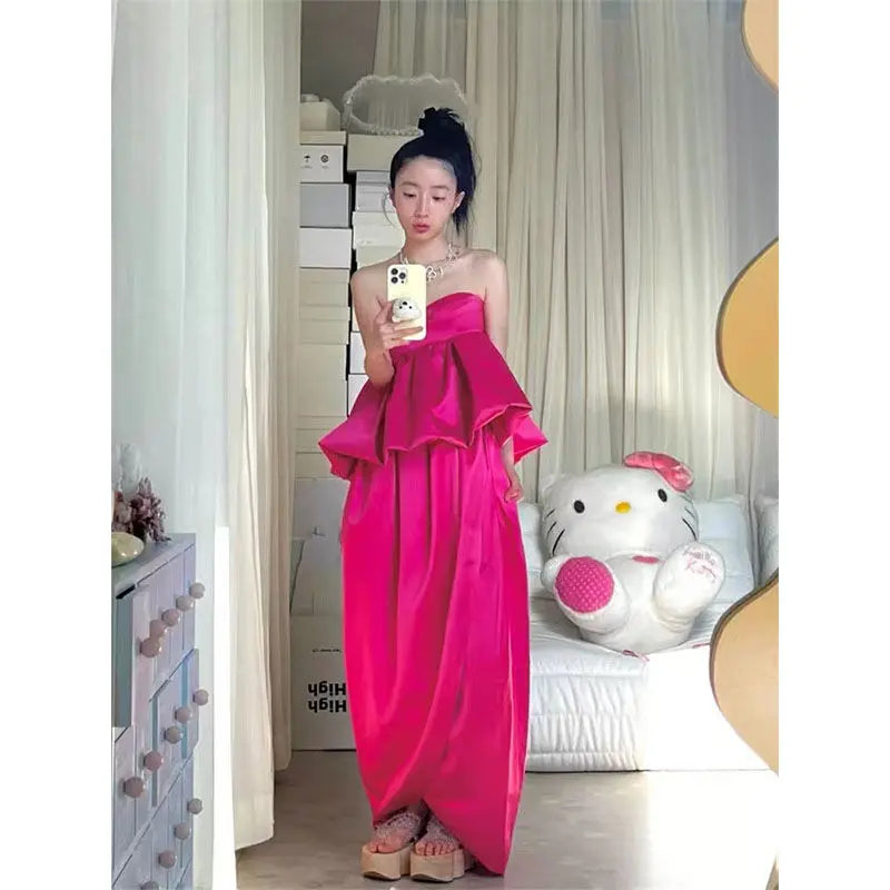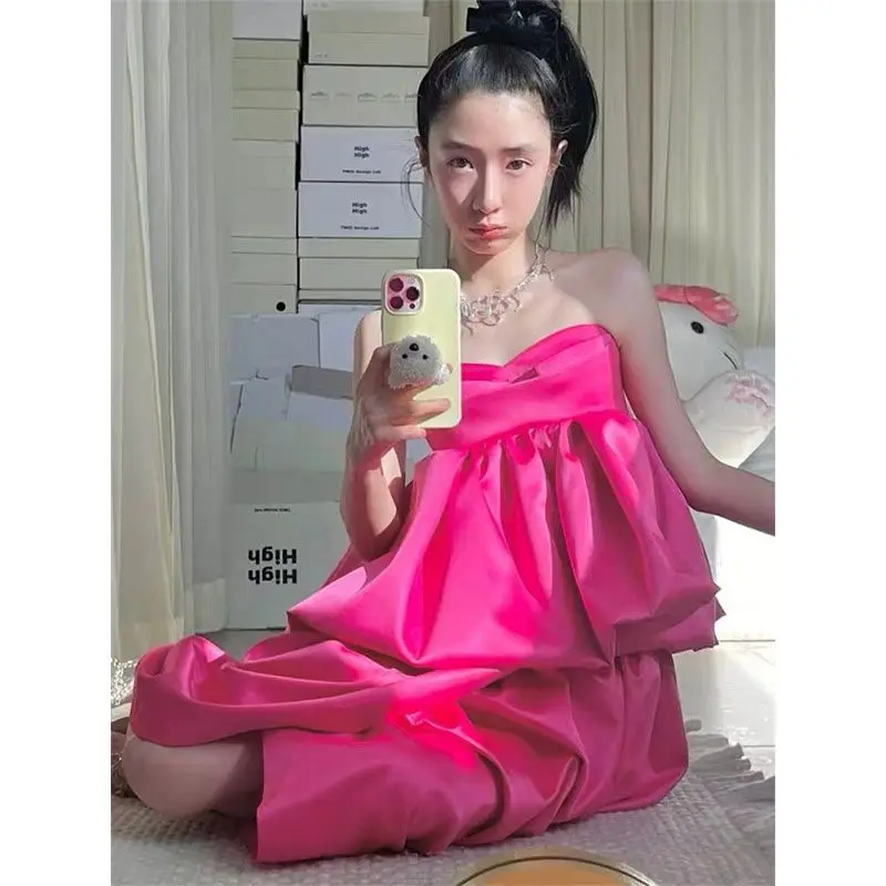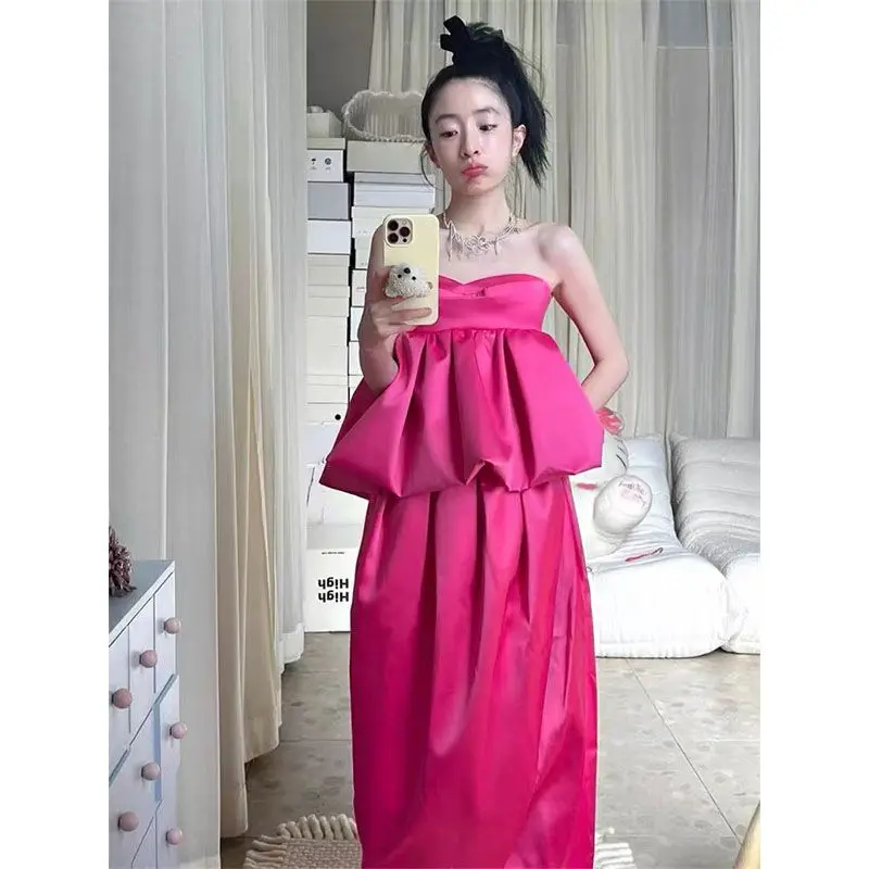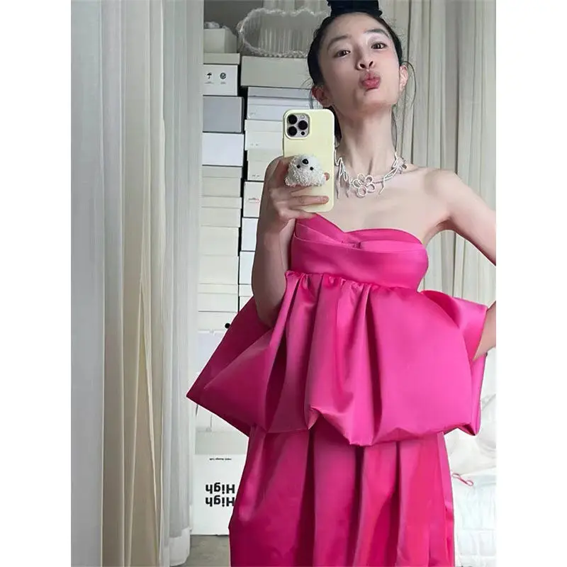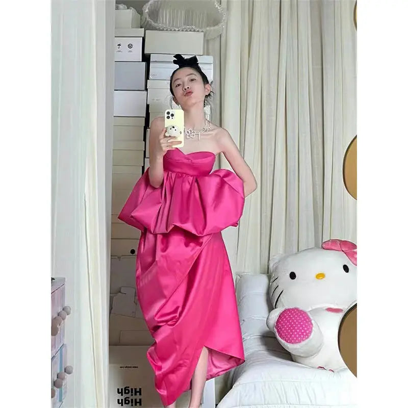 KYLETHOMASW - Pink Strapless Dress for Women New Chic High-end Temperament Backless Off Shoulder Sexy Slimming A-line Midi Evening Dress