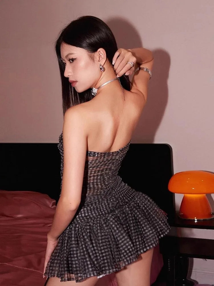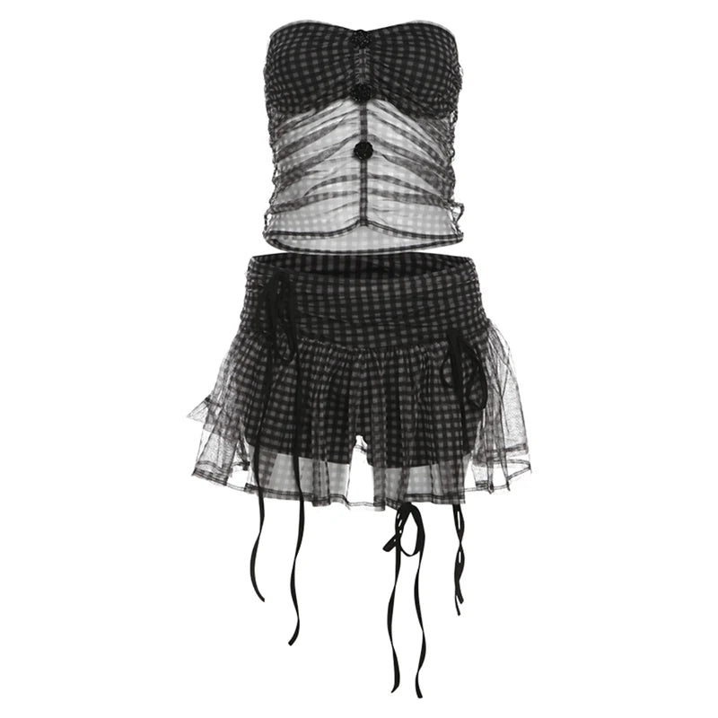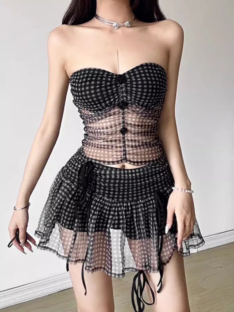 KYLETHOMASW - Plaid Strapless Perspective Mesh Crop Tops Black Sexy Girl A-line Mini Skirt Chic Two Piece Sets Womens Outifits Summer