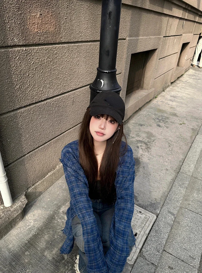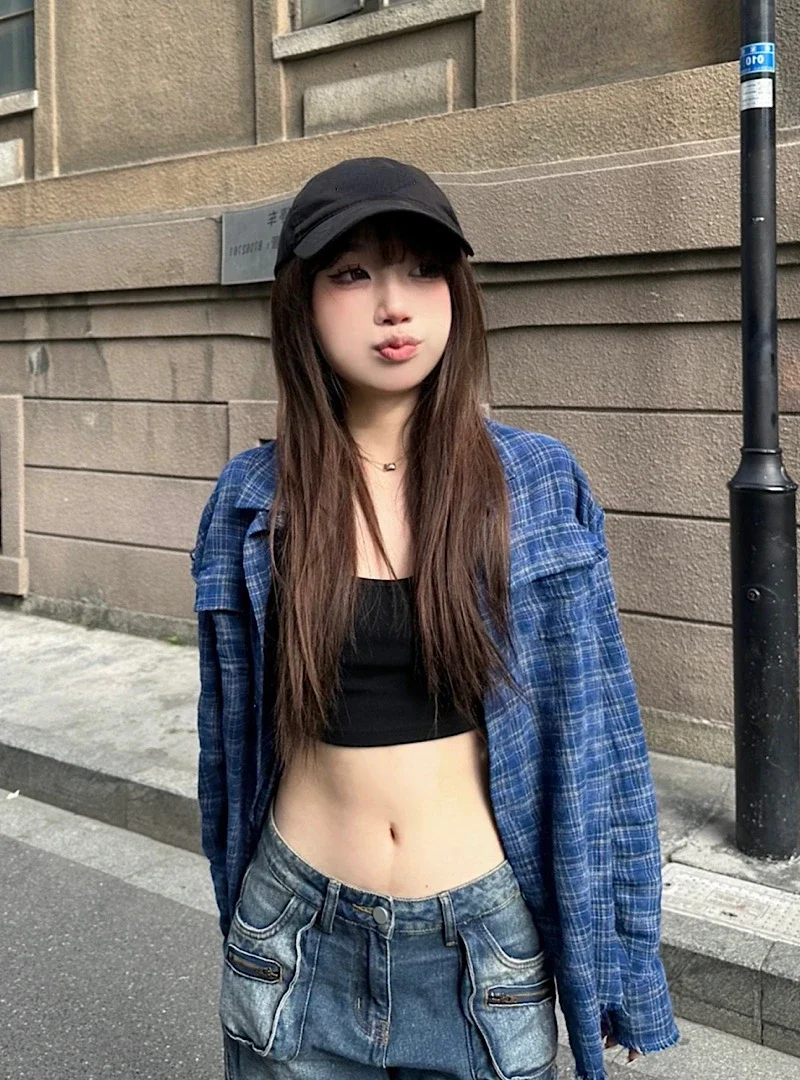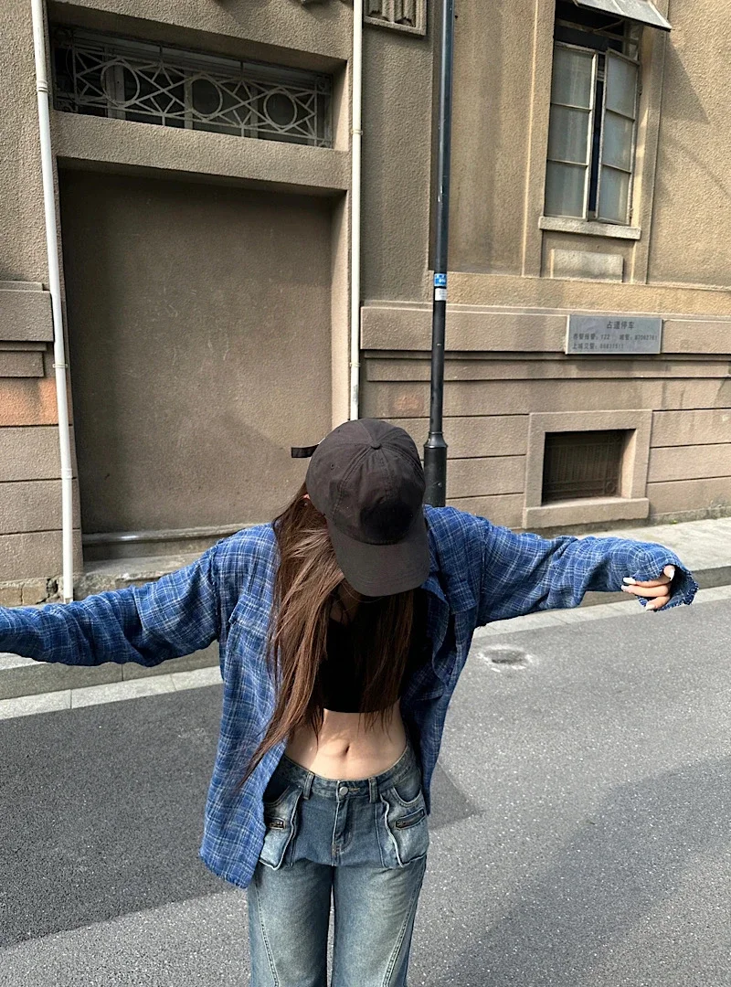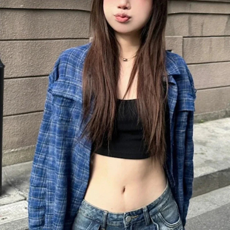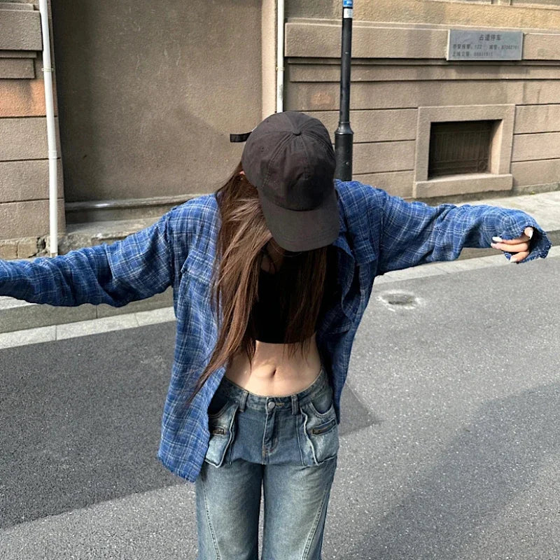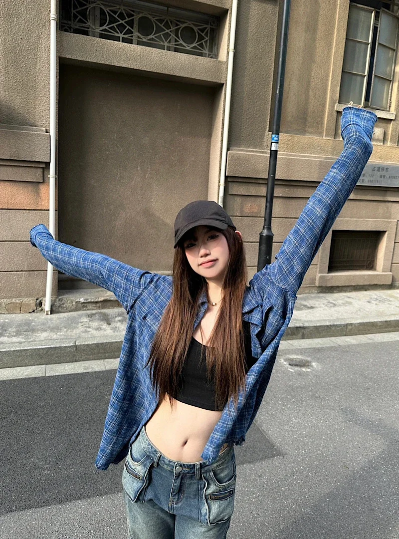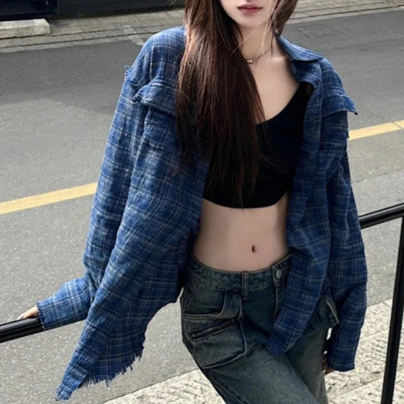 Kylethomasw Polo Collar Contrast Color Plaid Loose Casual Long-sleeved Shirt Women 2024 Summer New High Street Fashion Frayed All Match Tops