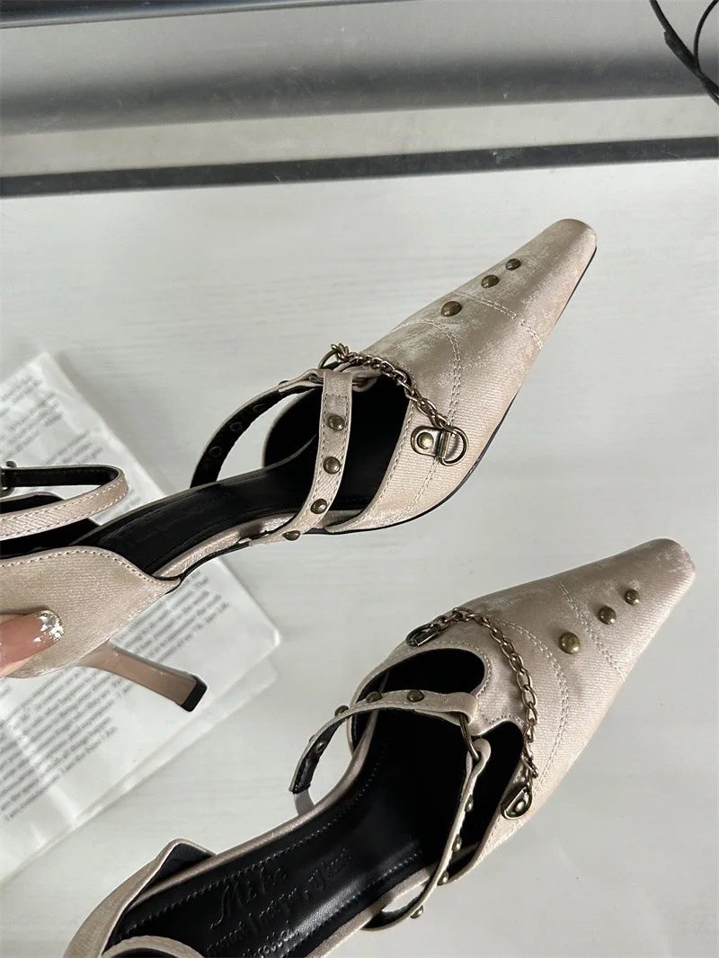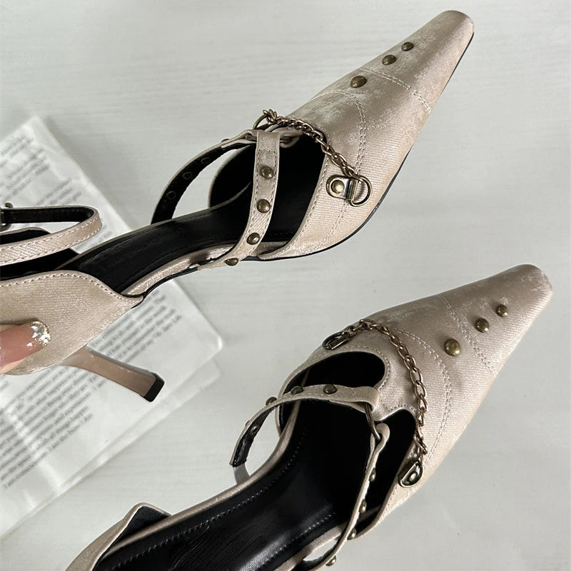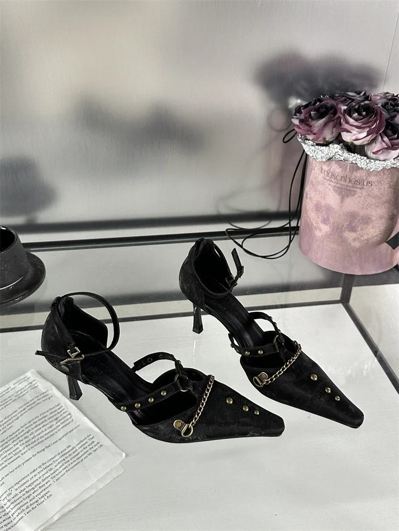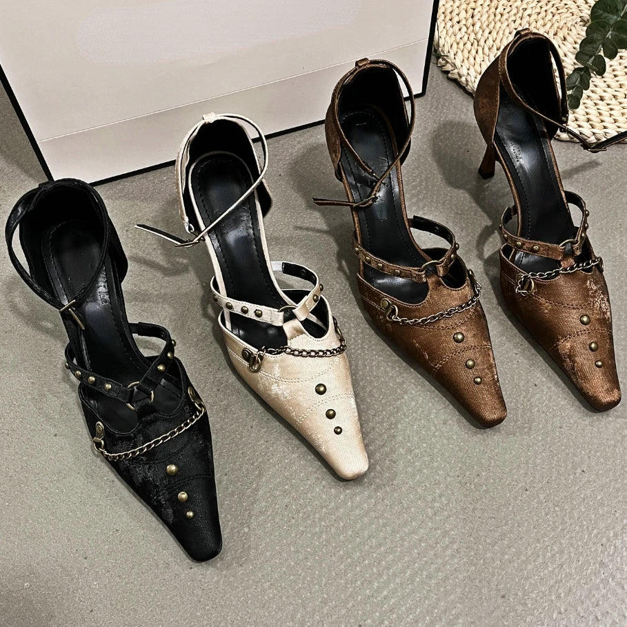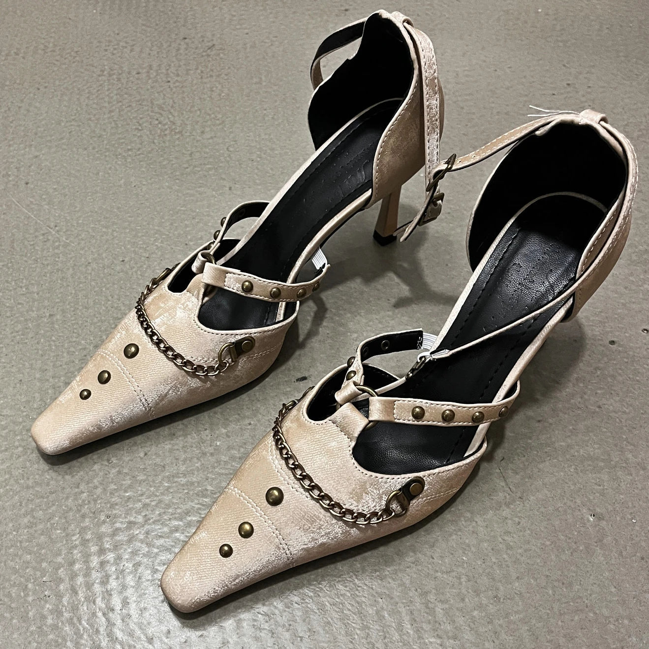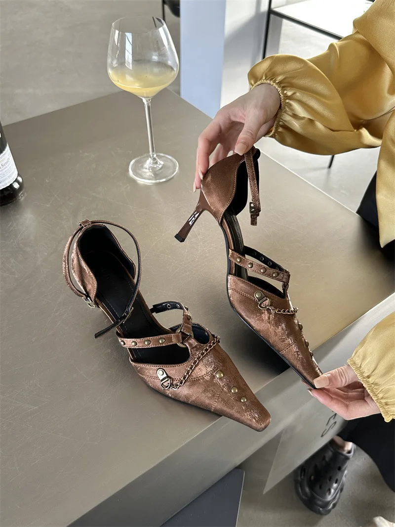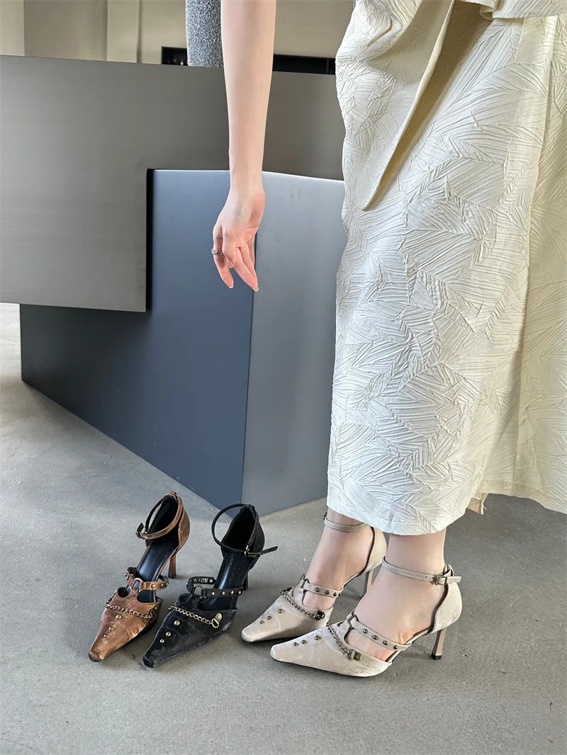 KYLETHOMASW - Retro Rivets Metal Chain High Heels Women Sexy Thin Heel Party Dress Shoes Elegant Office Shoes Pointed Toe Pump Sandals Women