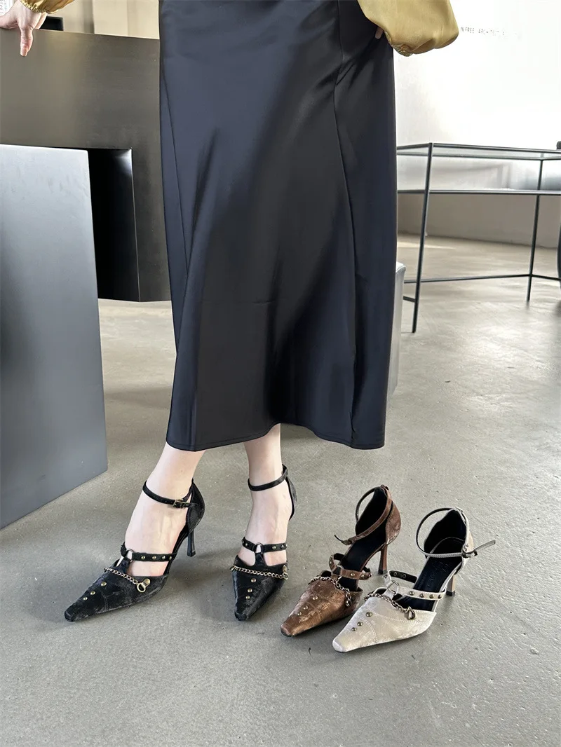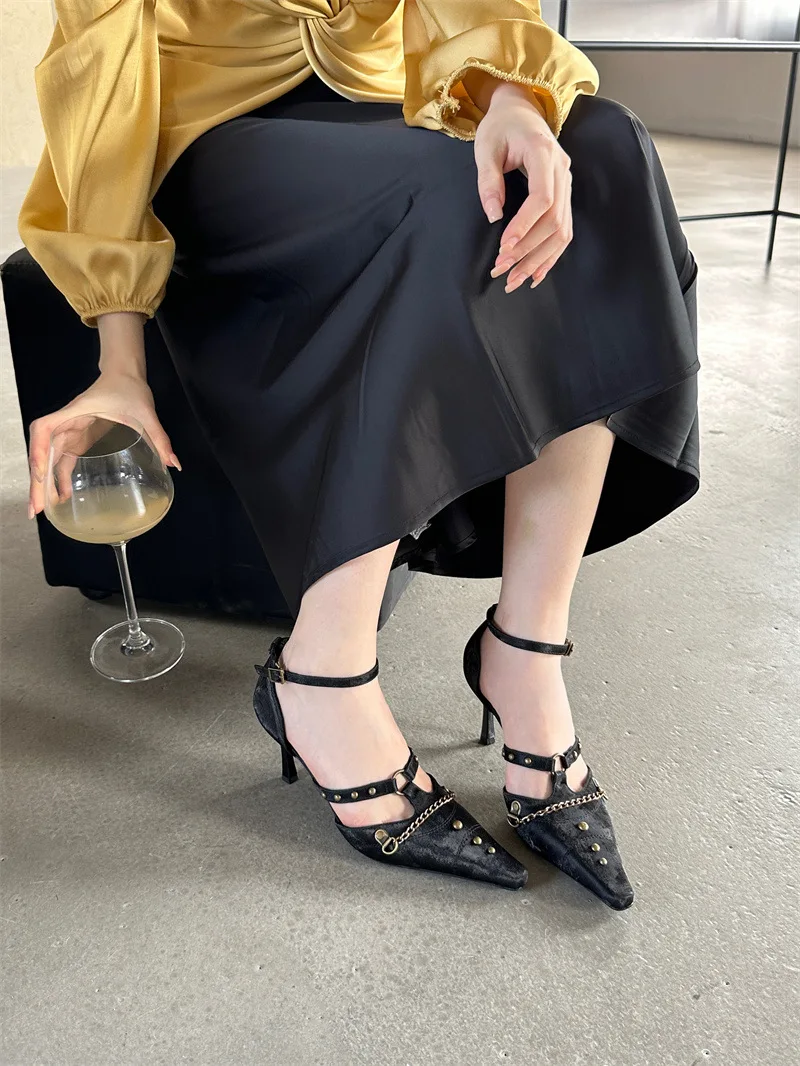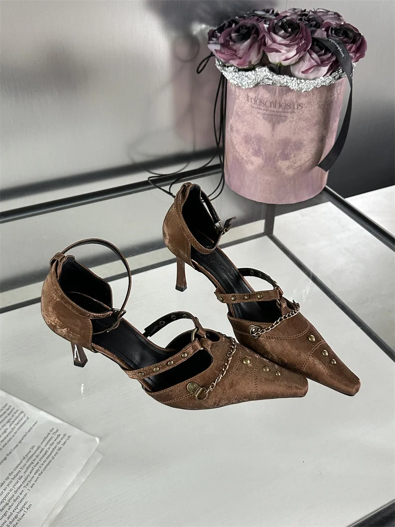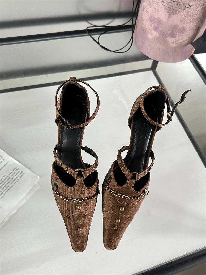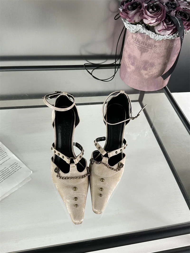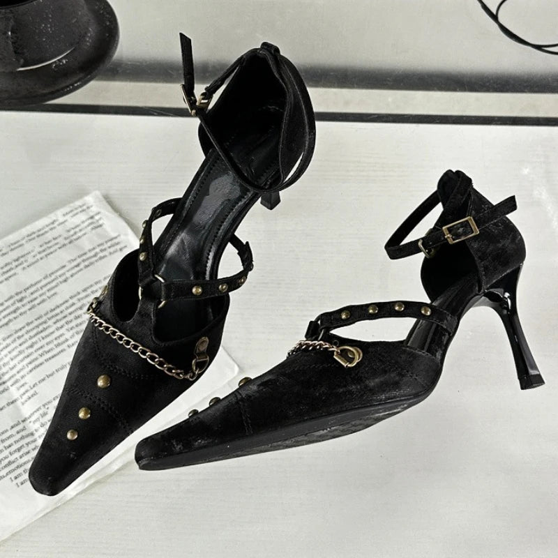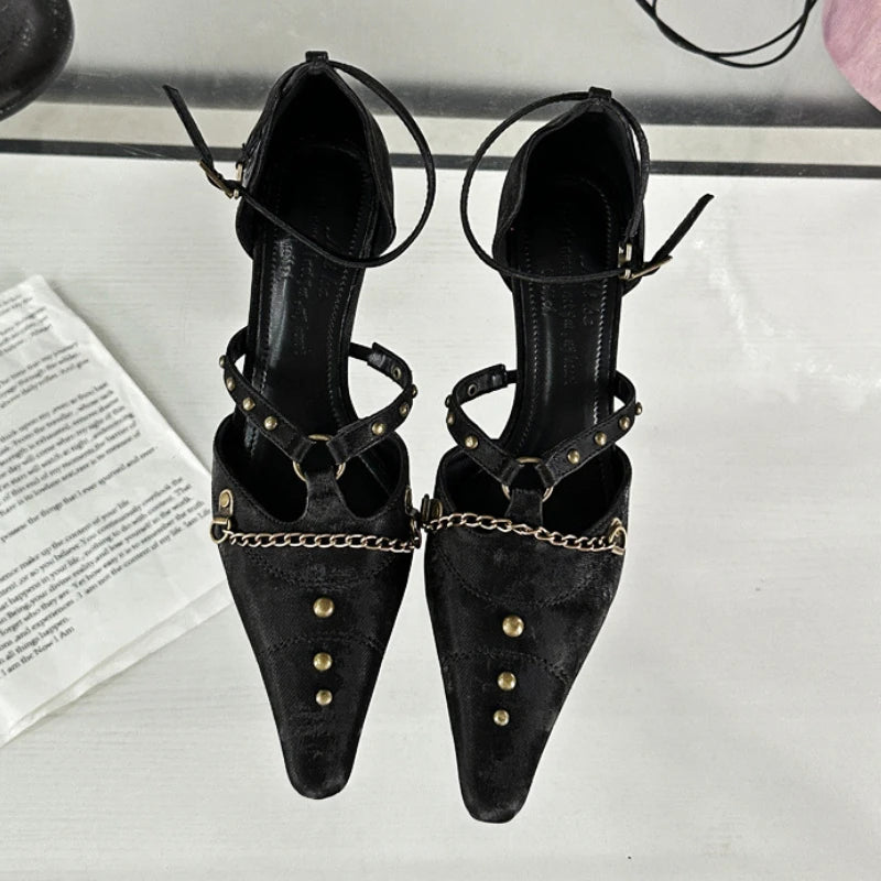 KYLETHOMASW - Retro Rivets Metal Chain High Heels Women Sexy Thin Heel Party Dress Shoes Elegant Office Shoes Pointed Toe Pump Sandals Women