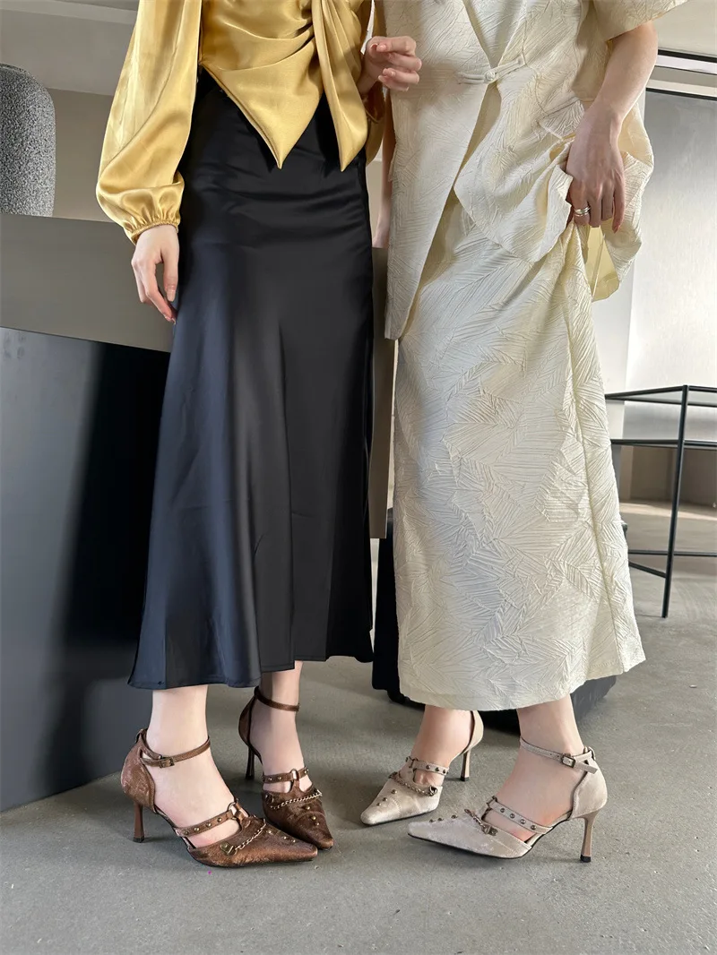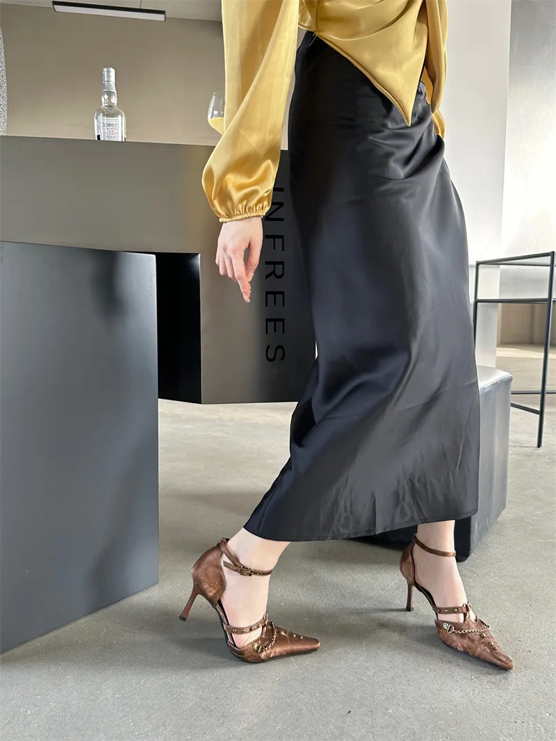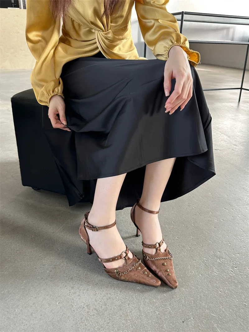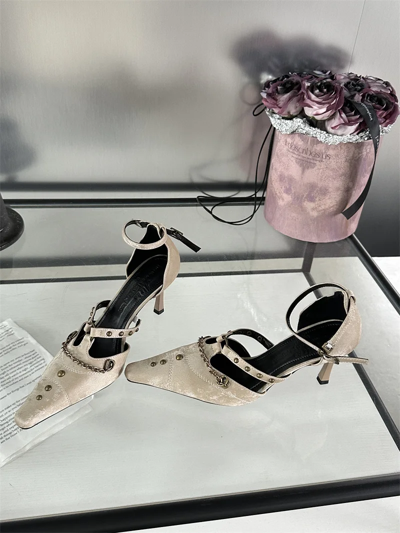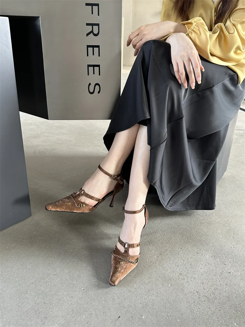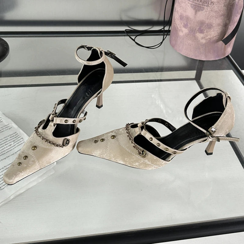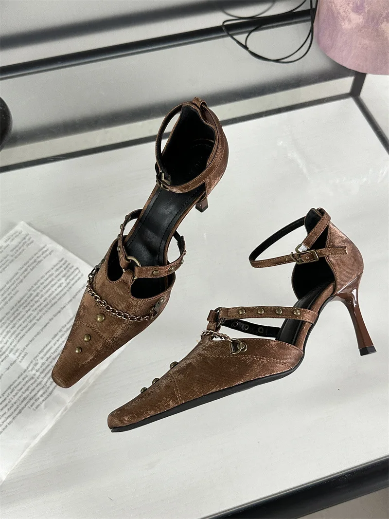 KYLETHOMASW - Retro Rivets Metal Chain High Heels Women Sexy Thin Heel Party Dress Shoes Elegant Office Shoes Pointed Toe Pump Sandals Women
