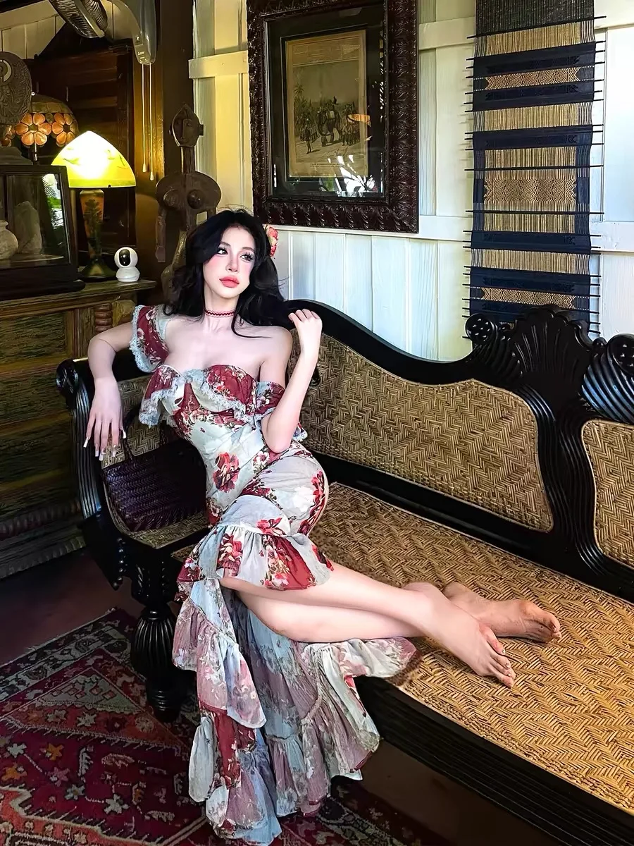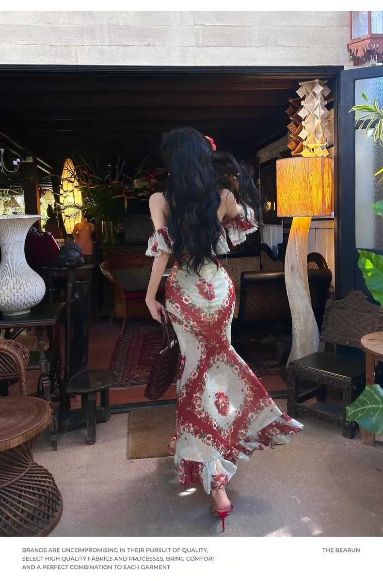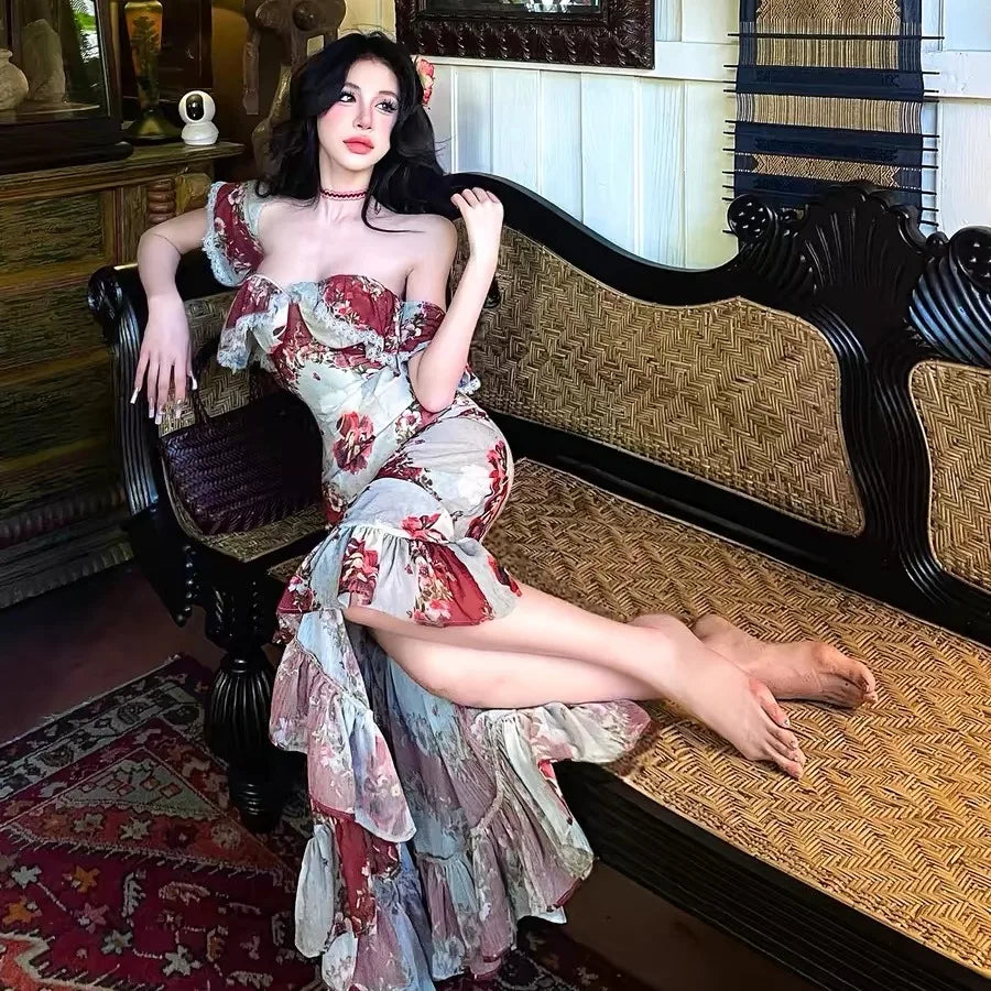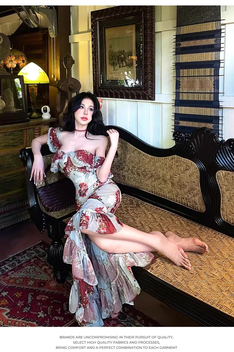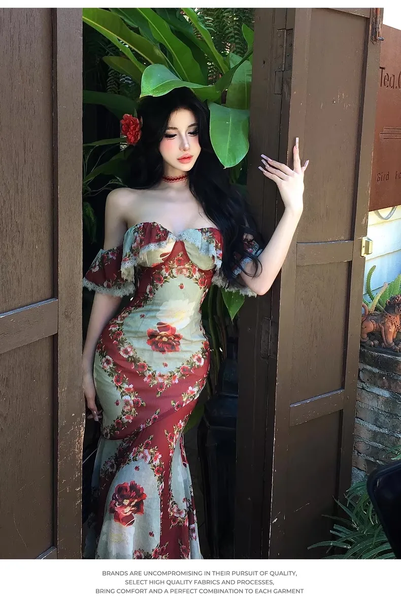 KYLETHOMASW - Sexy Floral Print Off-Shoulder Dress Women Sweet Elegant Ruffle Long Midi Dress Vintage Style Summer Party Dress Female