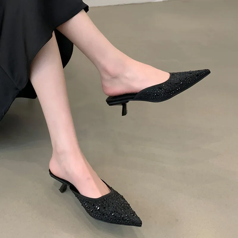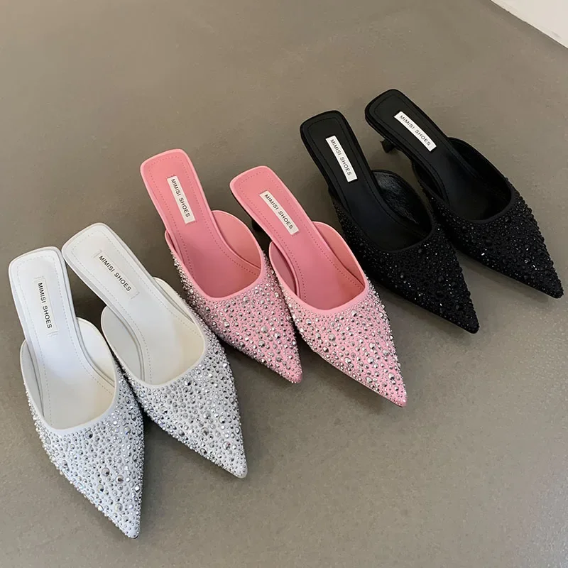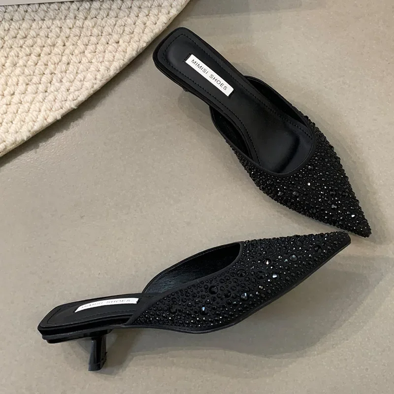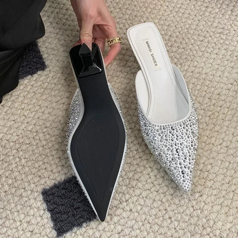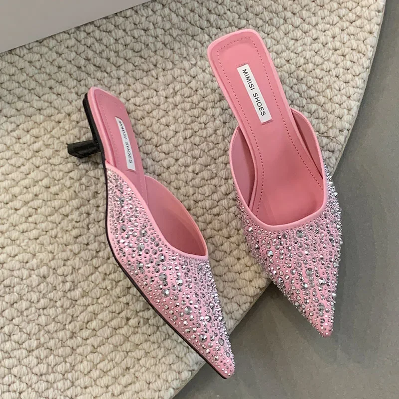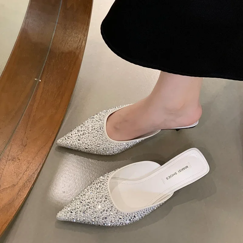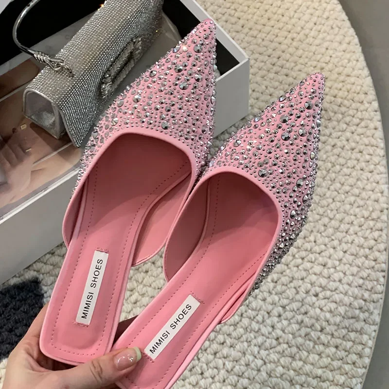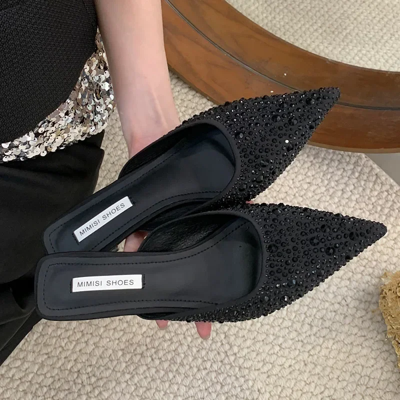 Kylethomasw Sparkling Rhinestone Luxury Slippers for Women Sexy Pointed Toe Low Heel Slides Fashion Footwear Diamond Dress Sandals Women