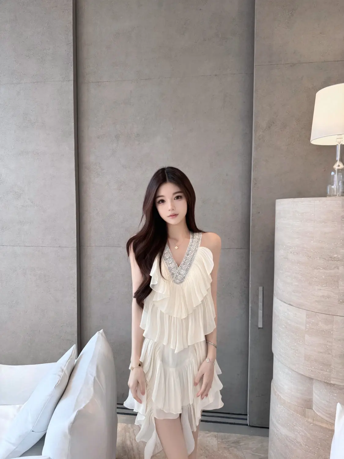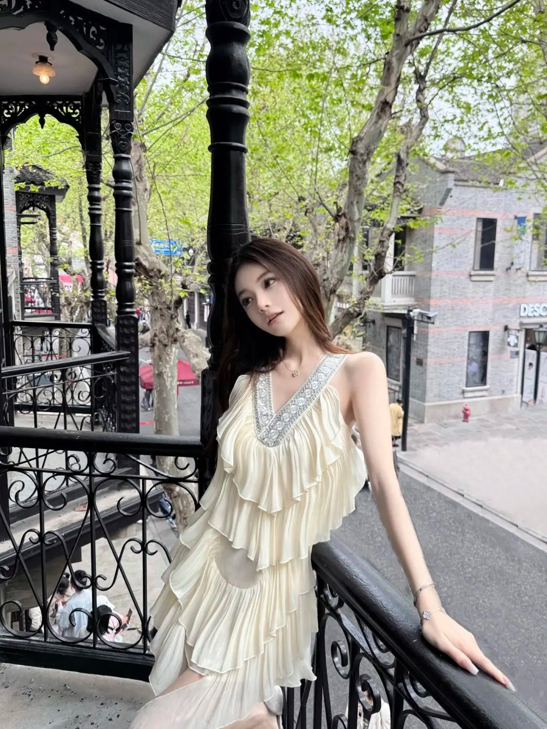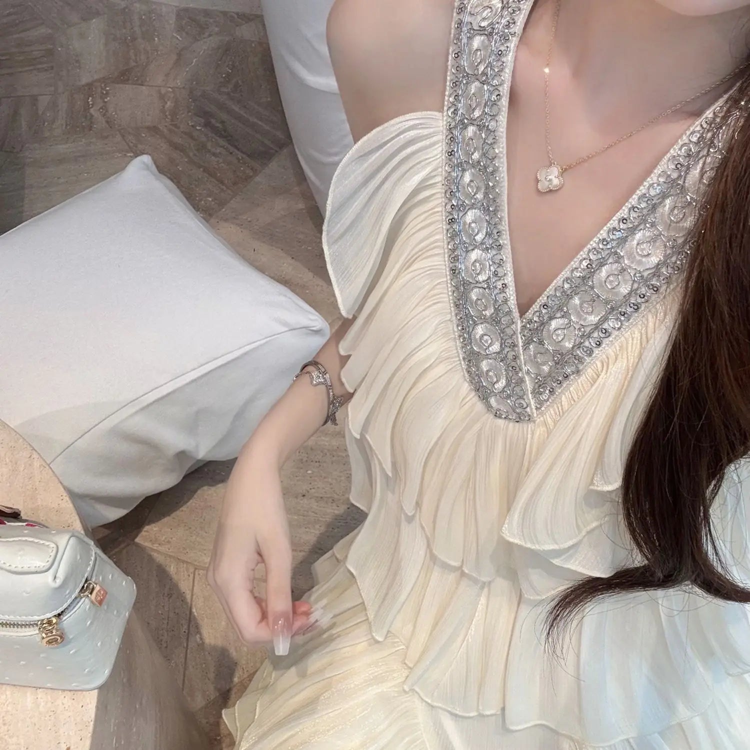 KYLETHOMASW - Spicy Girl V-Collar Ruffle Edge Sleeveless Halter Dress for Women Summer French Beach Style Loose Casual Sweet A-line Midi Dress