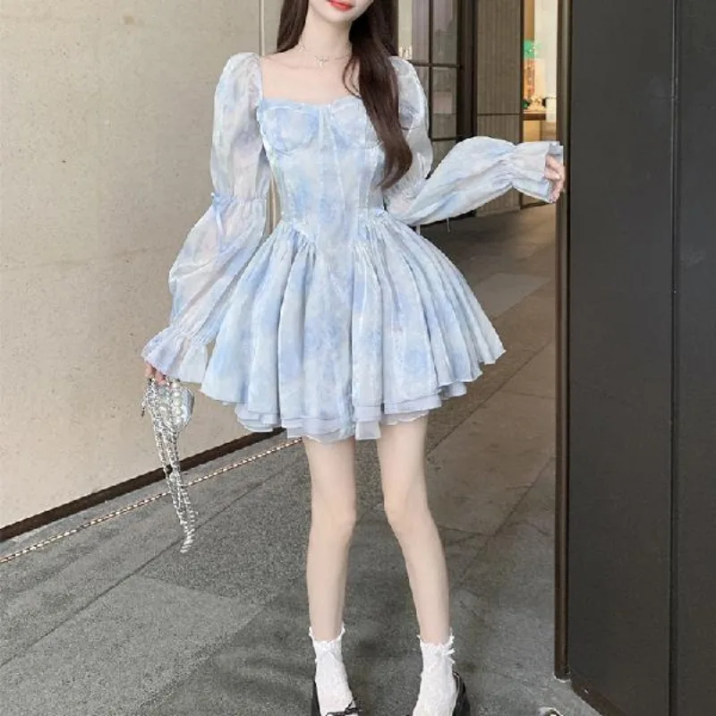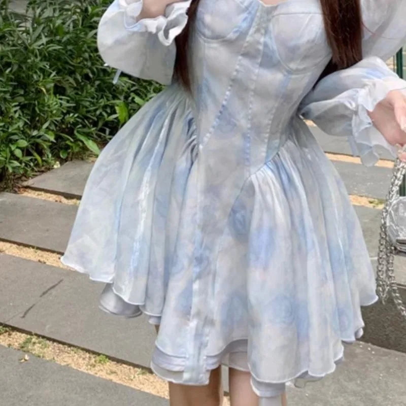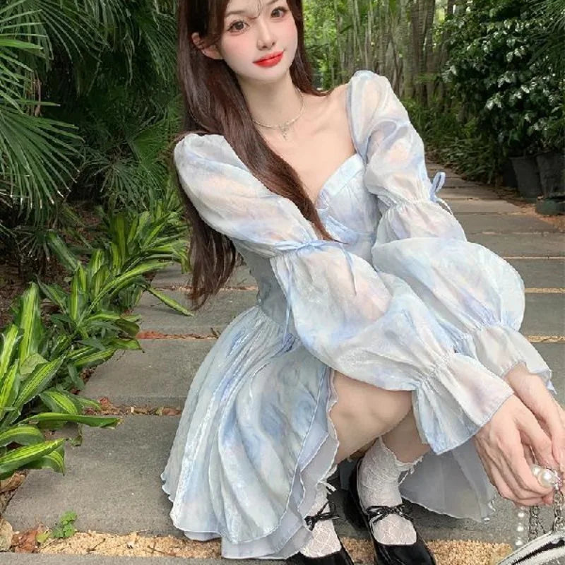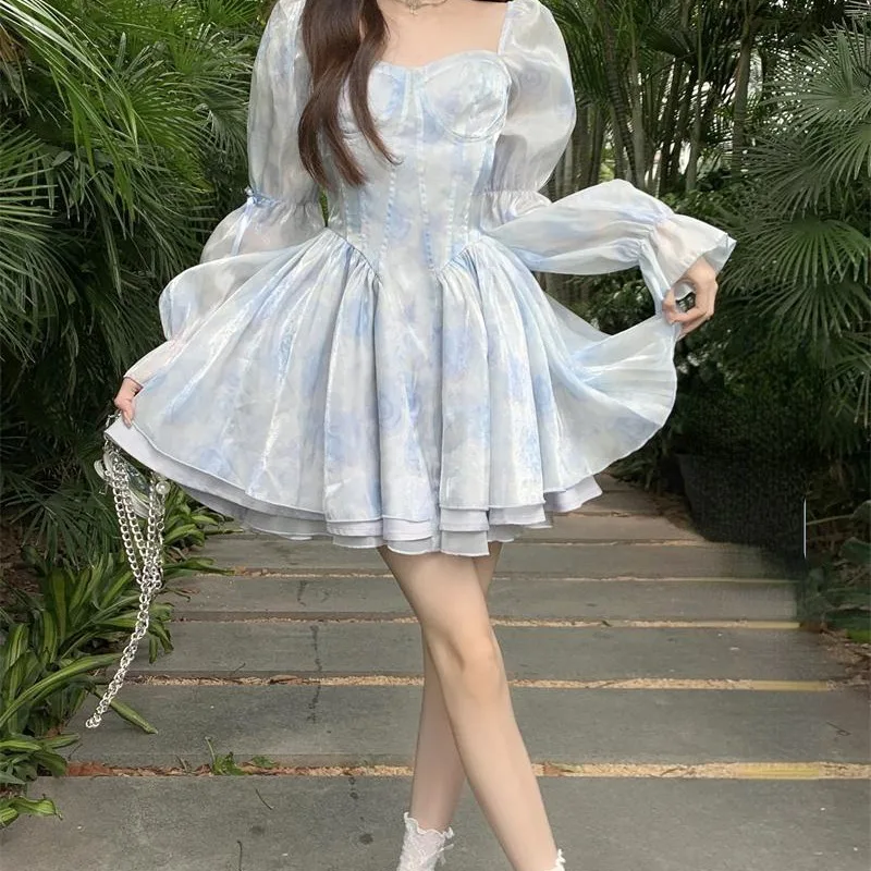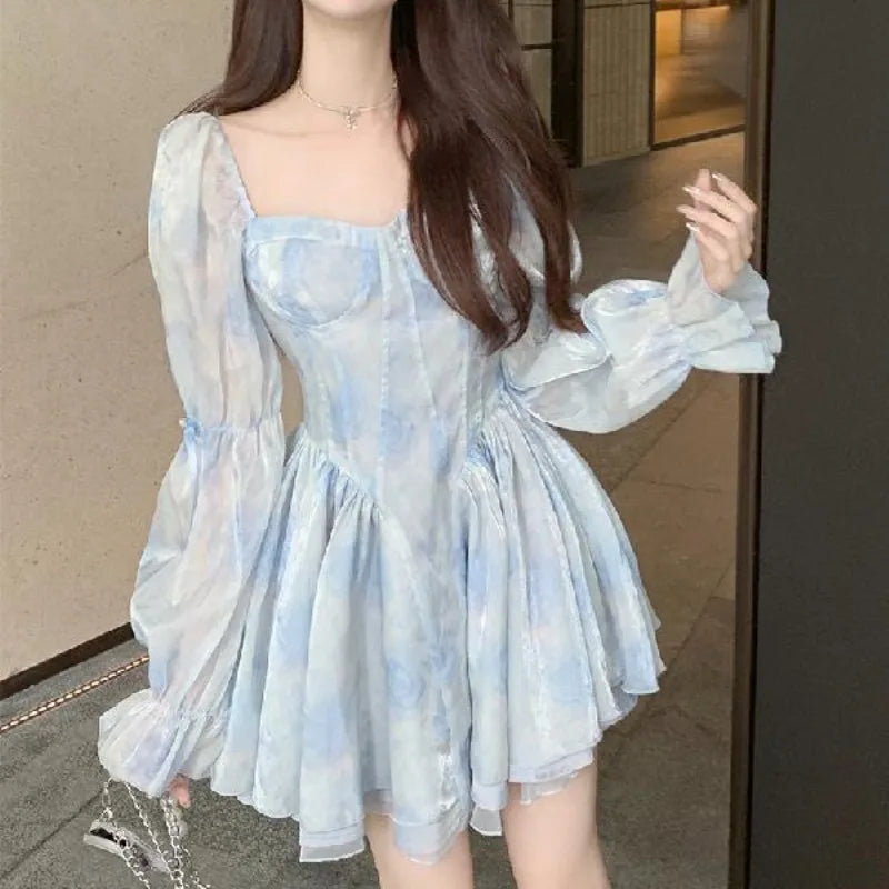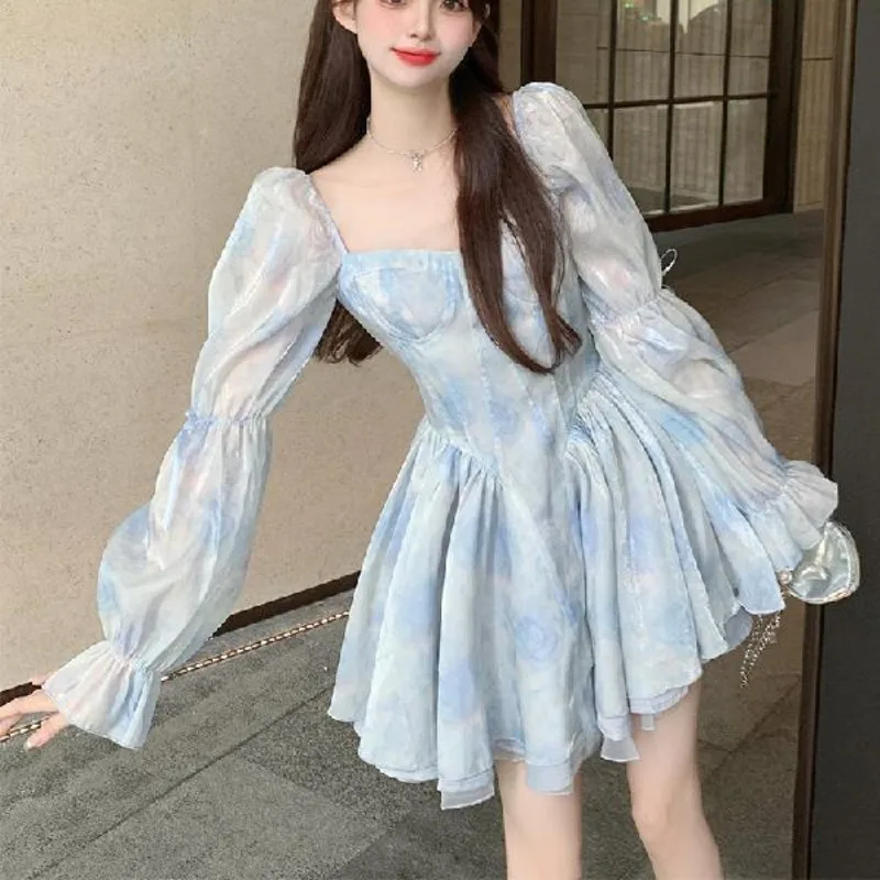 KYLETHOMASW - Spring Fall A-line Mini Dresses Blue Vintage Korean Fashion Vestidos Mujer Beach Style Sweet Print Women Dress