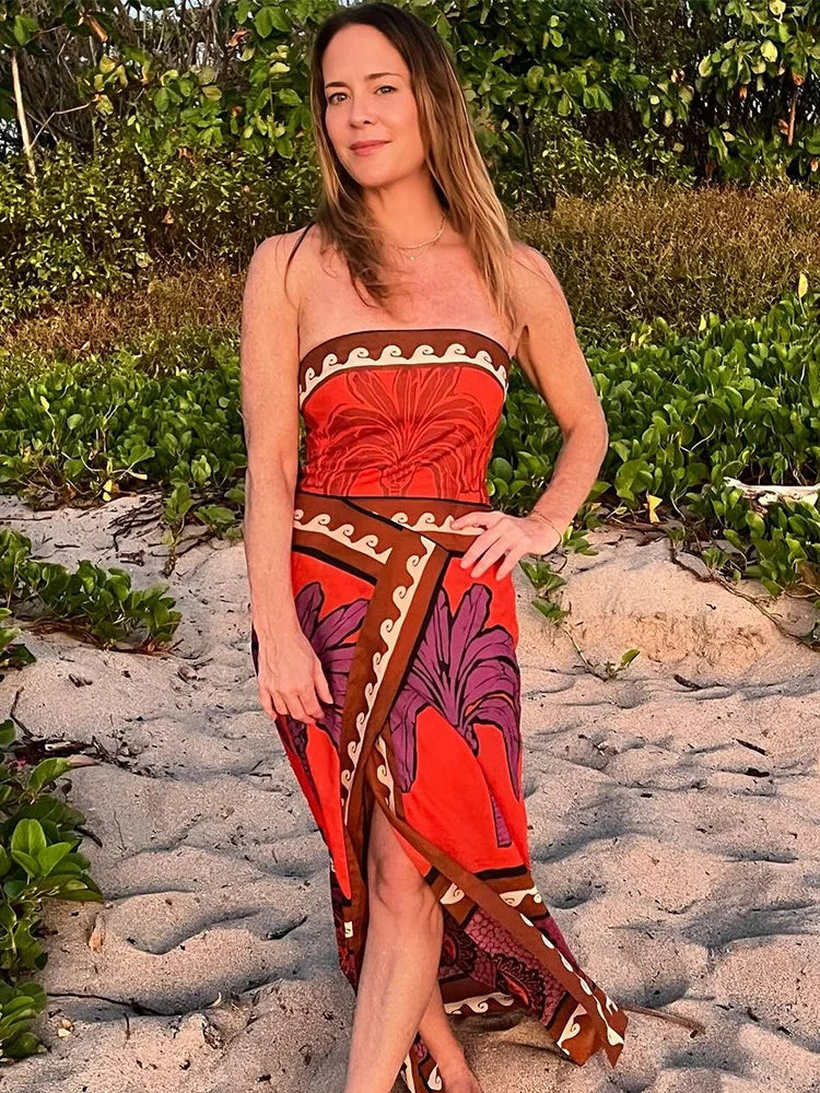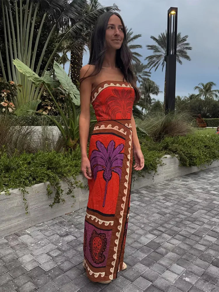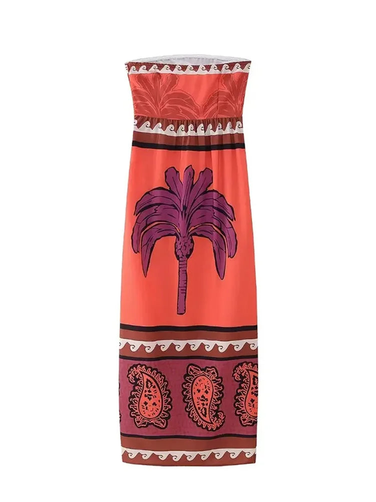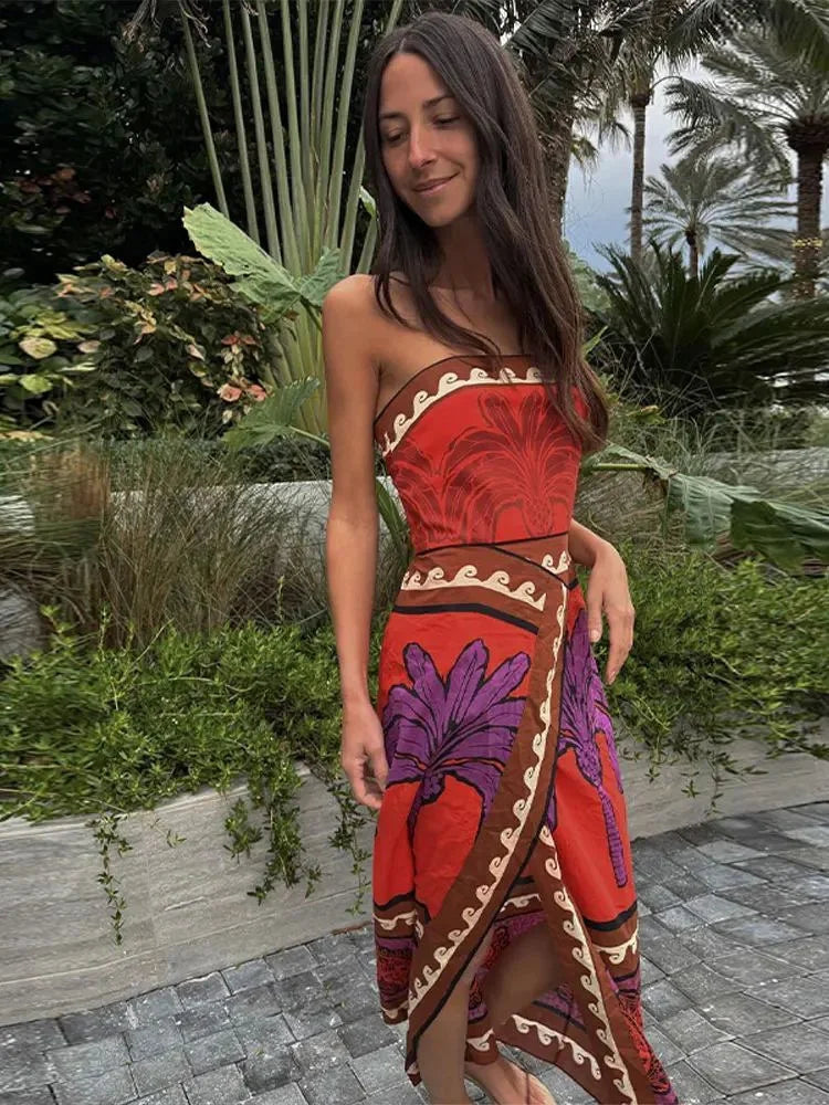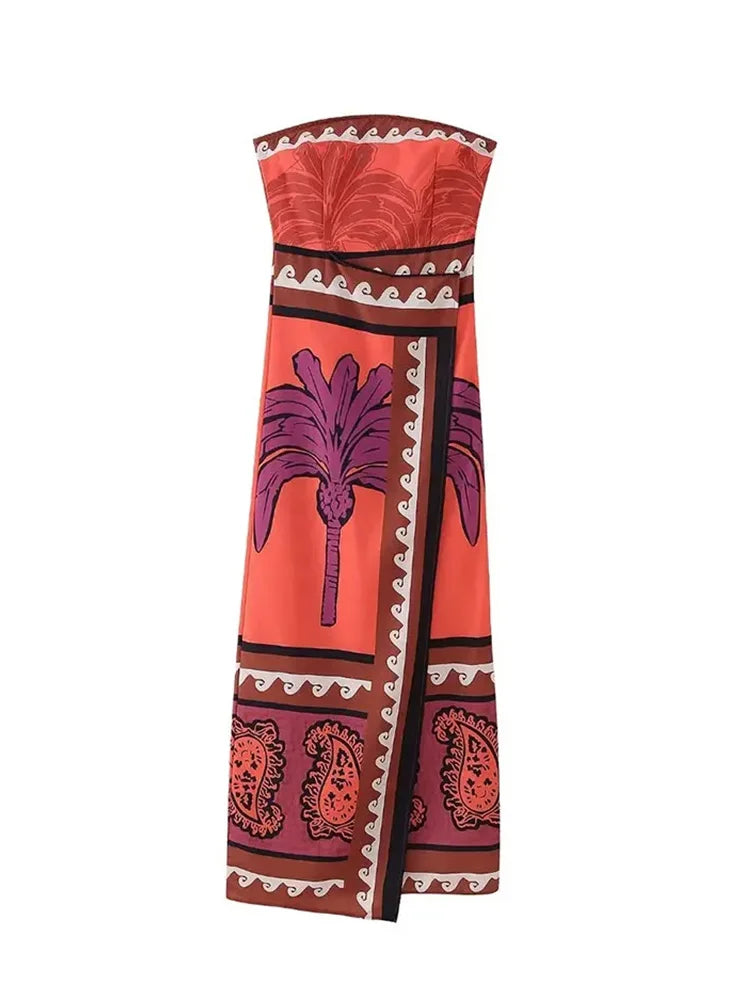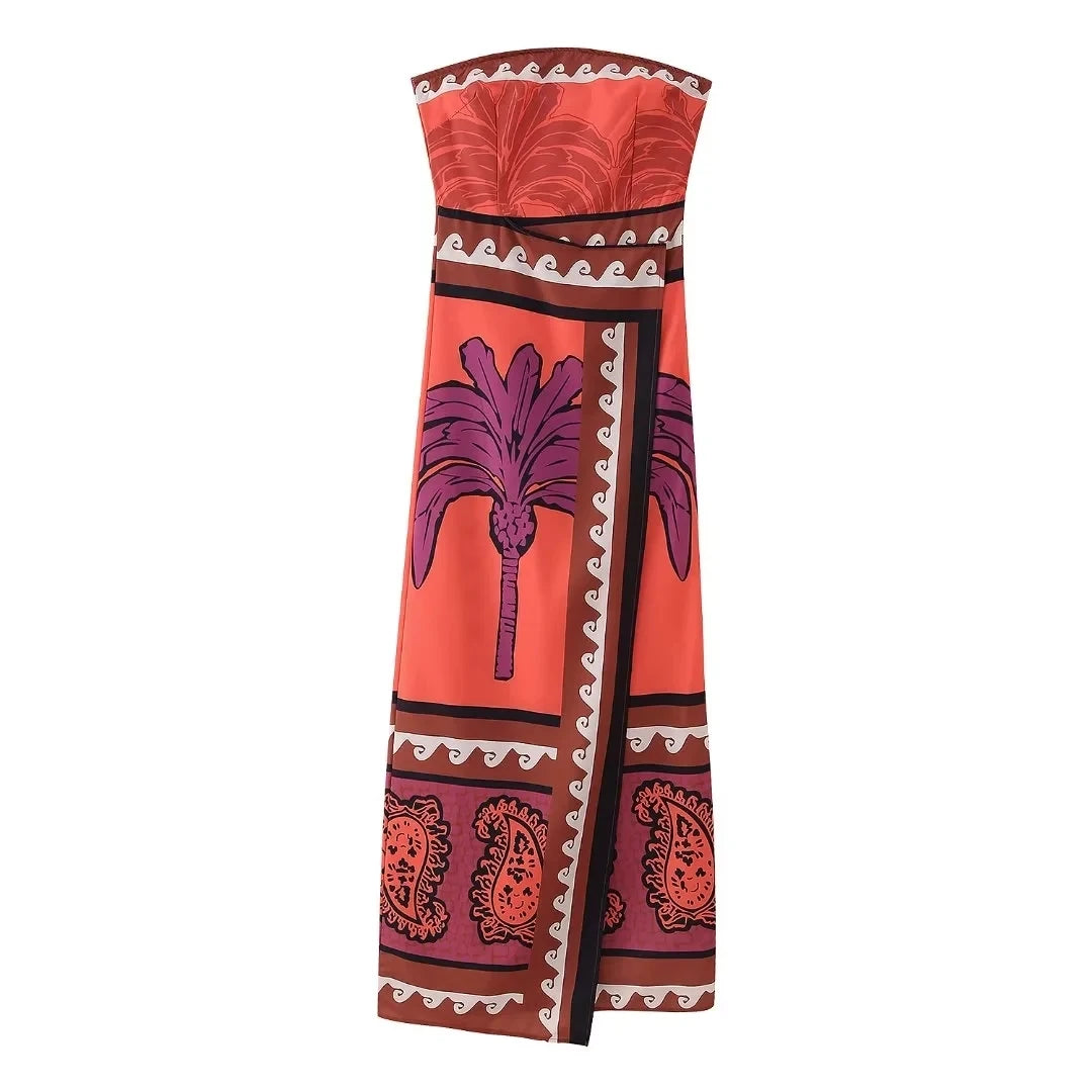 Kylethomasw Summer Women's Vintage Printed Tube Dress Fashion Strapless Slim Fit Midi Dresses Female Casual Hem Slit Beach Dress
