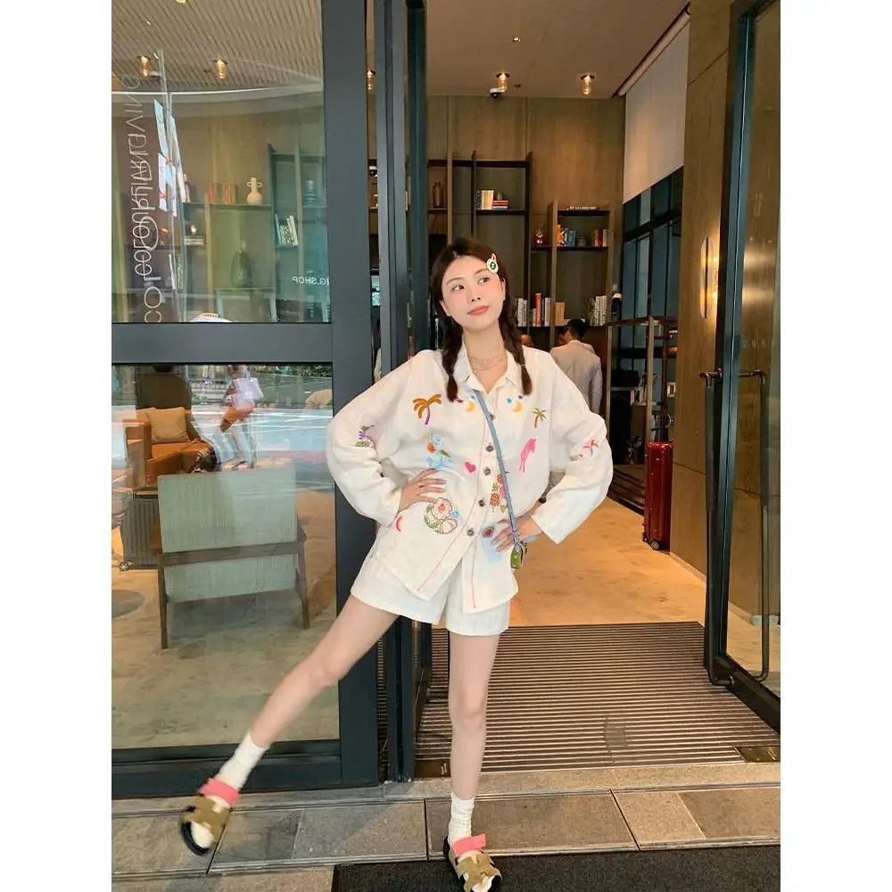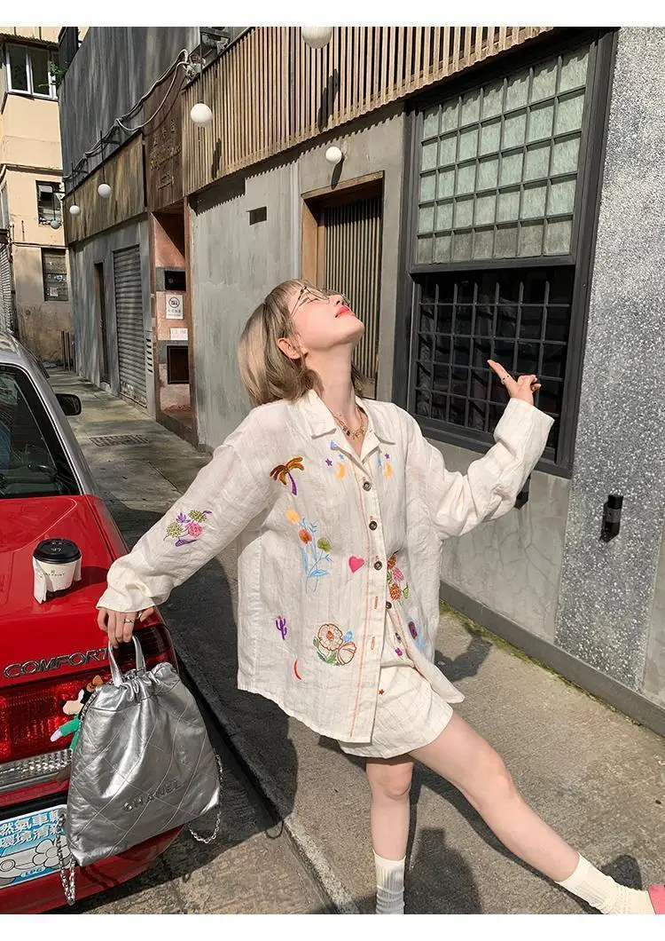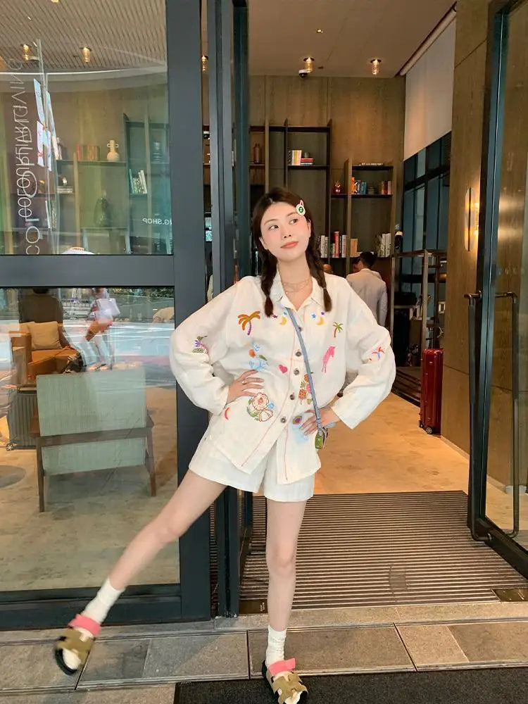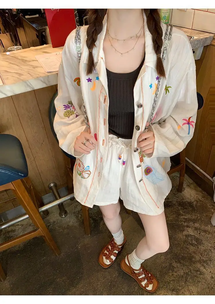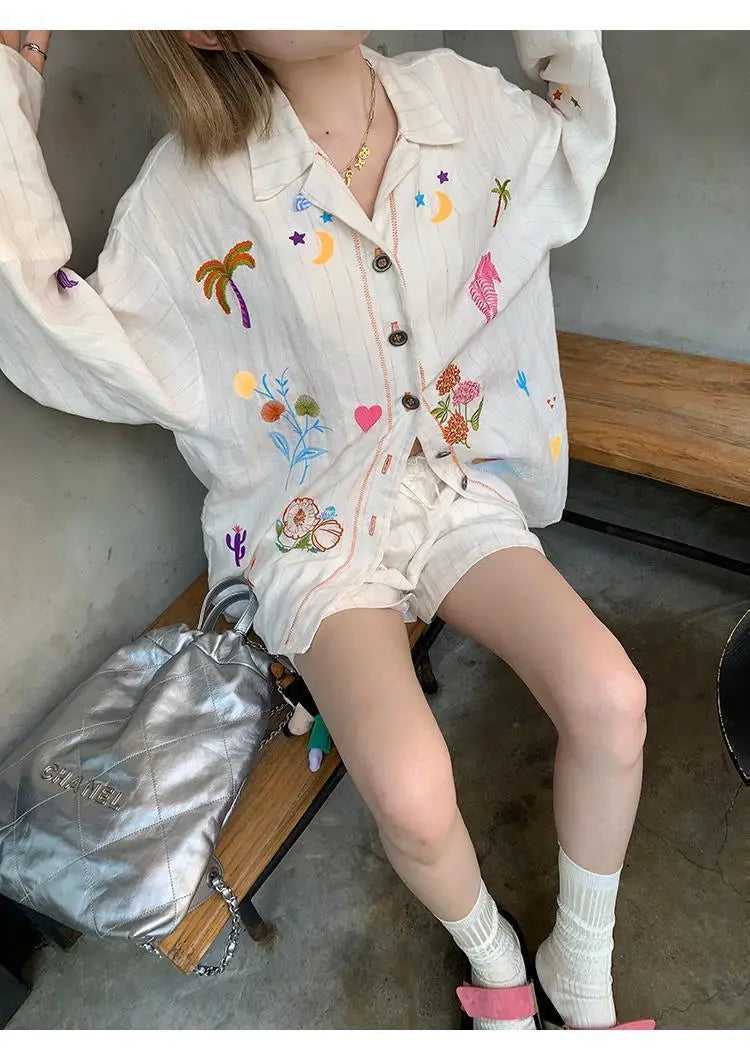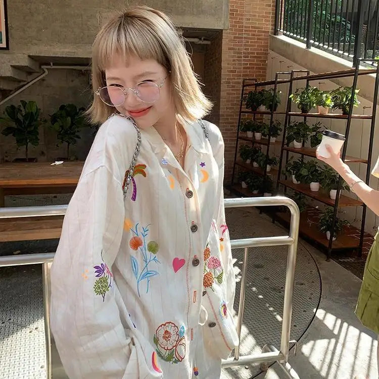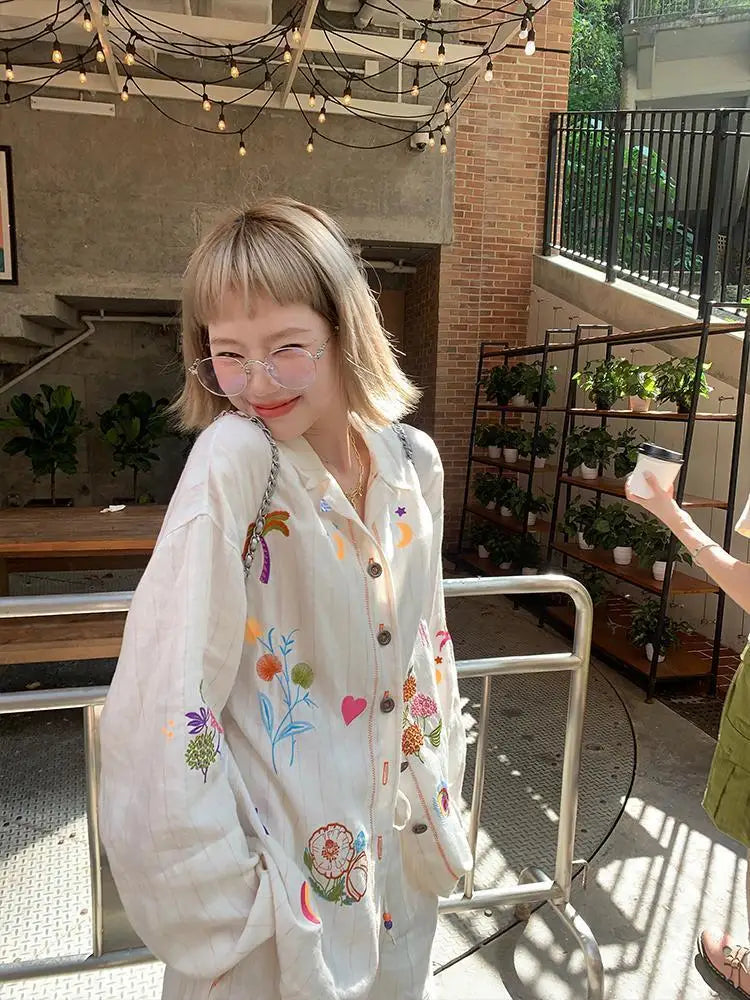 KYLETHOMASW - Sweet Embroidery Loose Shirts Vintage Stripe Lapel Blouses Casual Two Piece Set Korean Fashion Blusa Mujer Moda