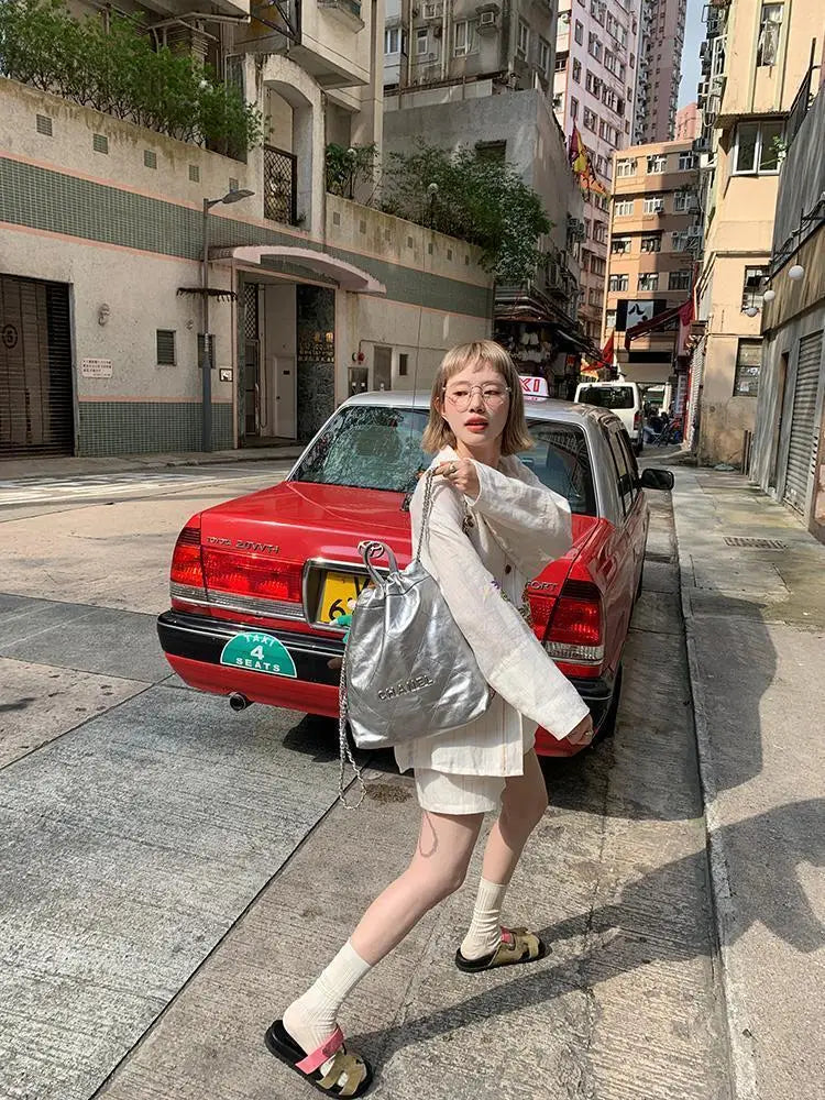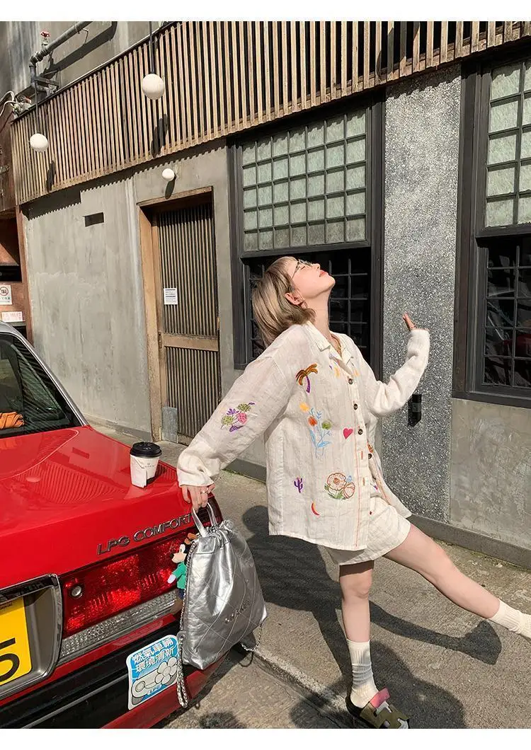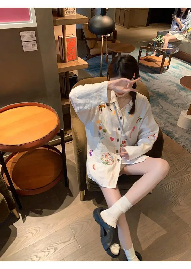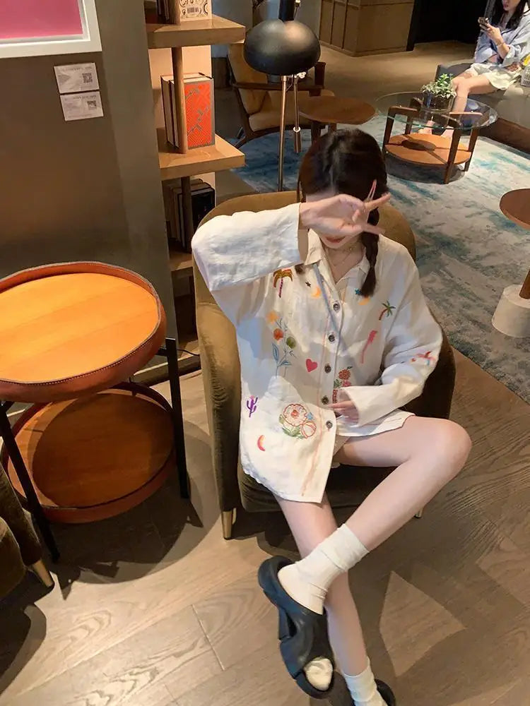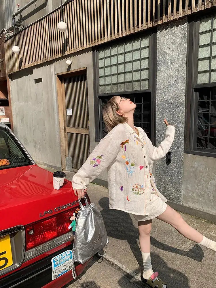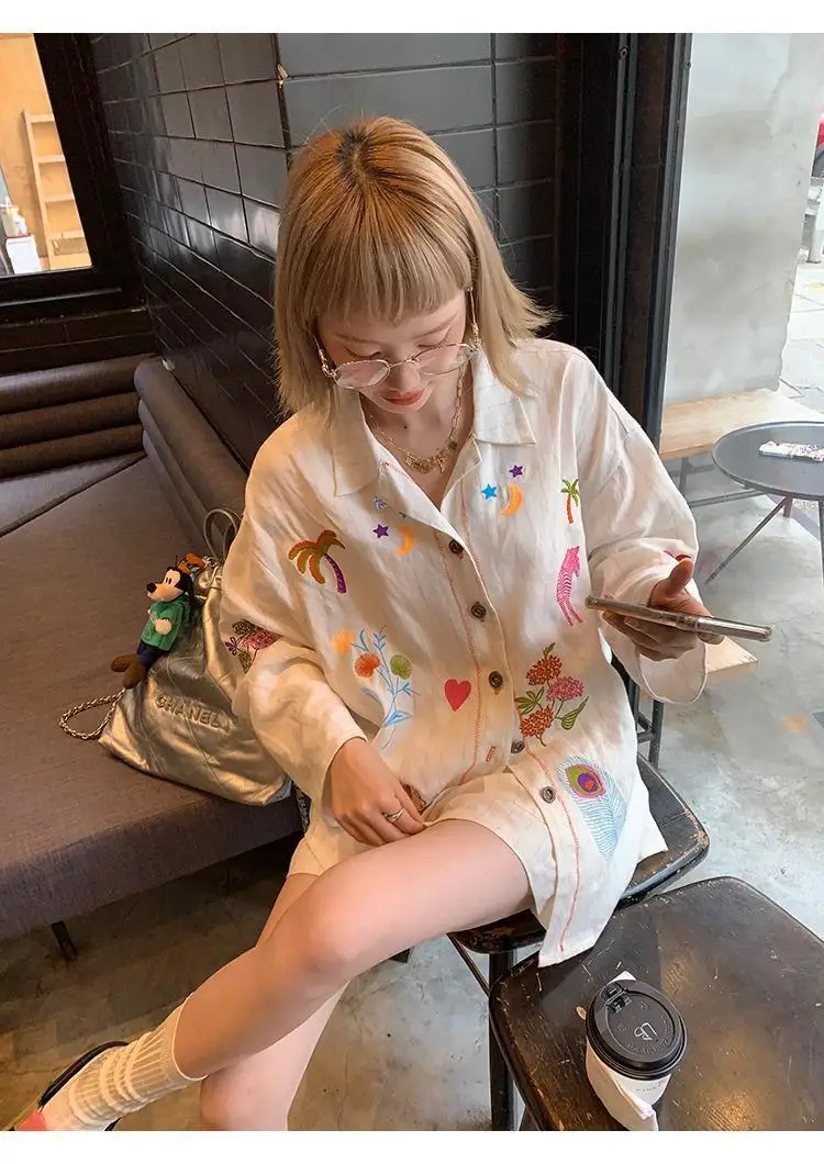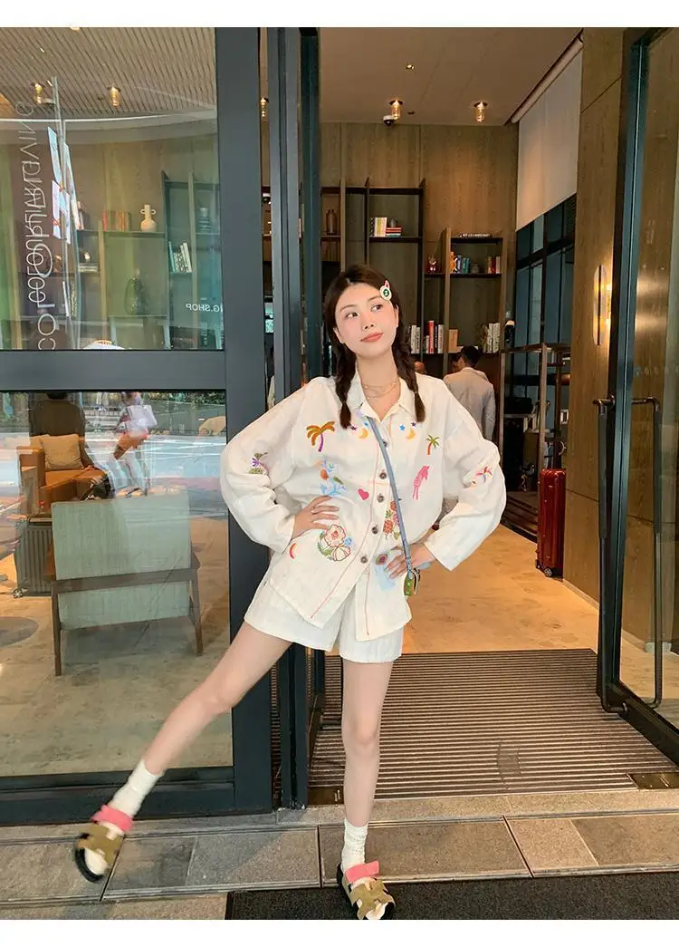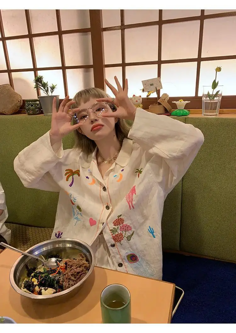KYLETHOMASW - Sweet Embroidery Loose Shirts Vintage Stripe Lapel Blouses Casual Two Piece Set Korean Fashion Blusa Mujer Moda