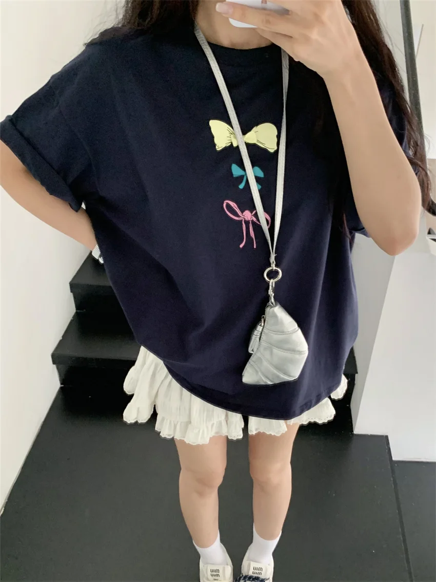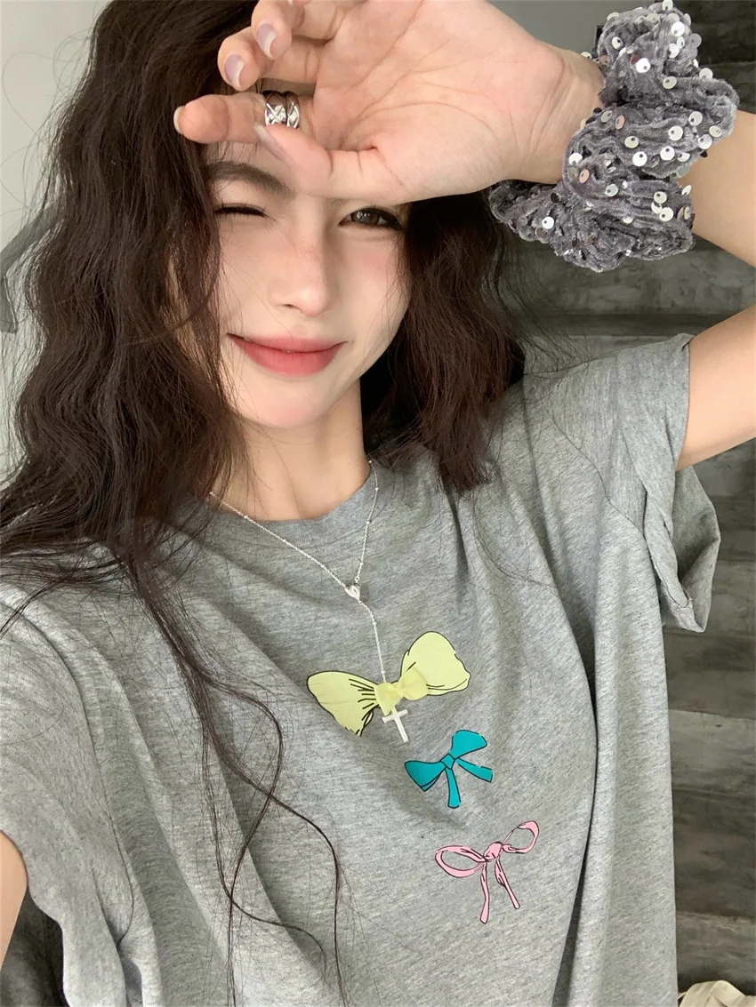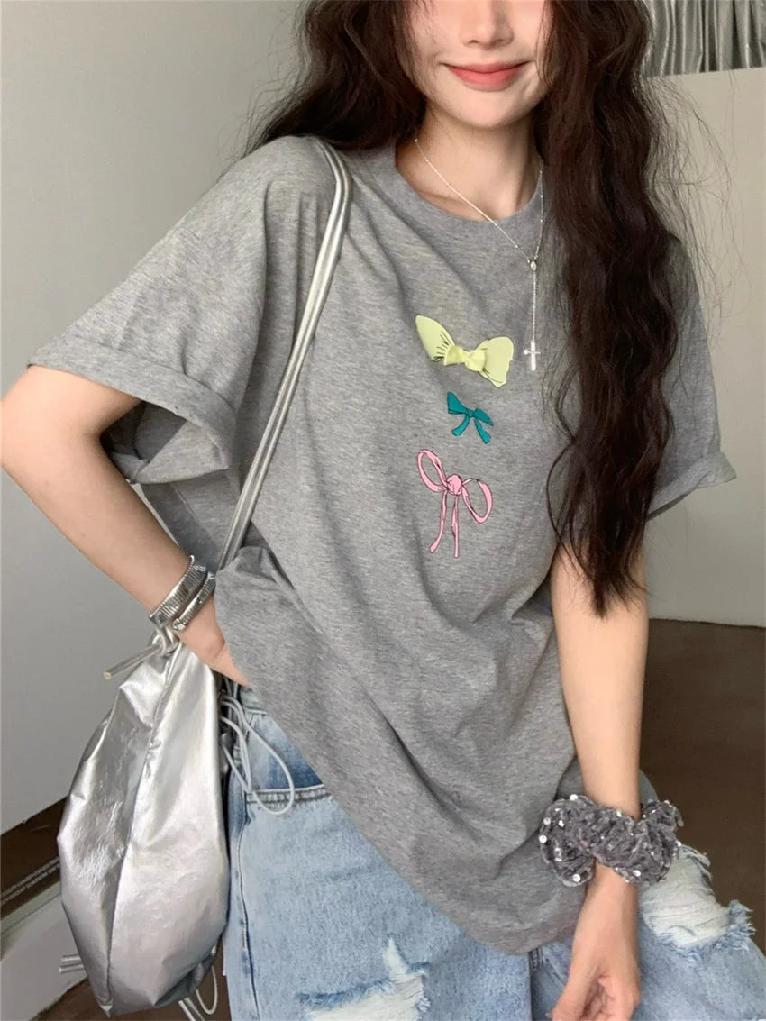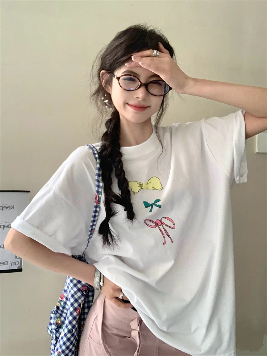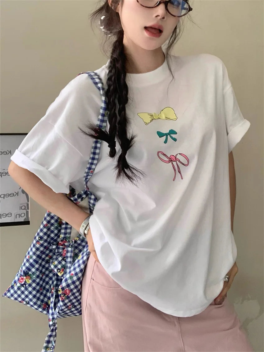 KYLETHOMASW - Sweet Printed Bow T-Shirts Women Oversize Half Sleeve 2024 Loose New Casual Summer Daily All Match Fashion Tees