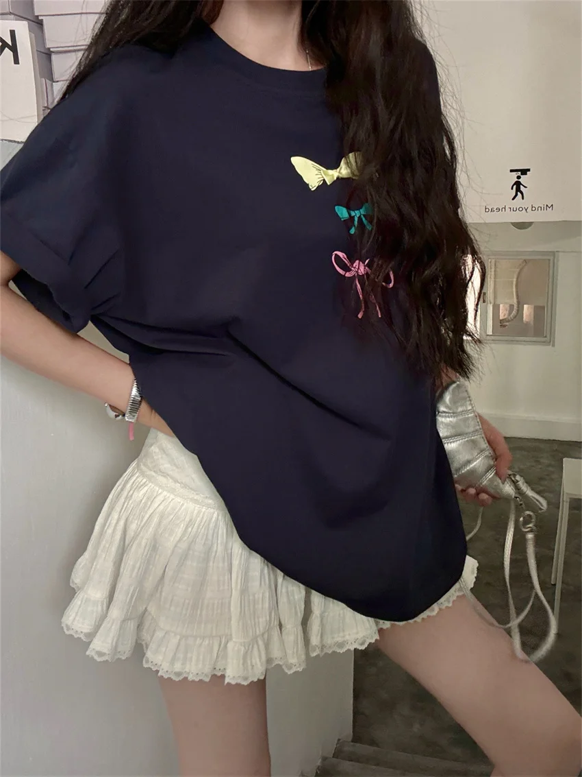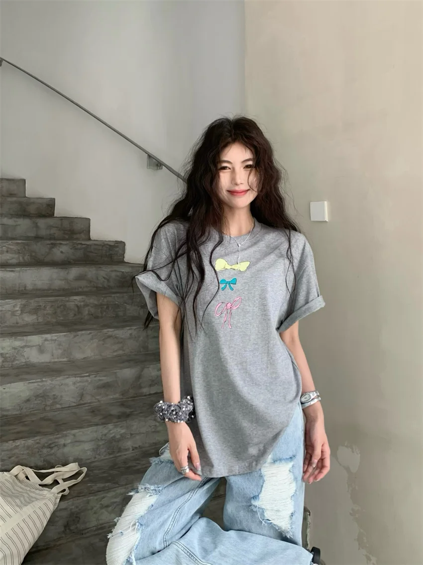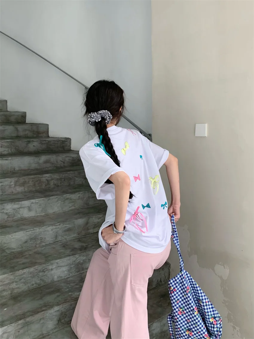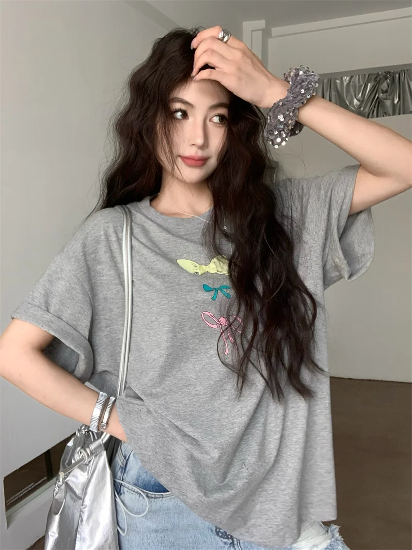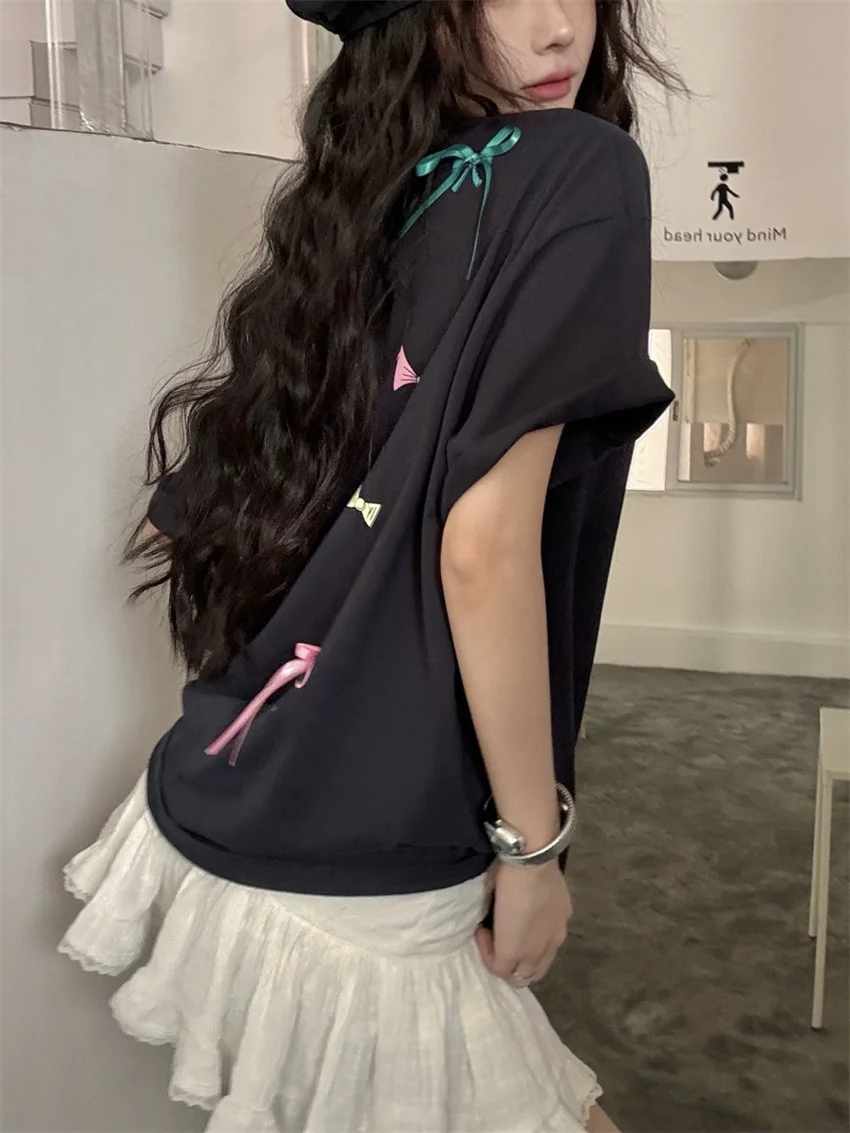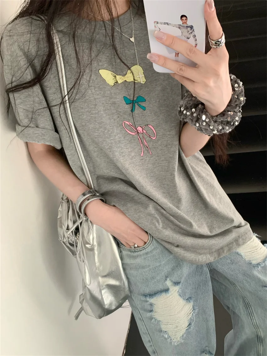 KYLETHOMASW - Sweet Printed Bow T-Shirts Women Oversize Half Sleeve 2024 Loose New Casual Summer Daily All Match Fashion Tees