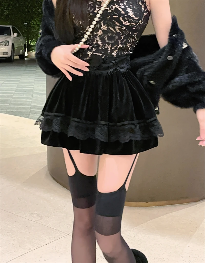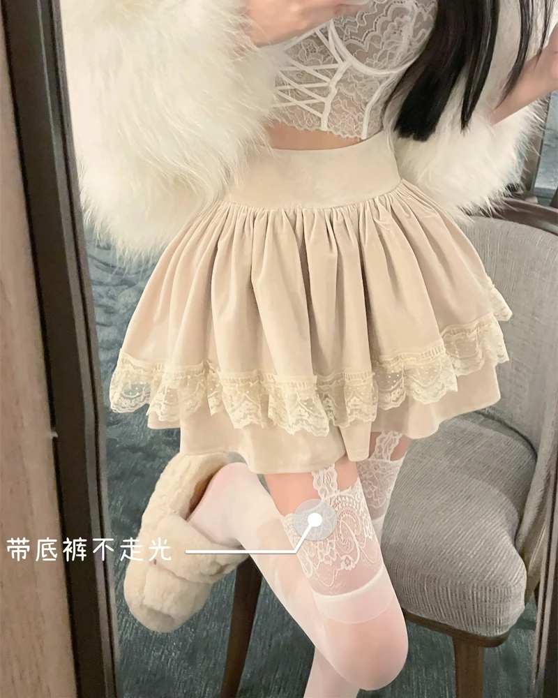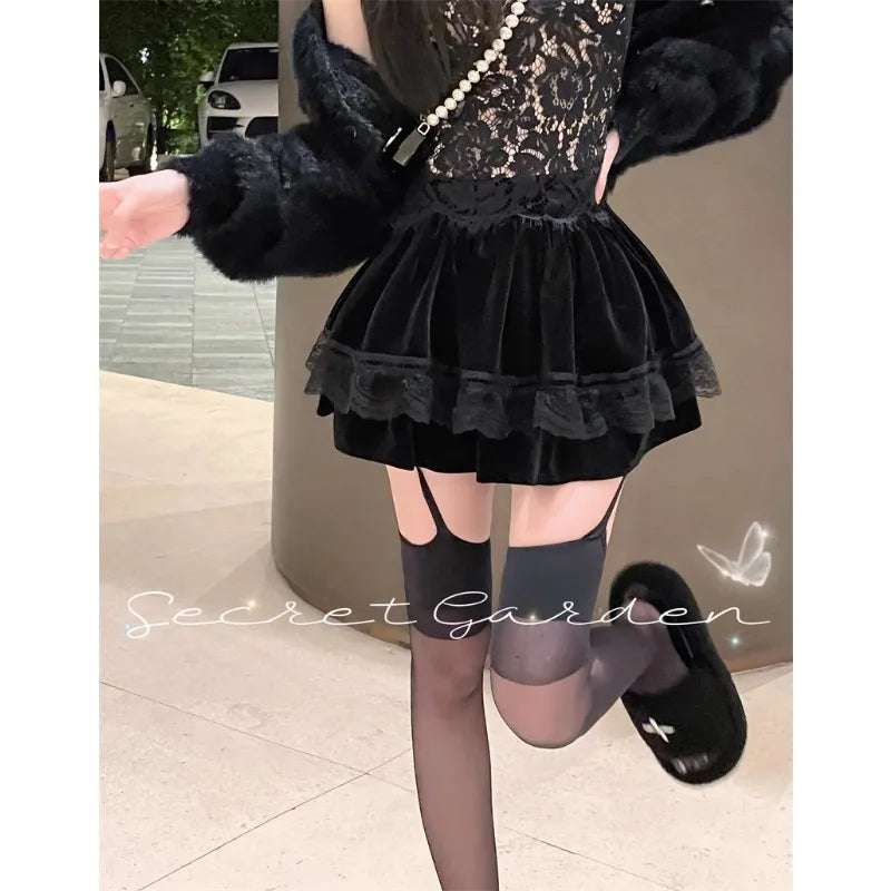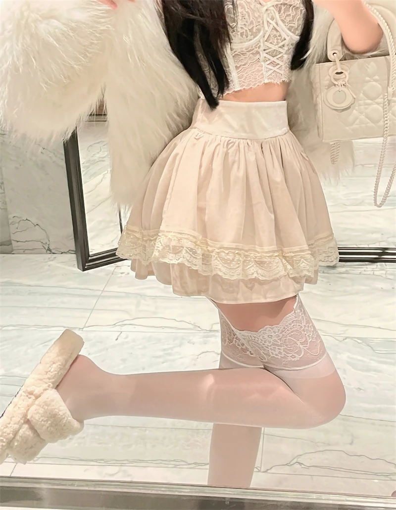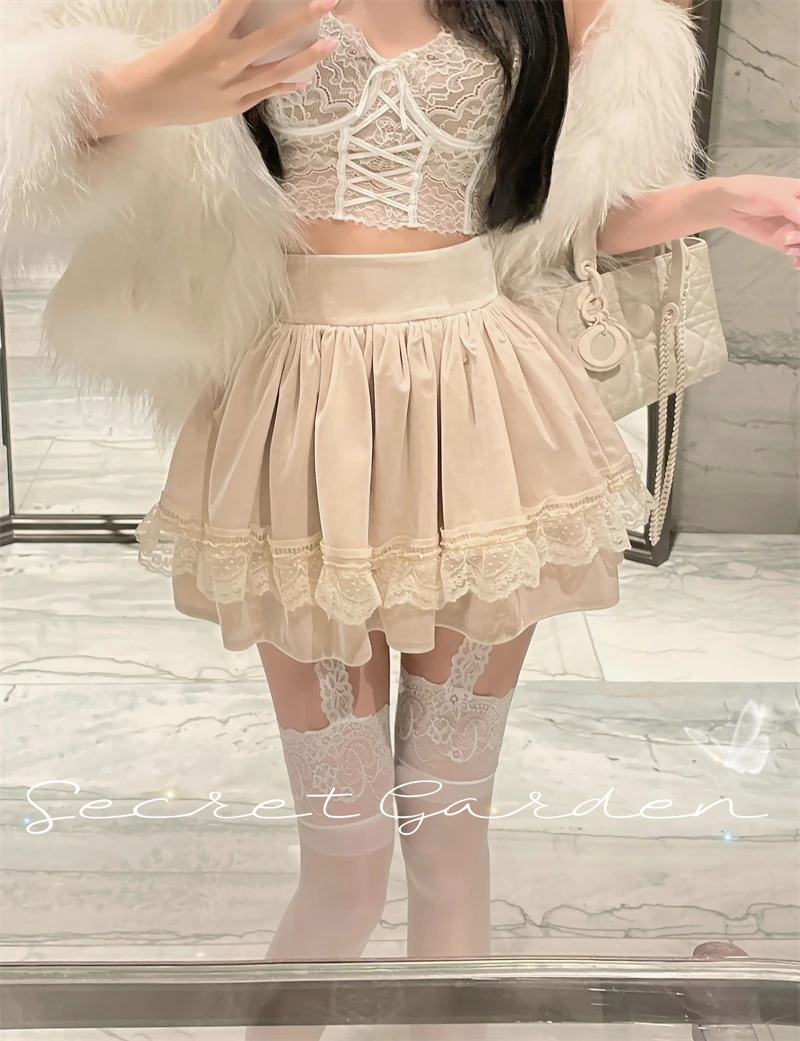 Vintage Korean Retro Japanese Style Lace Patchwork Low Waist Cake Mini Skirt Streetwear Fashion Skirt