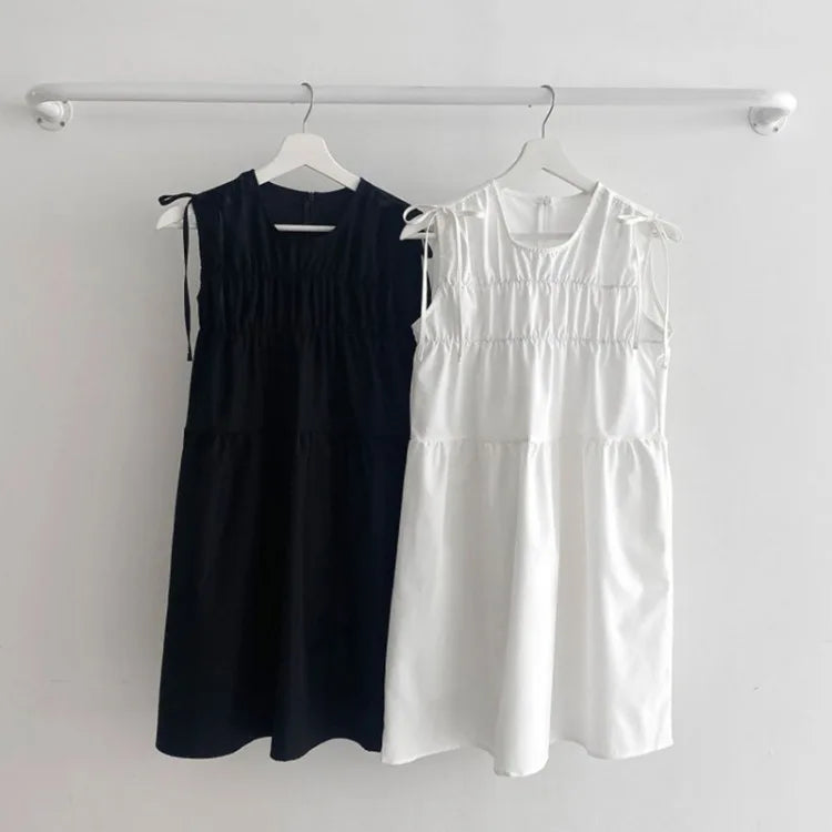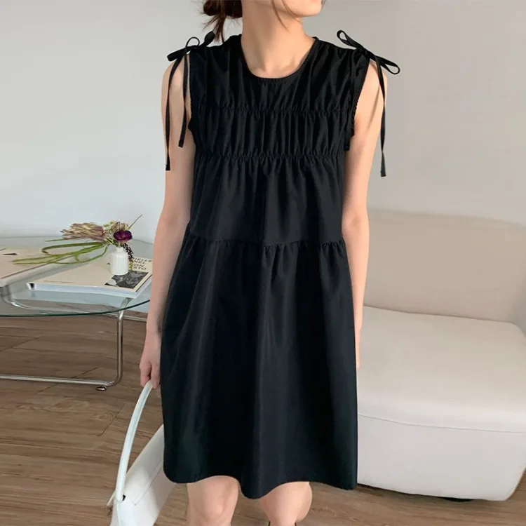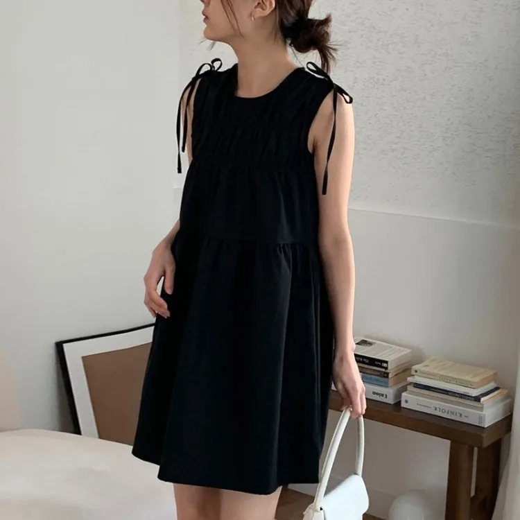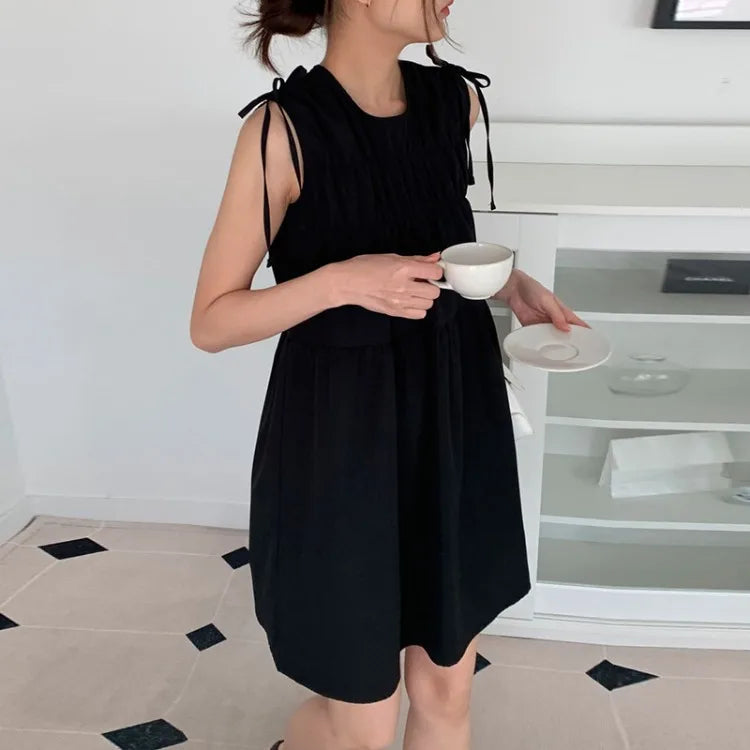 KYLETHOMASW - Vintage O-neck Ruched Bow Lace Up Dresses Y2k Sleeveless Loose Dress for Women 2025 Summer New Black Vestidos De Mujer
