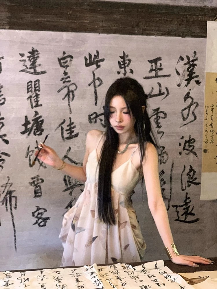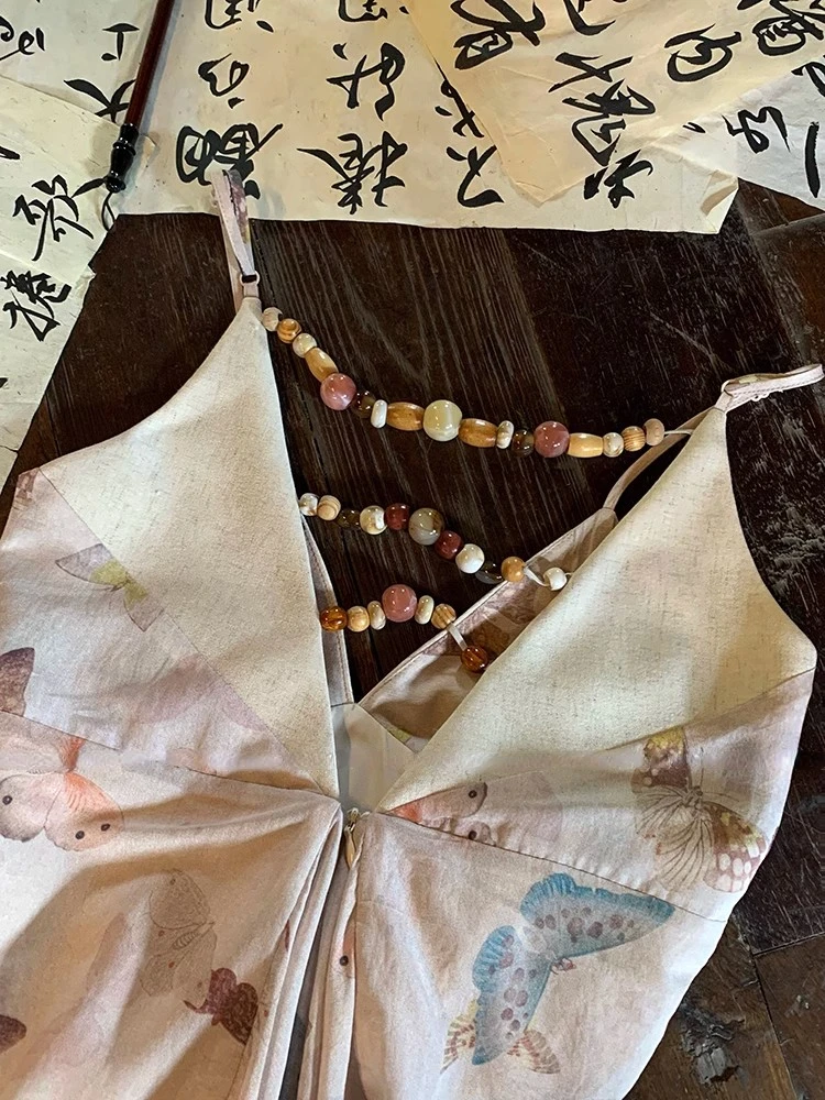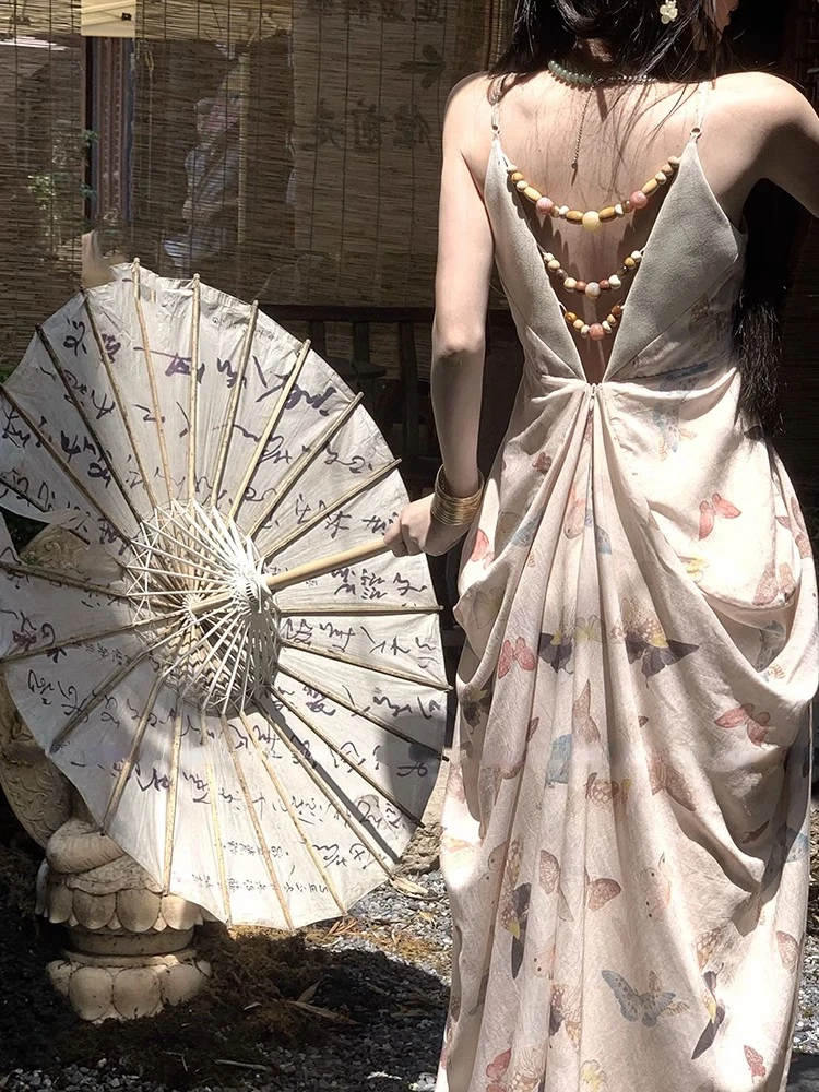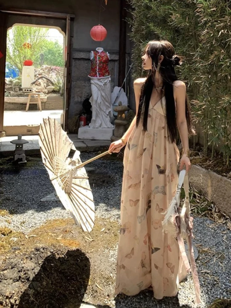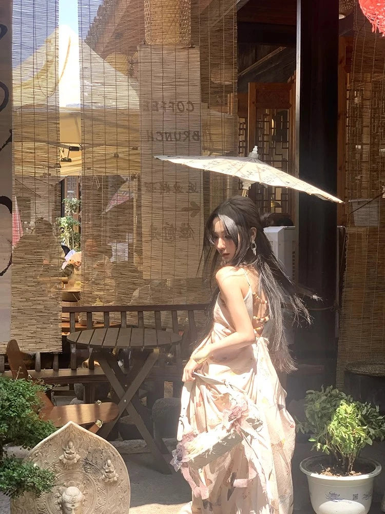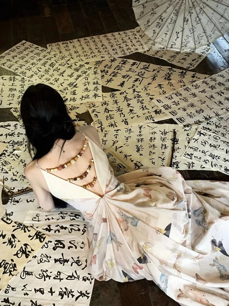KYLETHOMASW - Vintage Sexy Print Midi Dress Women Backless Casual A-line Strap Dress Evening Party Clothing Korean Fashion Elegant Summer 2024