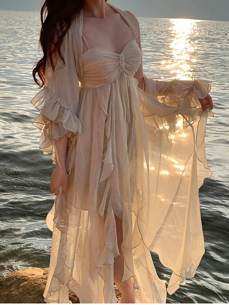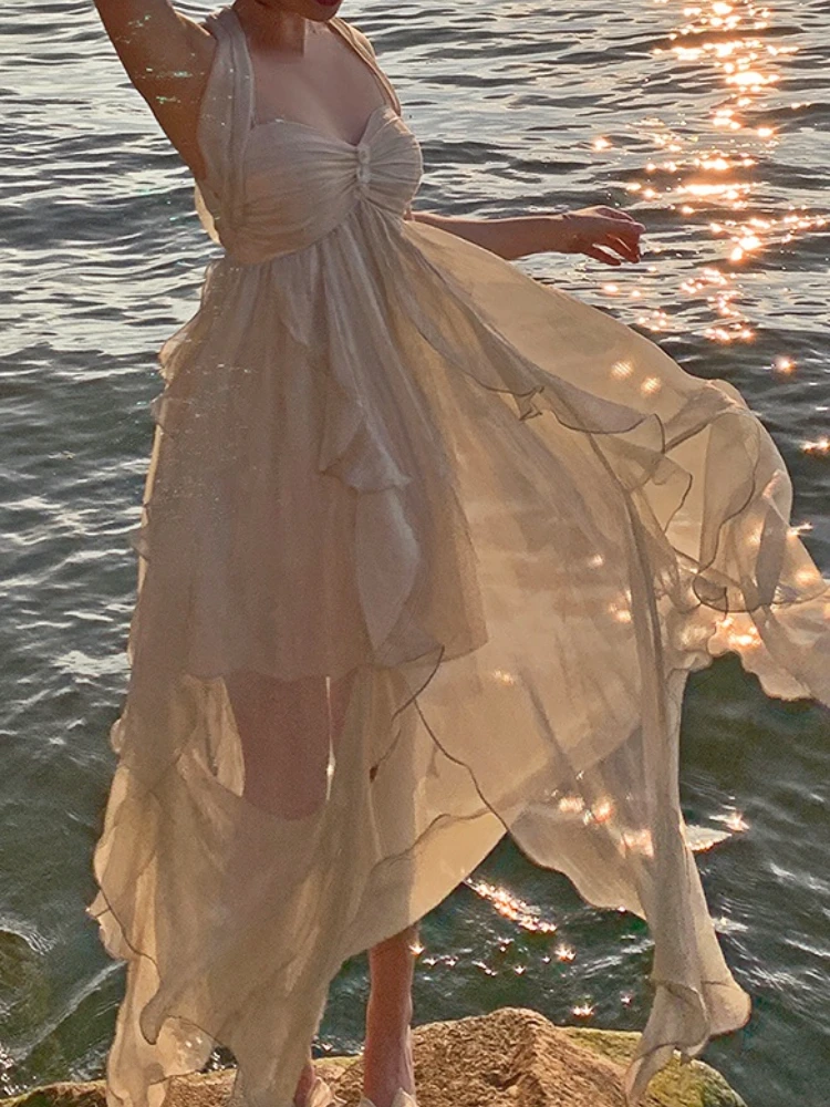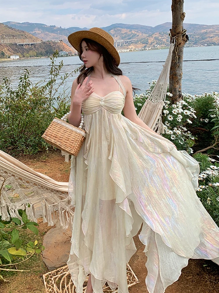 KYLETHOMASW - Women Fashion Irregular Ruffles Beach Dress Summer Casual France Fairy Party Vestidos Korean Spaghetti Straps Bohemian Dresses