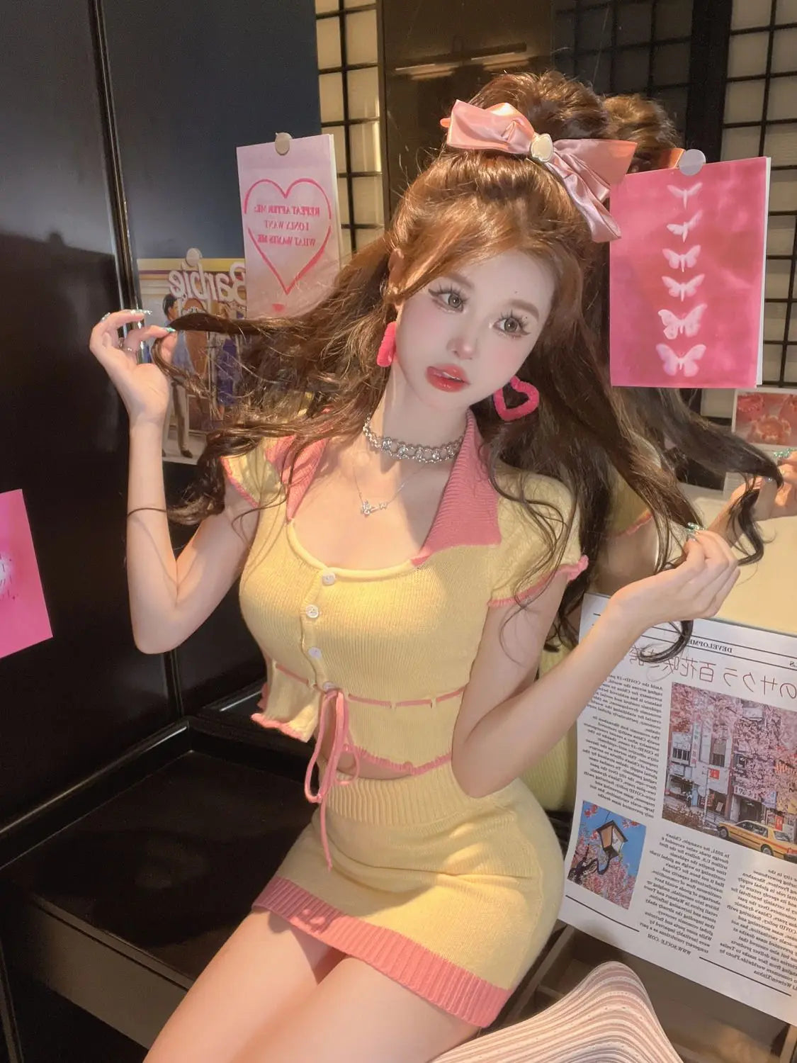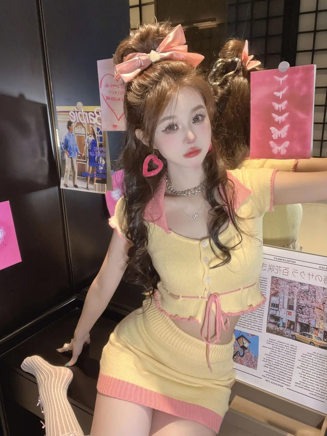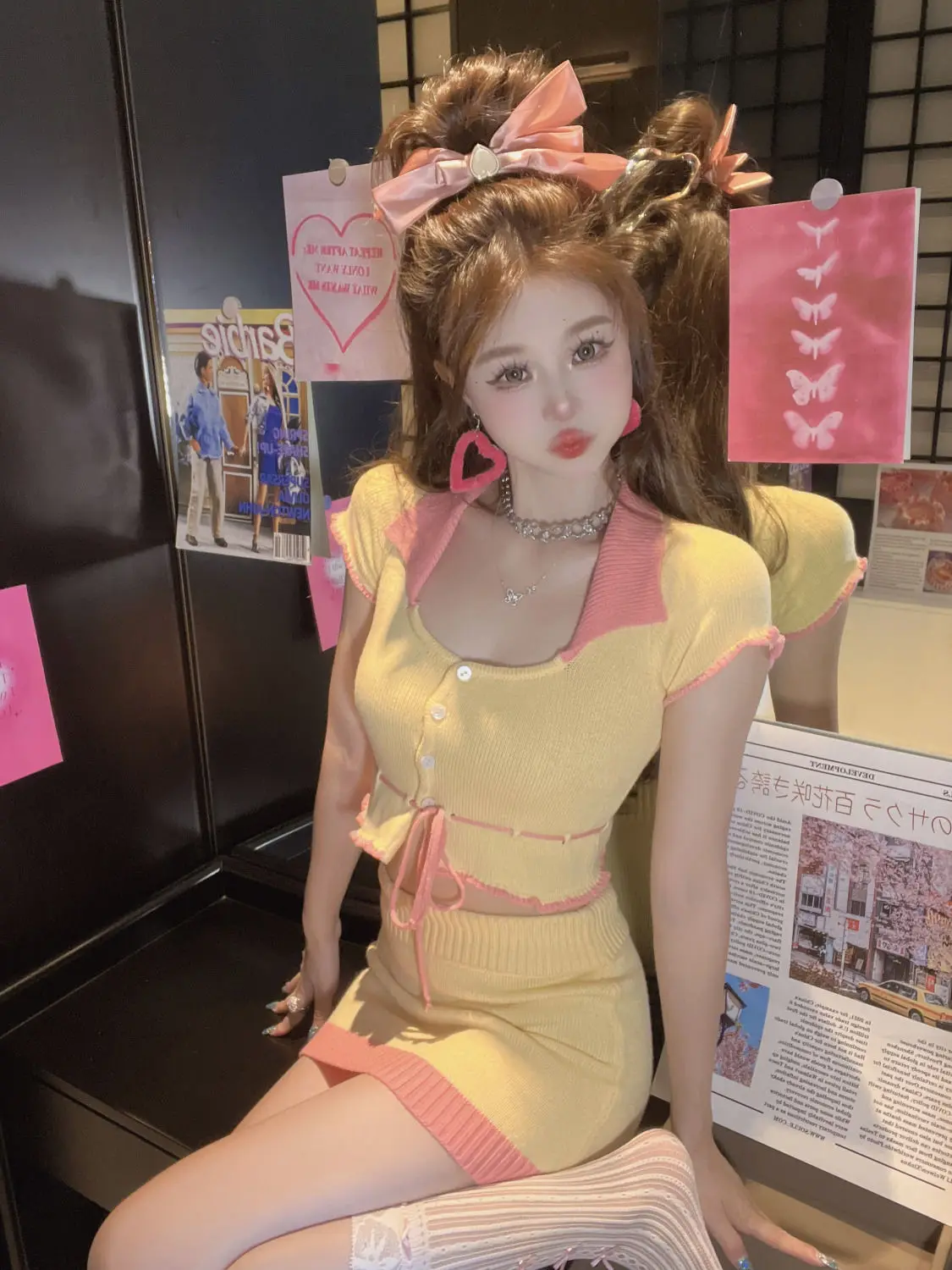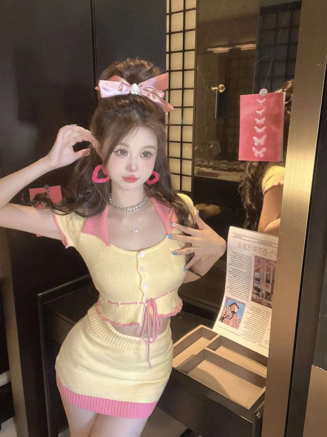 KYLETHOMASW - Women Sexy Knitted Two-Piece Set Short Sleeve Button Crop Top and High Waist Mini Skirt Slim Fit Sweet Suit Summer Party Outfit