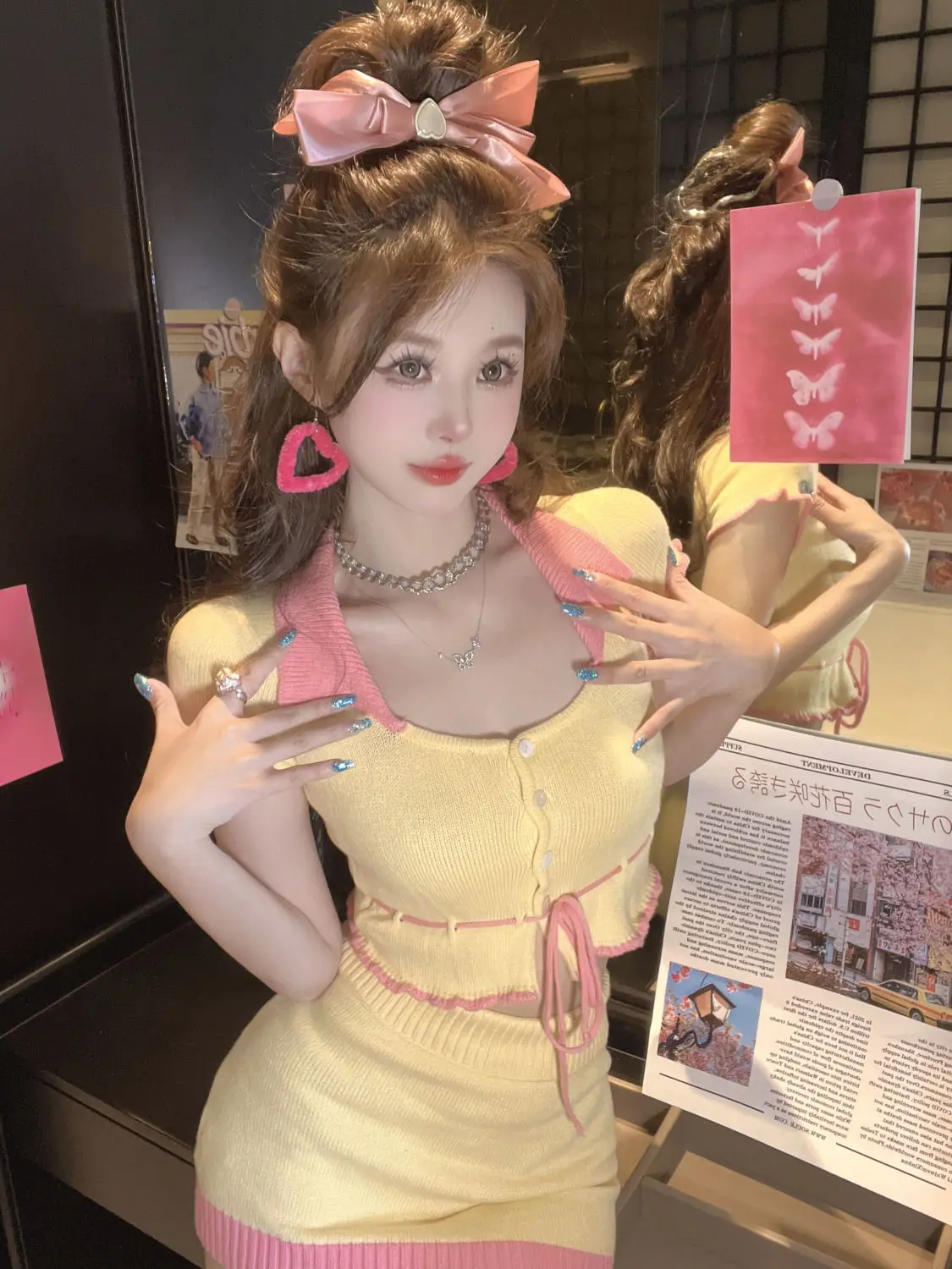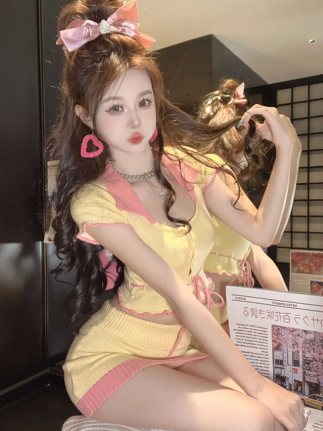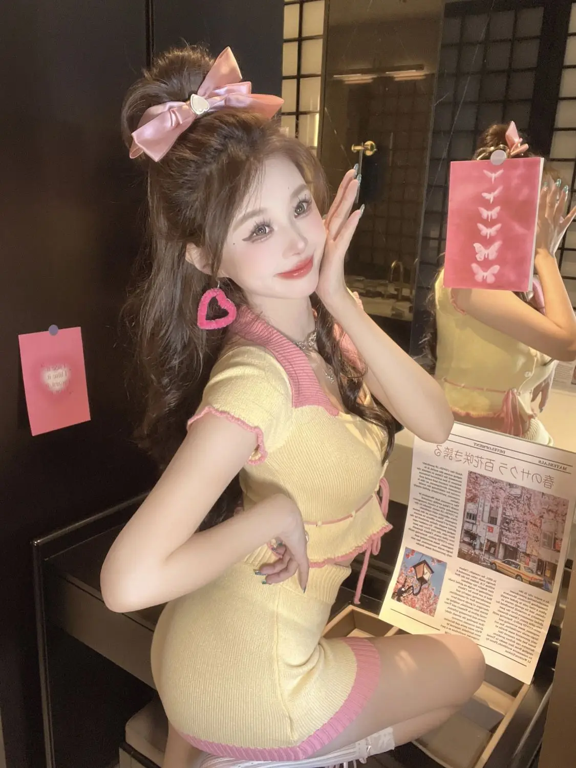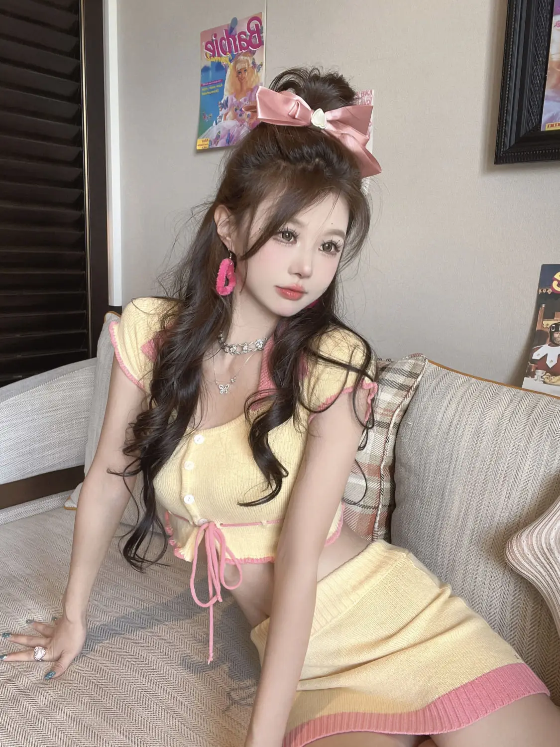 KYLETHOMASW - Women Sexy Knitted Two-Piece Set Short Sleeve Button Crop Top and High Waist Mini Skirt Slim Fit Sweet Suit Summer Party Outfit