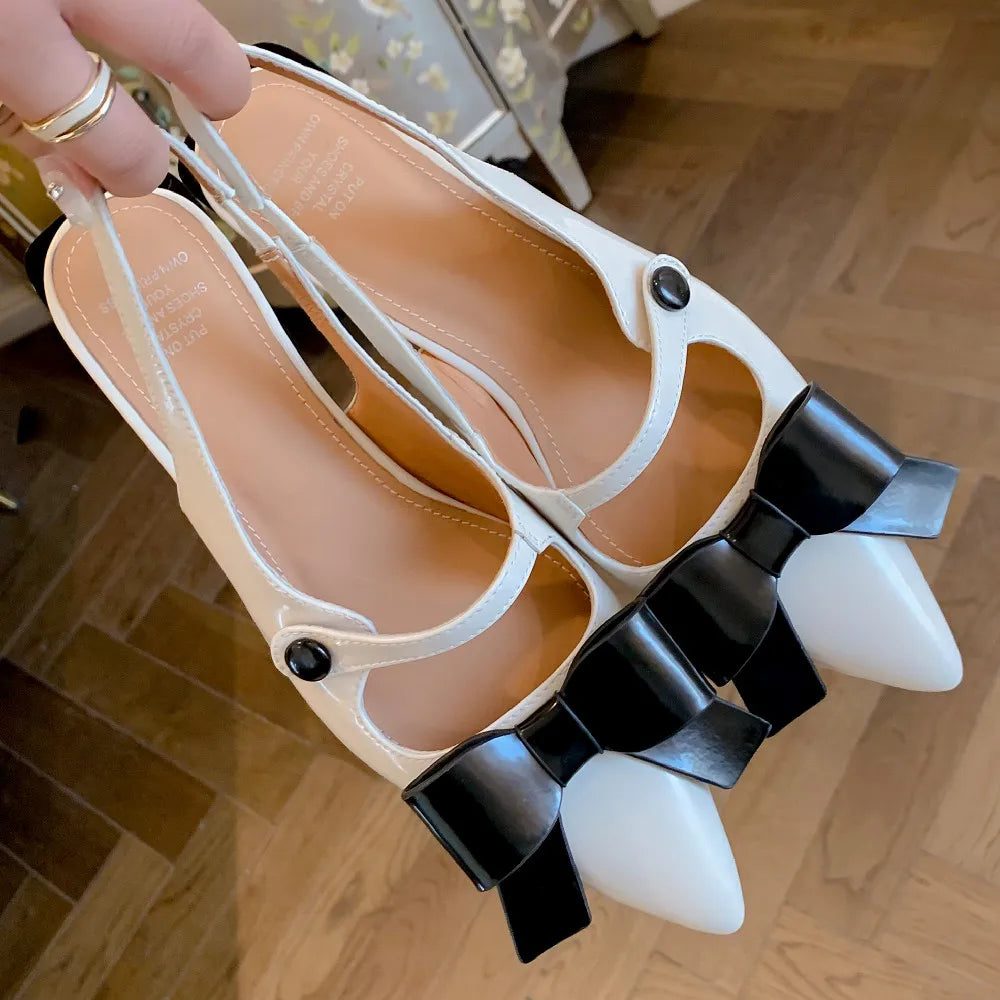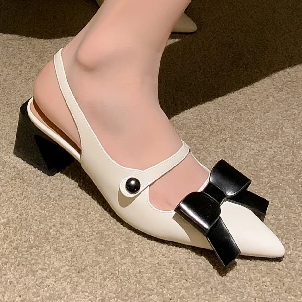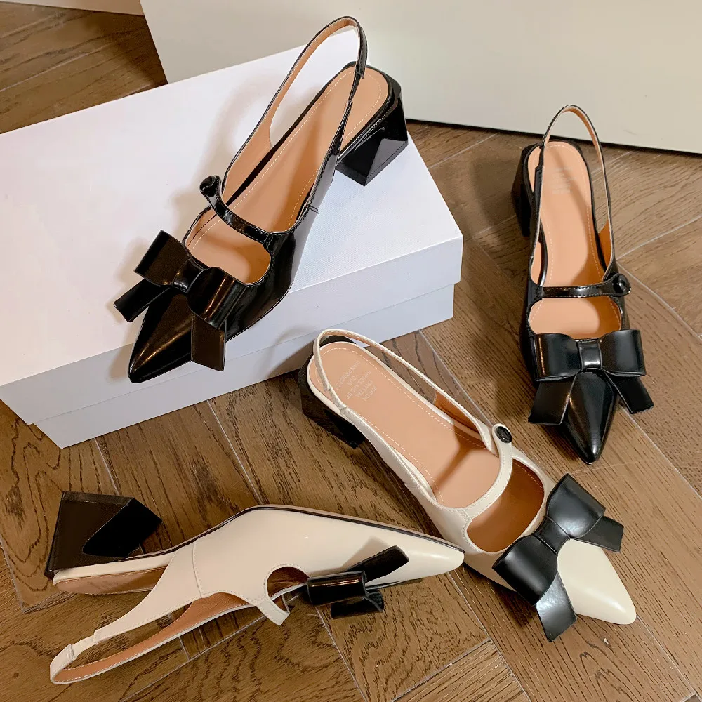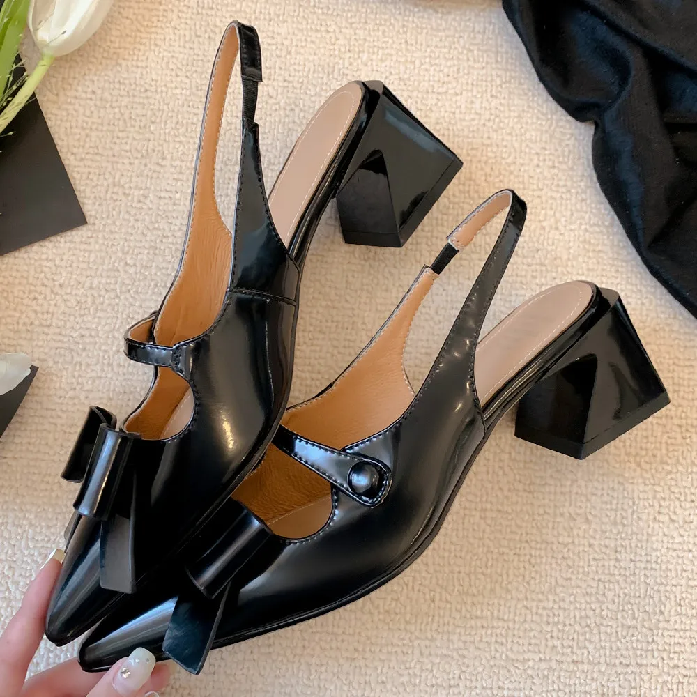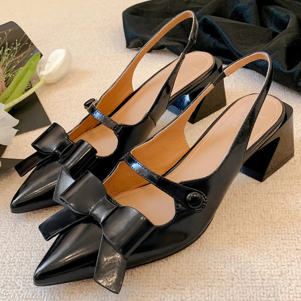 Kylethomasw - Women's genuine leather thick high heel pointed toe slip-on pumps sweet bowtie korean style summer heeled sandals shoes women