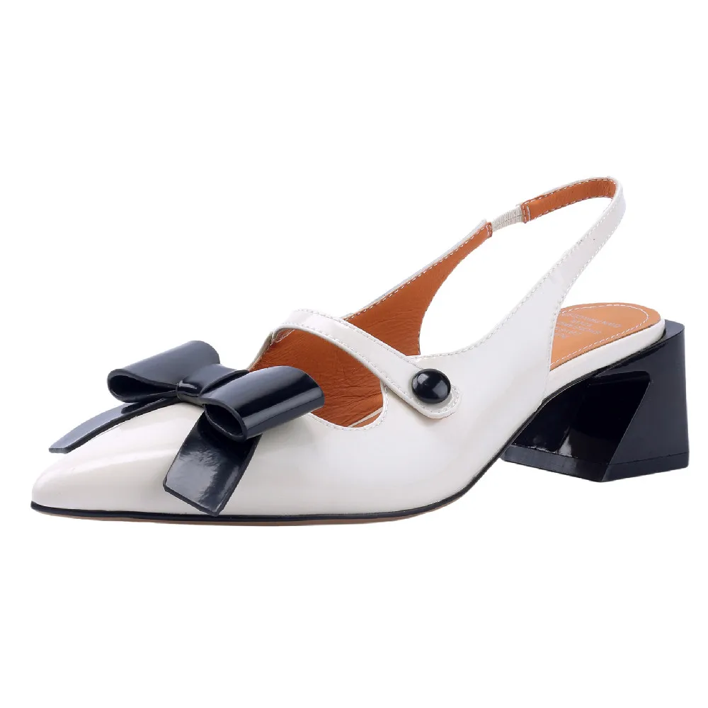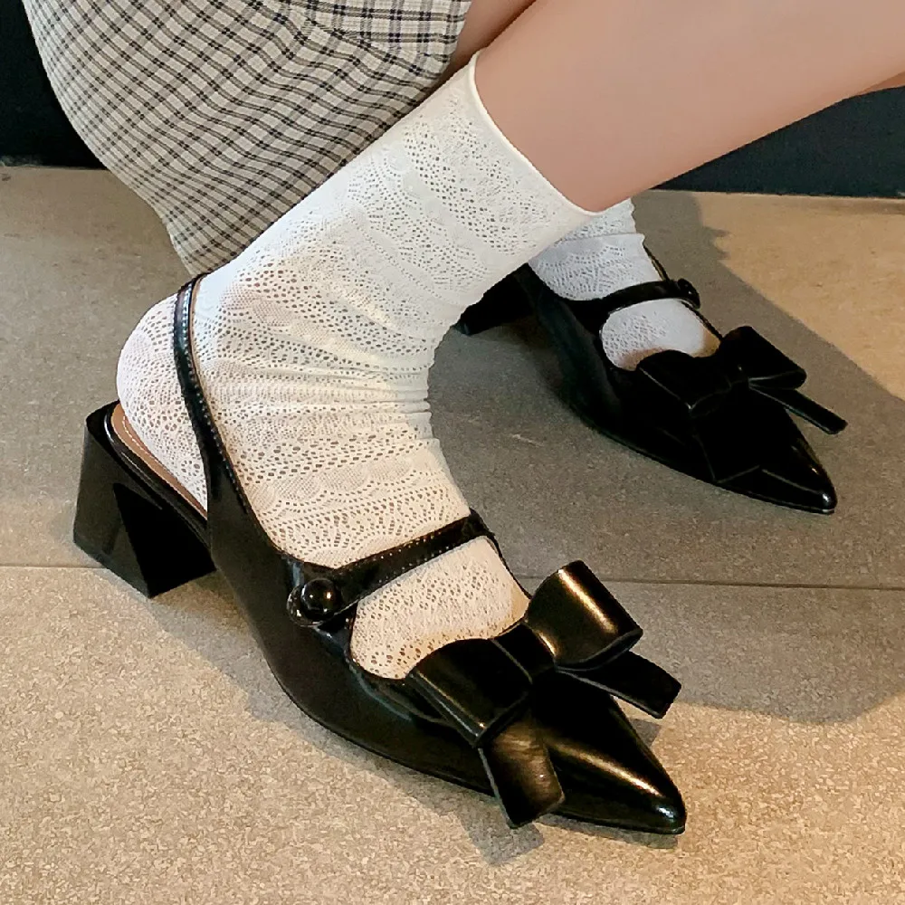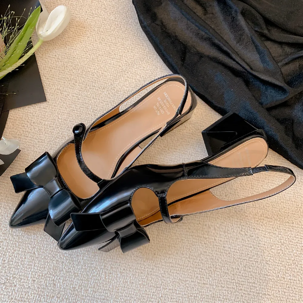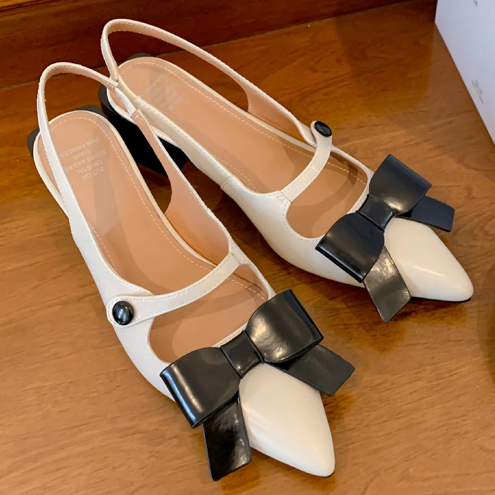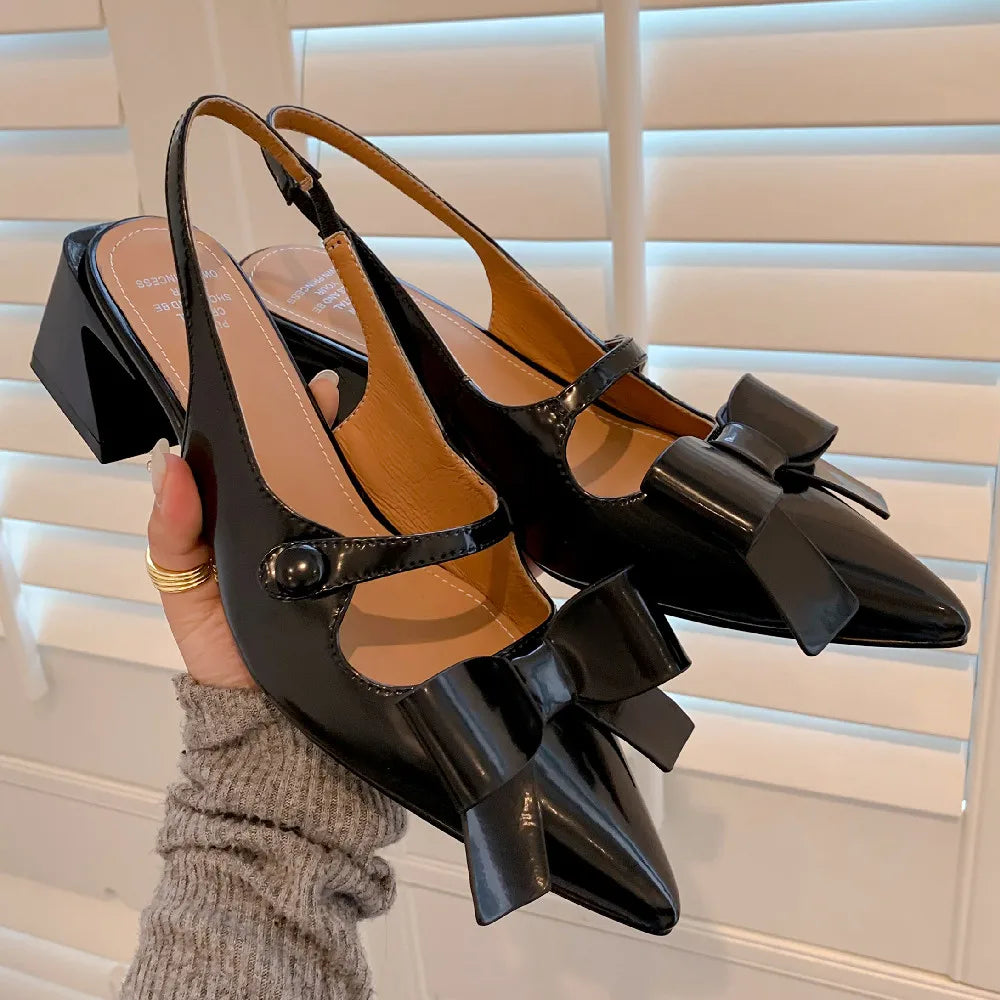 Kylethomasw - Women's genuine leather thick high heel pointed toe slip-on pumps sweet bowtie korean style summer heeled sandals shoes women