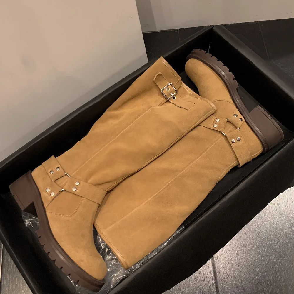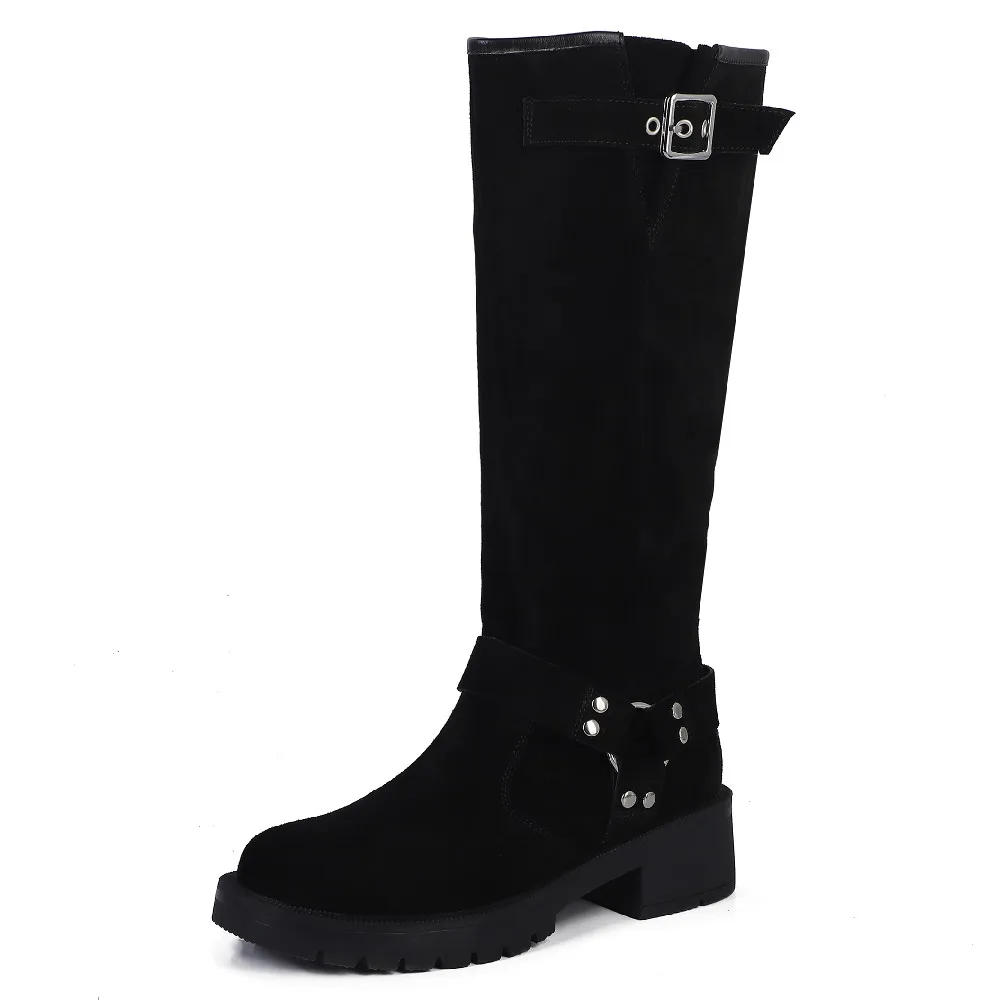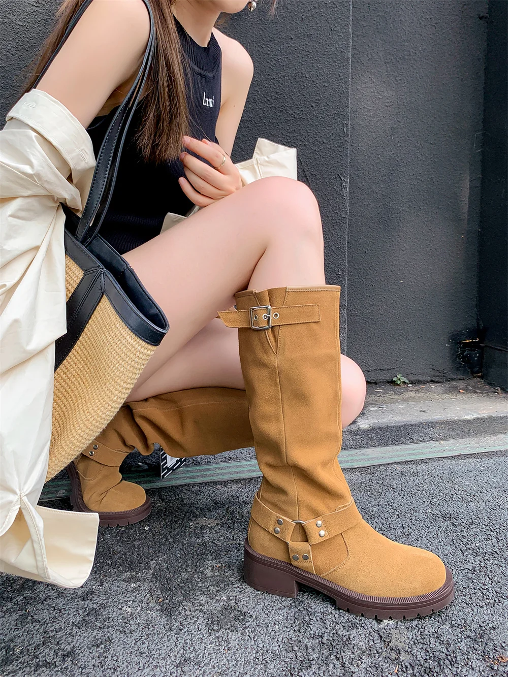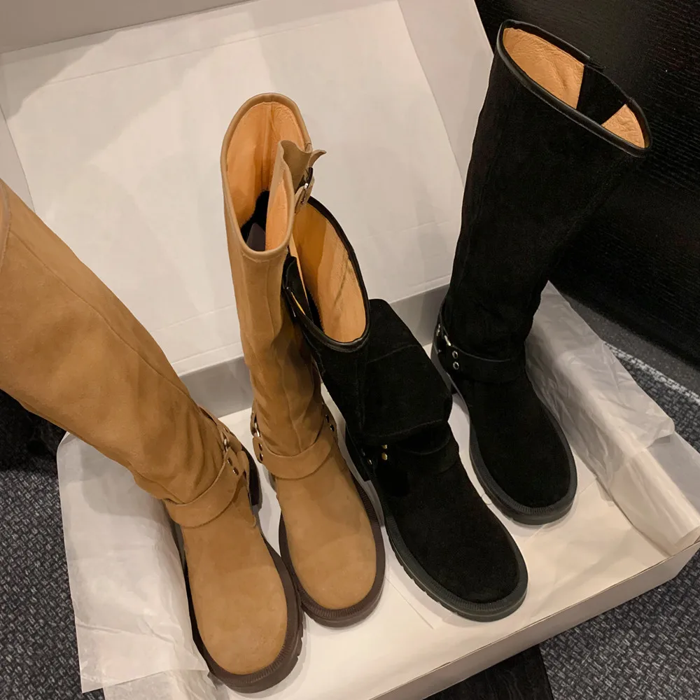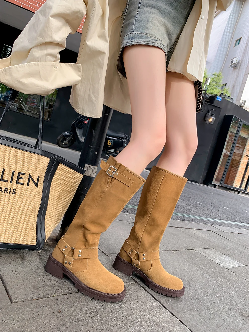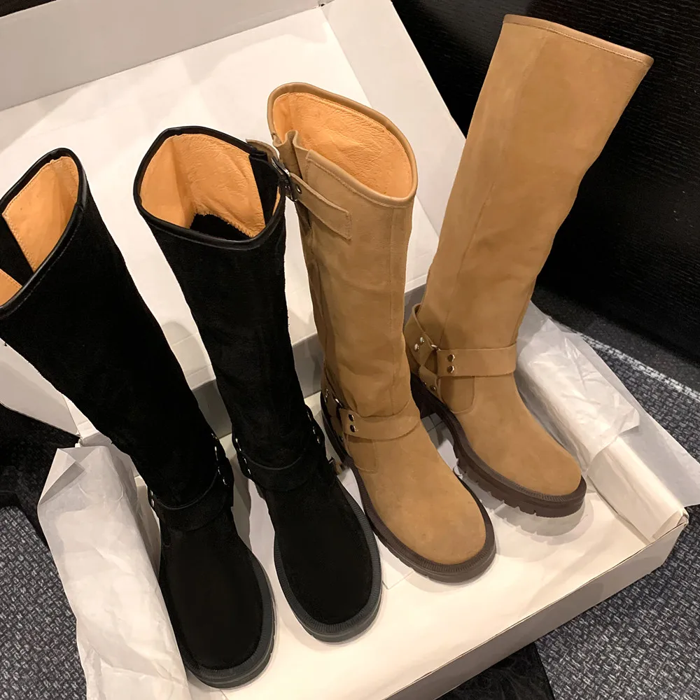 Kylethomasw - Women's natural suede leather slip-on autumn knee high boots thick sole platform flats winter long boots metal buckle punk shoes