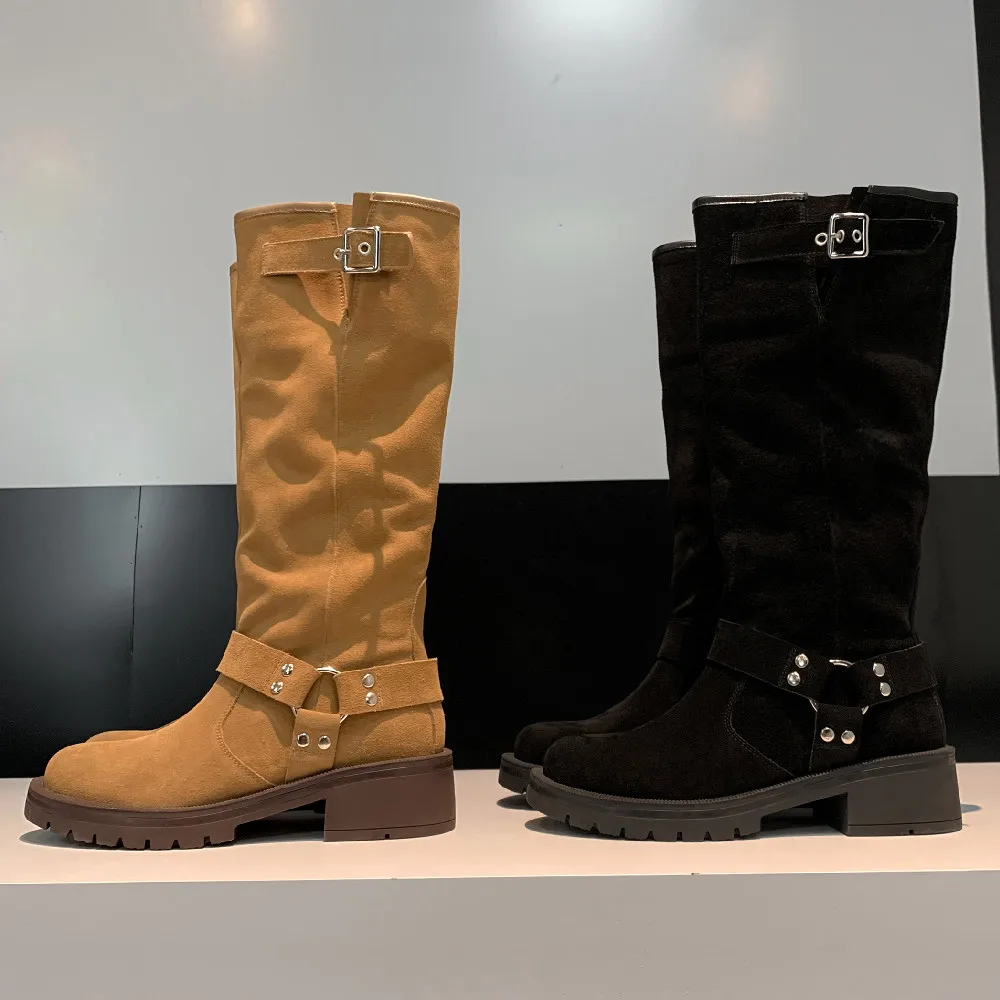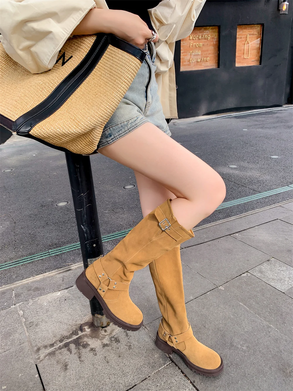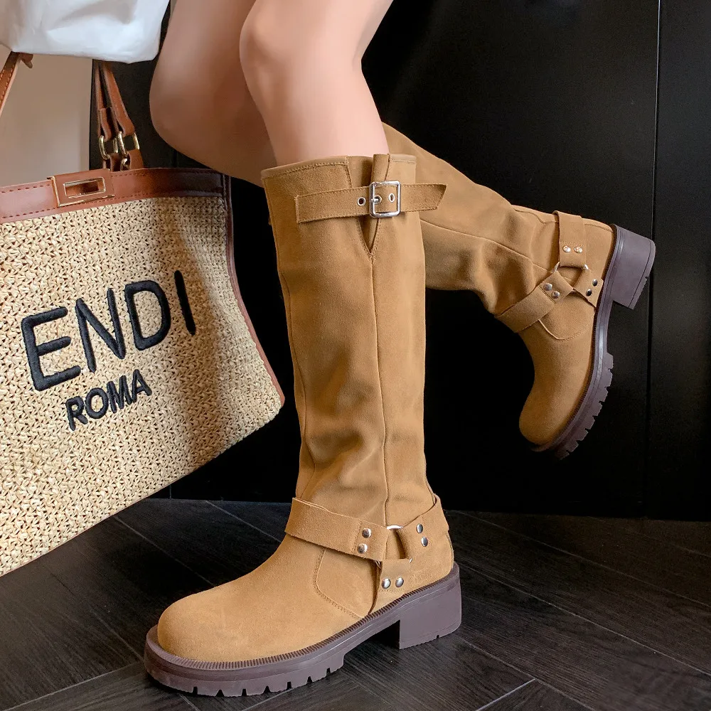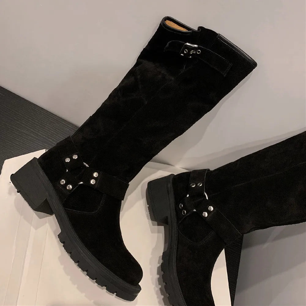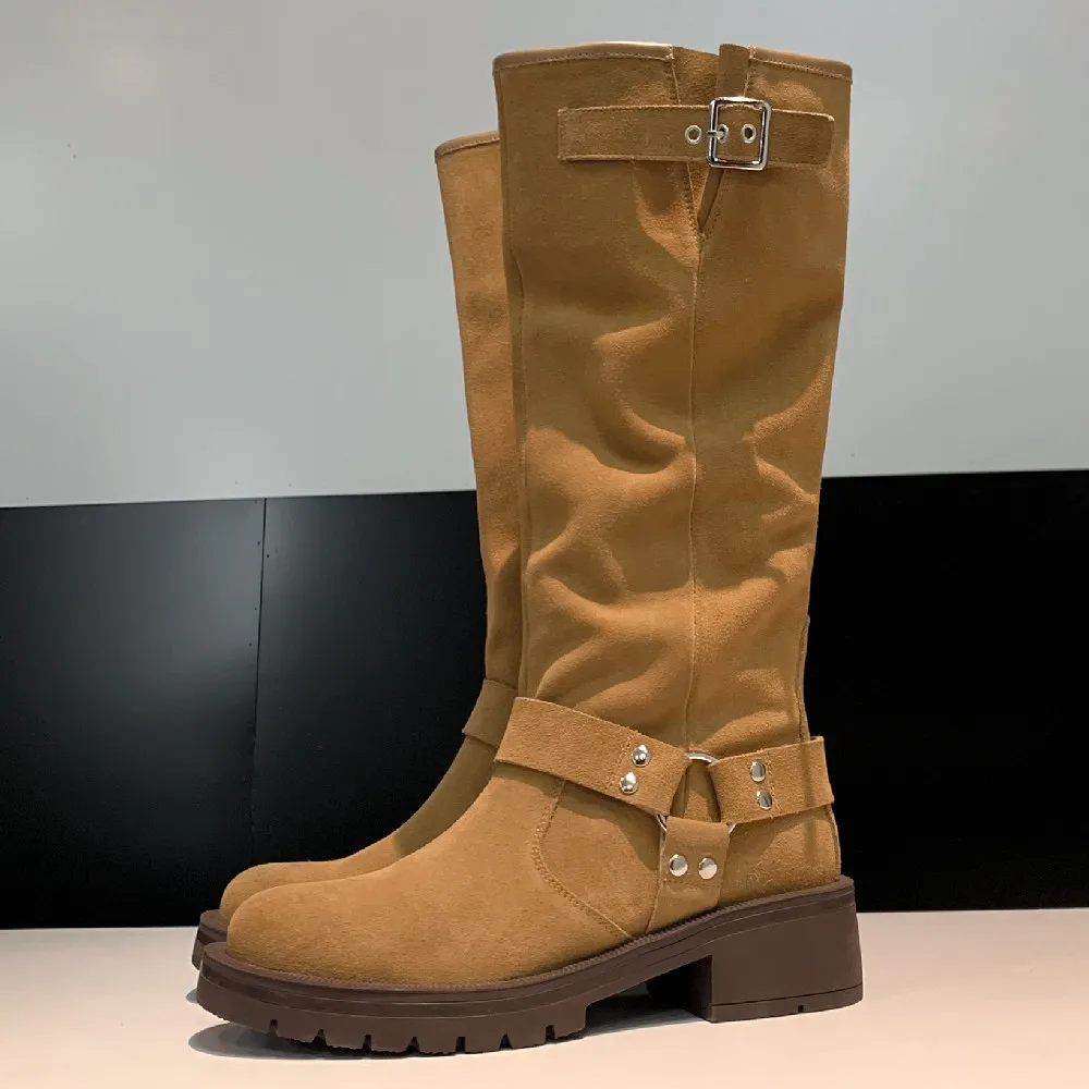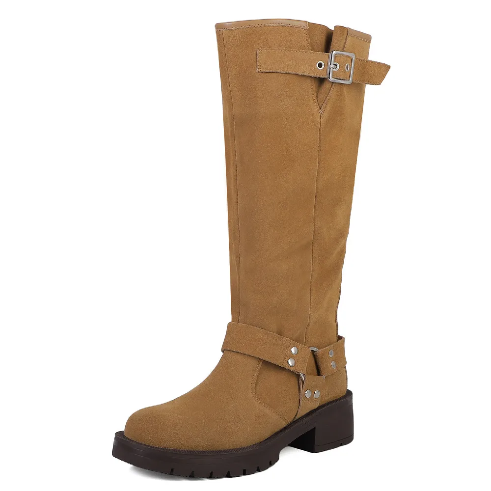 Kylethomasw - Women's natural suede leather slip-on autumn knee high boots thick sole platform flats winter long boots metal buckle punk shoes