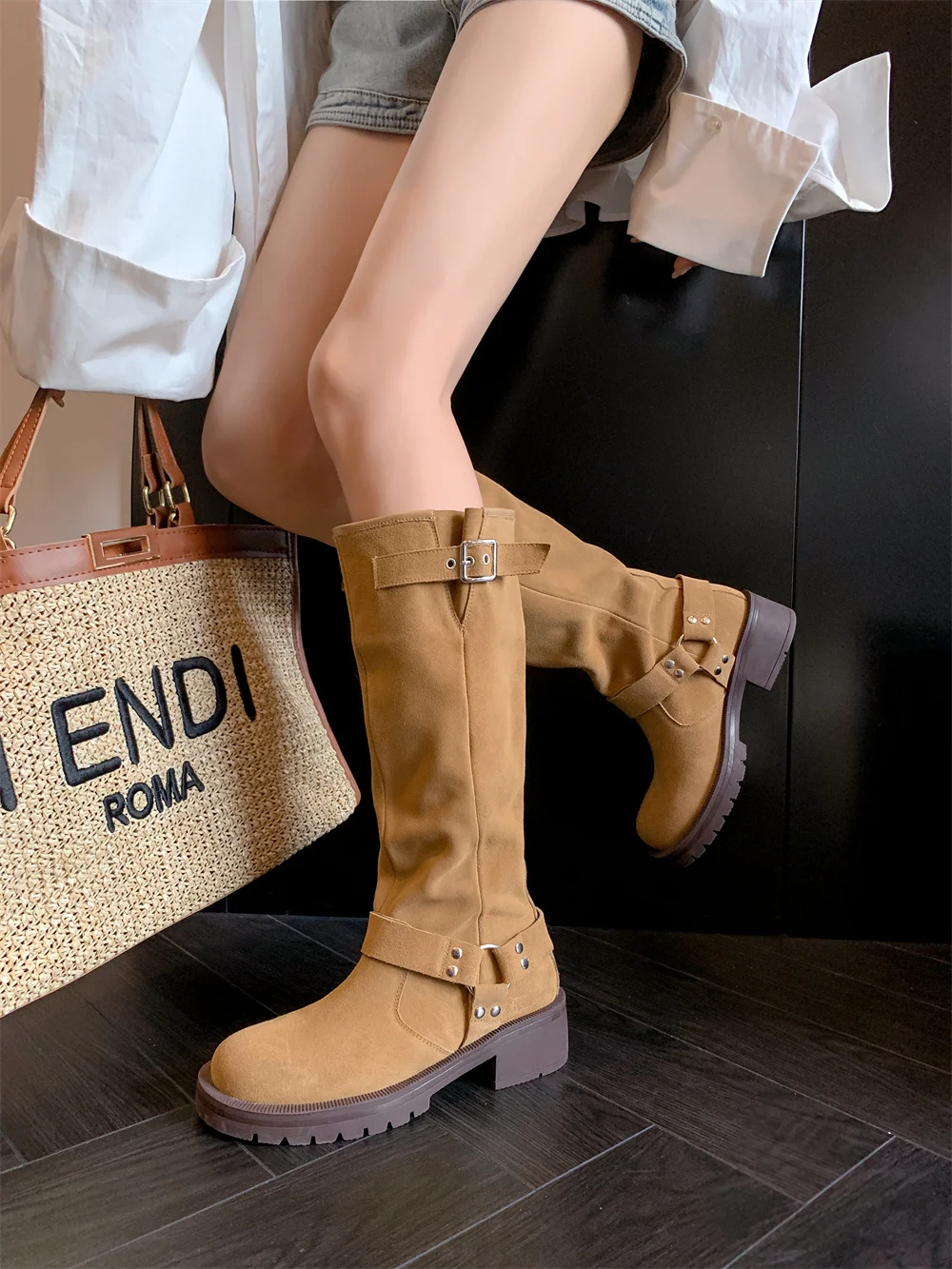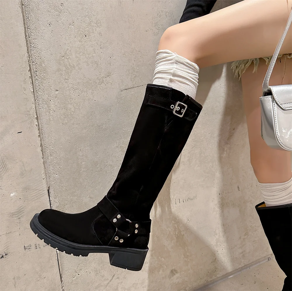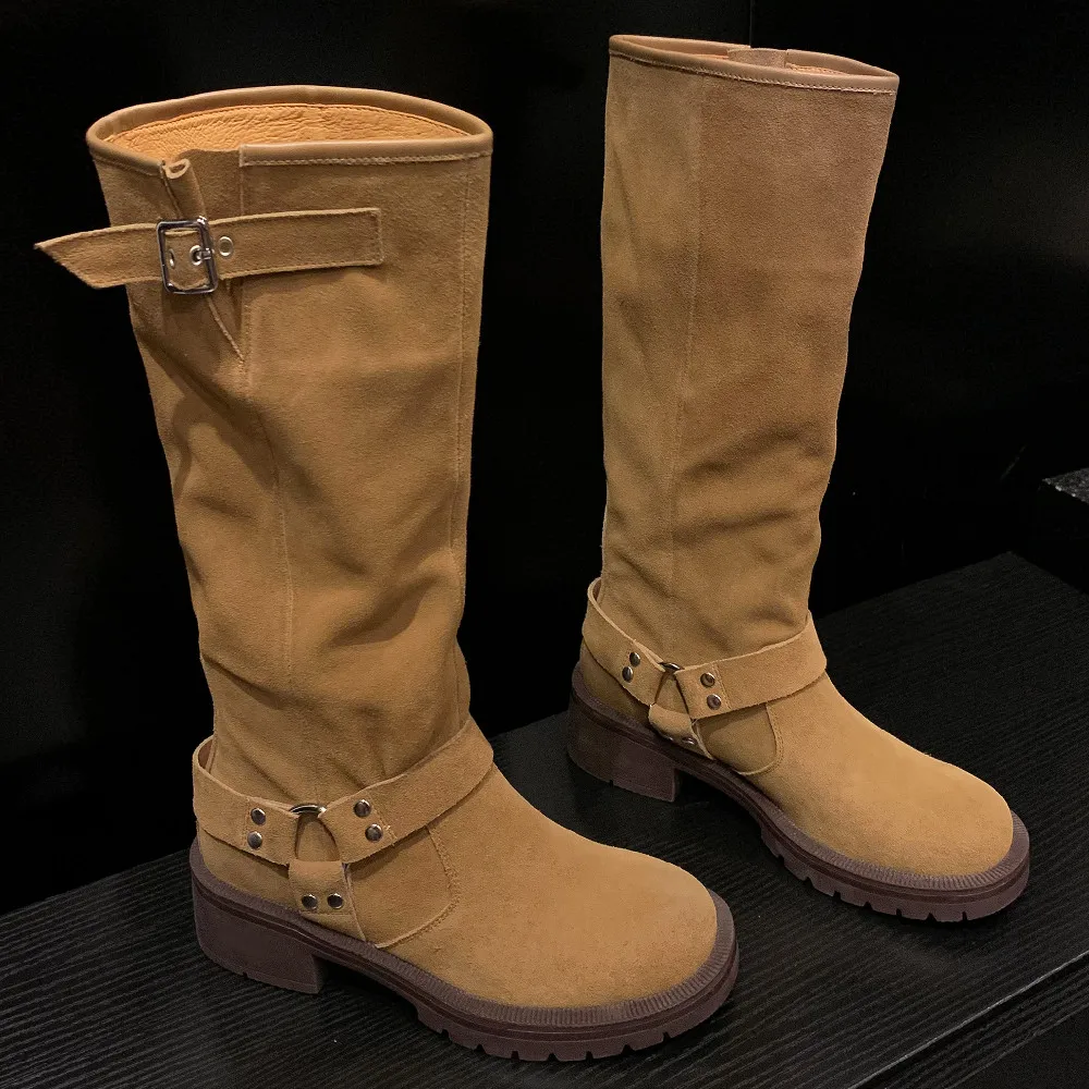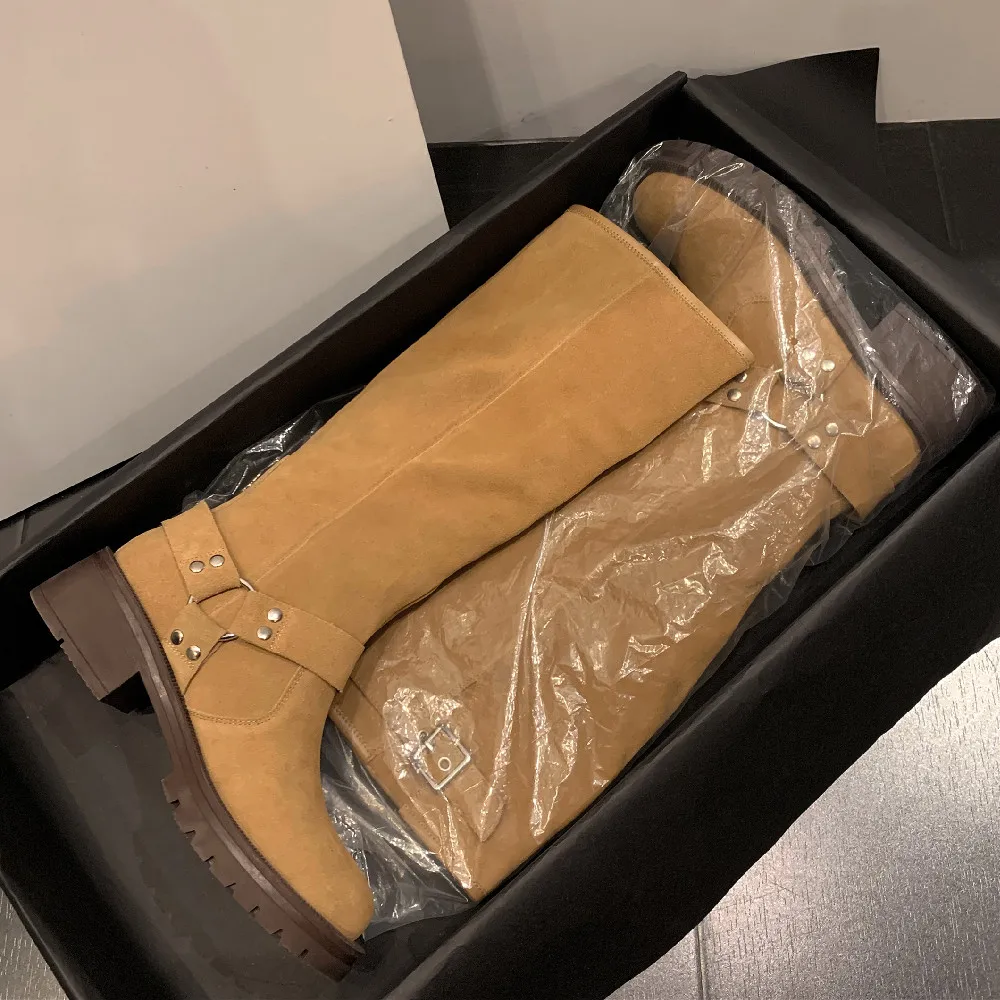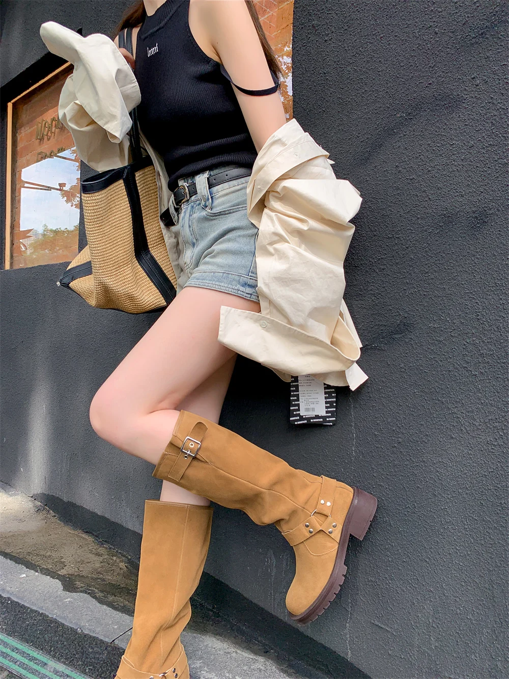 Kylethomasw - Women's natural suede leather slip-on autumn knee high boots thick sole platform flats winter long boots metal buckle punk shoes