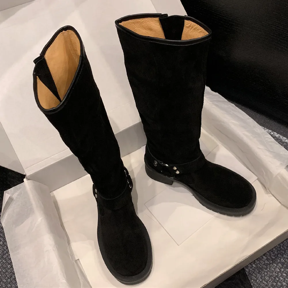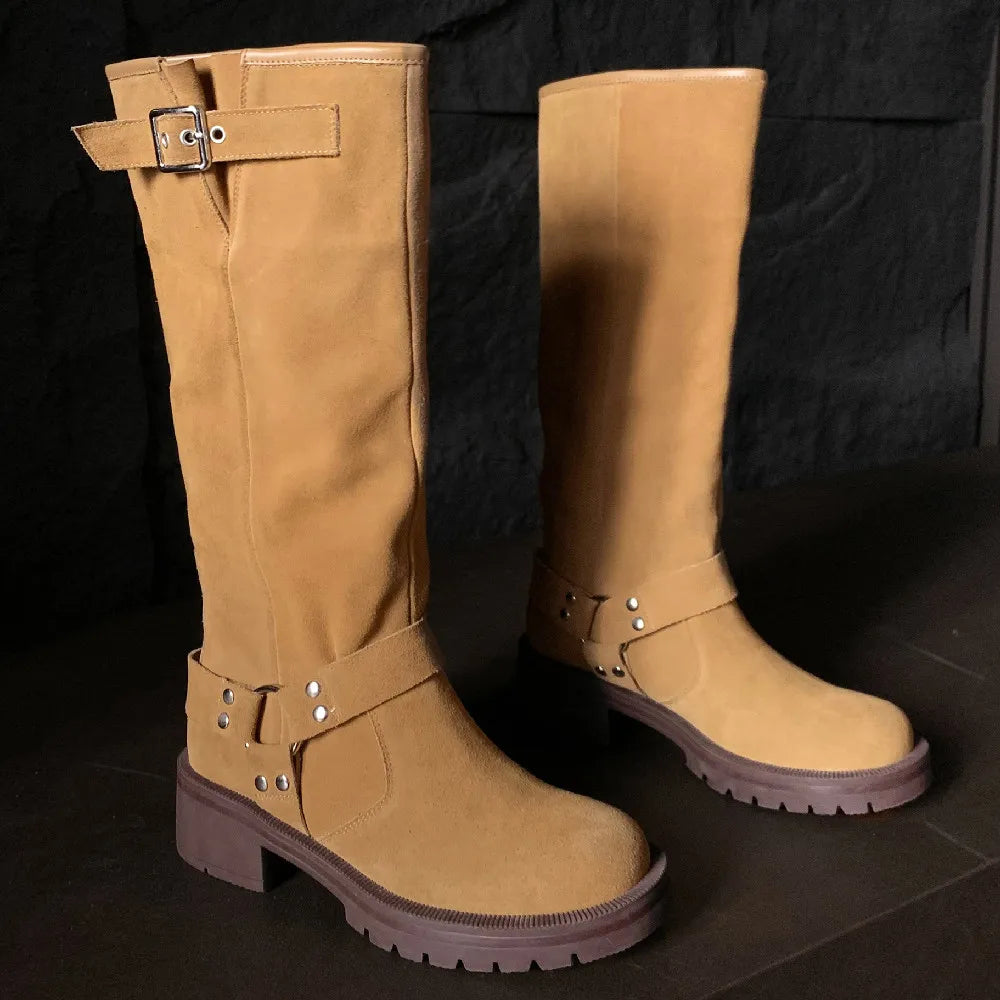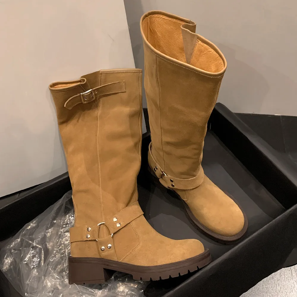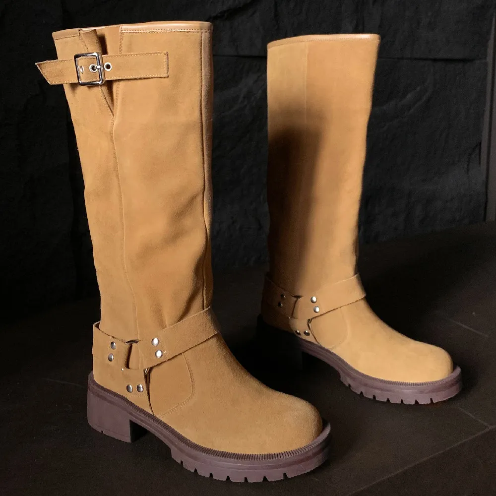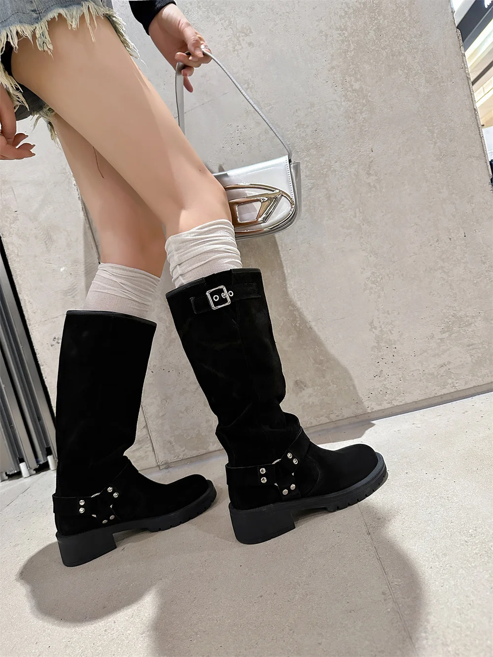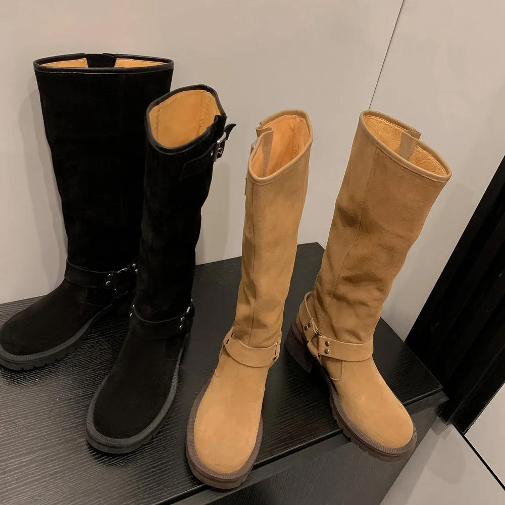 Kylethomasw - Women's natural suede leather slip-on autumn knee high boots thick sole platform flats winter long boots metal buckle punk shoes