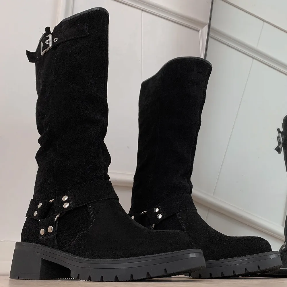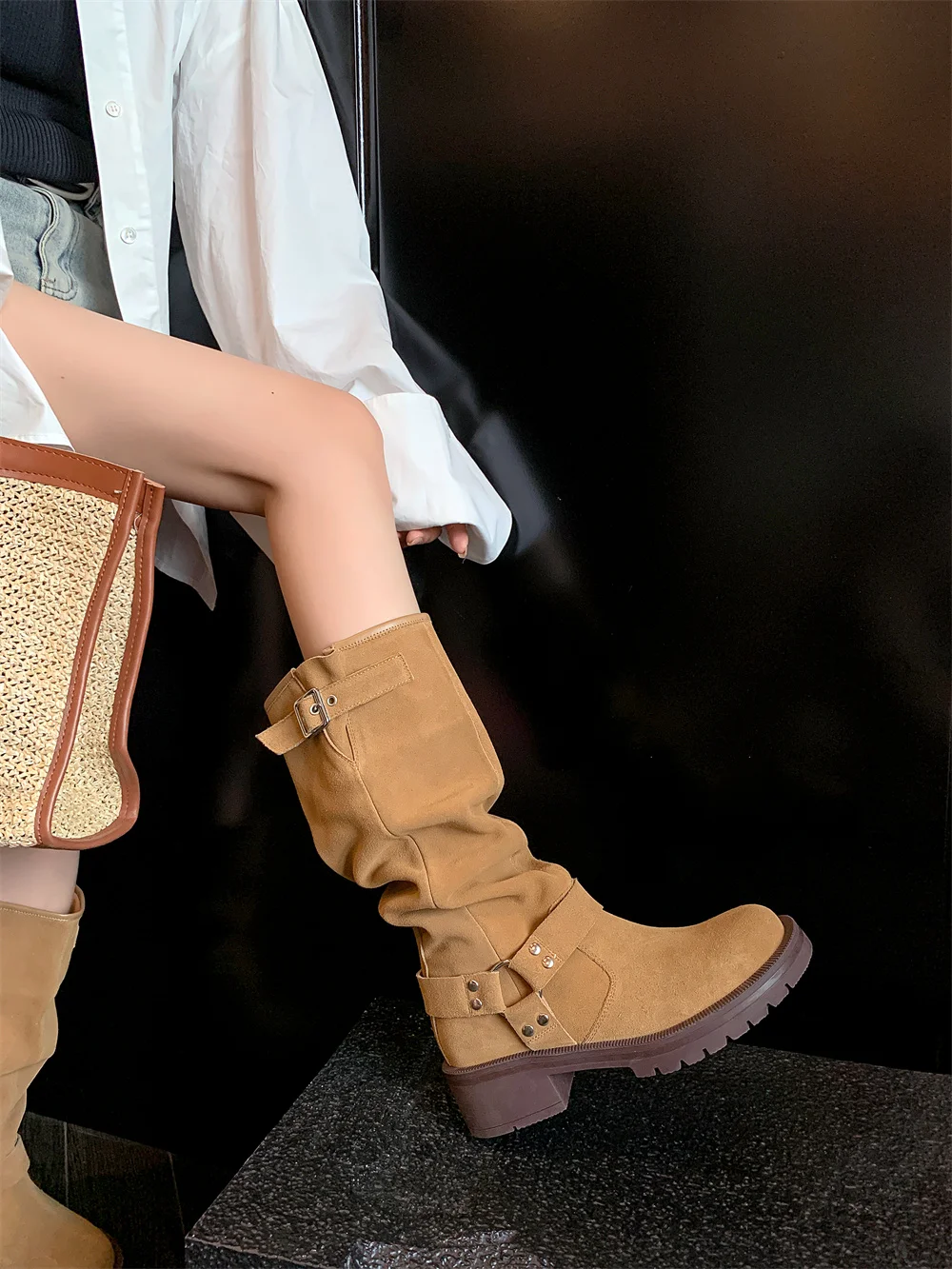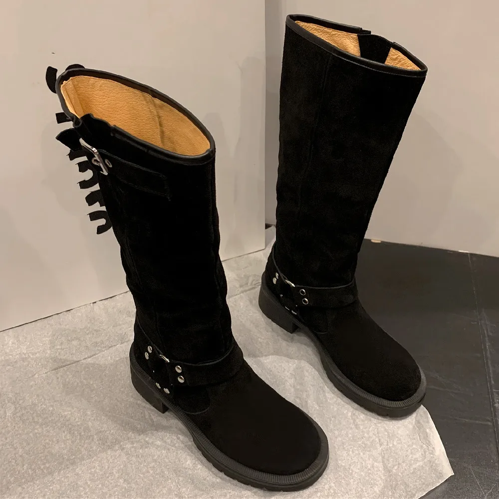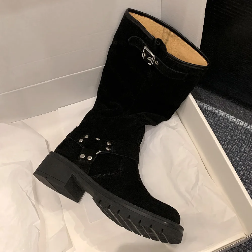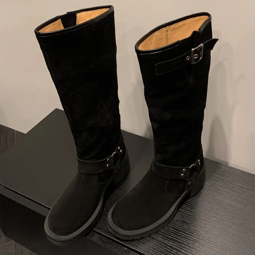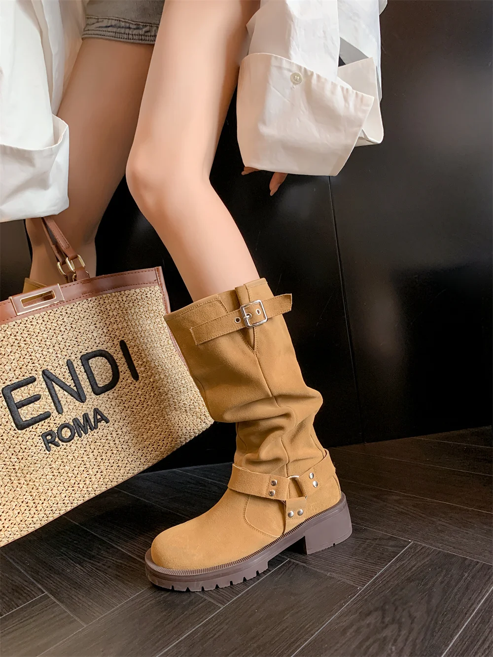 Kylethomasw - Women's natural suede leather slip-on autumn knee high boots thick sole platform flats winter long boots metal buckle punk shoes