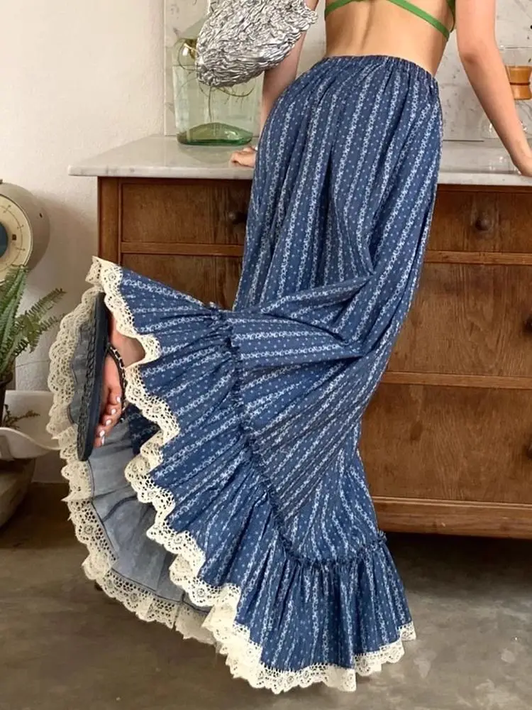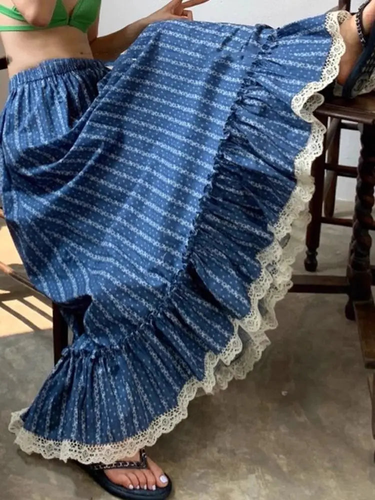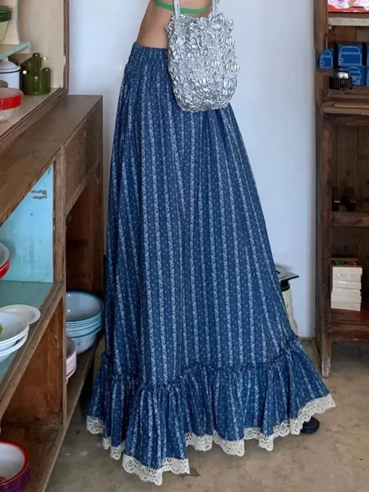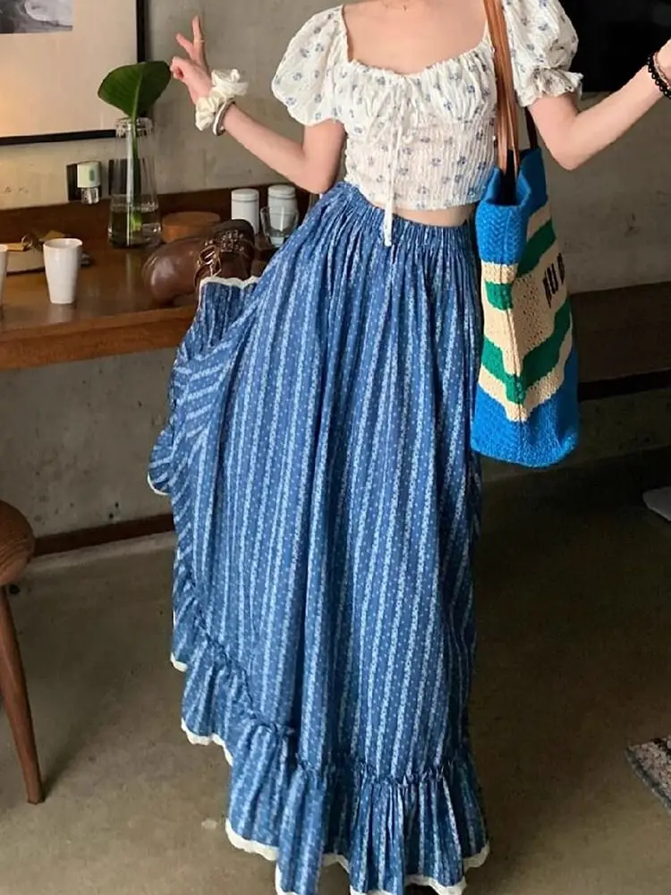 Blue and White Stripe Retro Half Skirt Summer 2024 New Fashion Spliced Lace High Waist Slimming Beach Style Long Skirt for Women