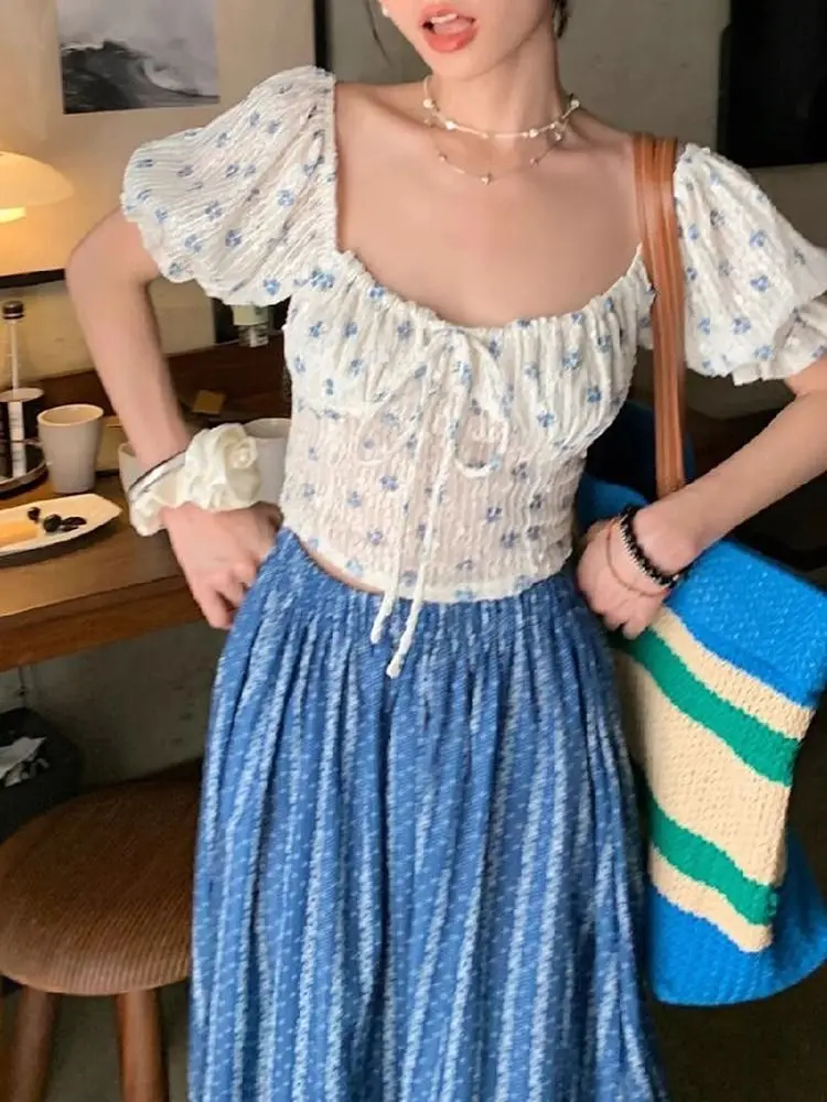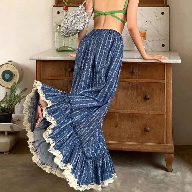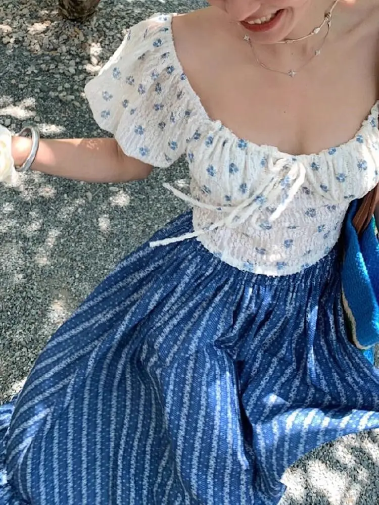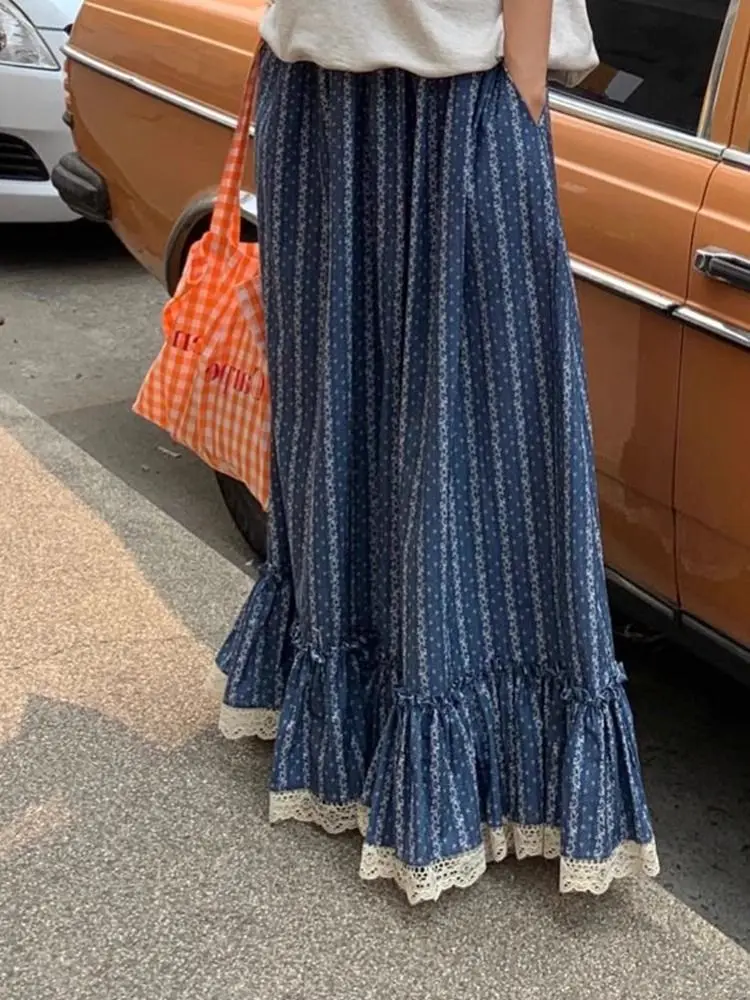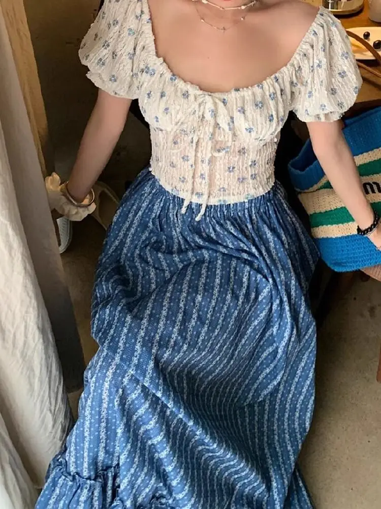 Blue and White Stripe Retro Half Skirt Summer 2024 New Fashion Spliced Lace High Waist Slimming Beach Style Long Skirt for Women