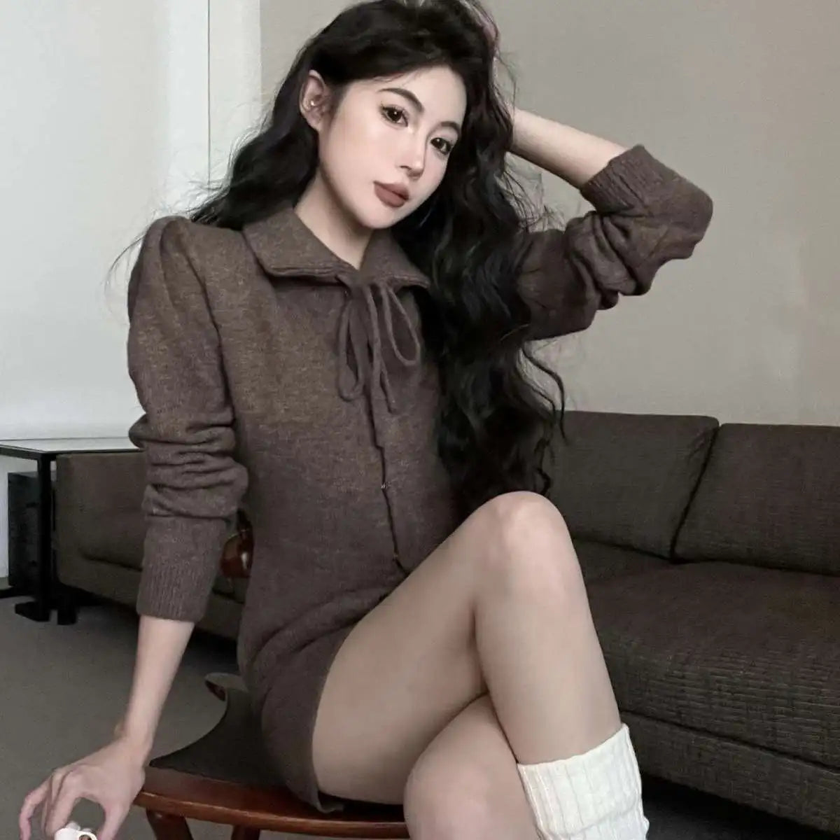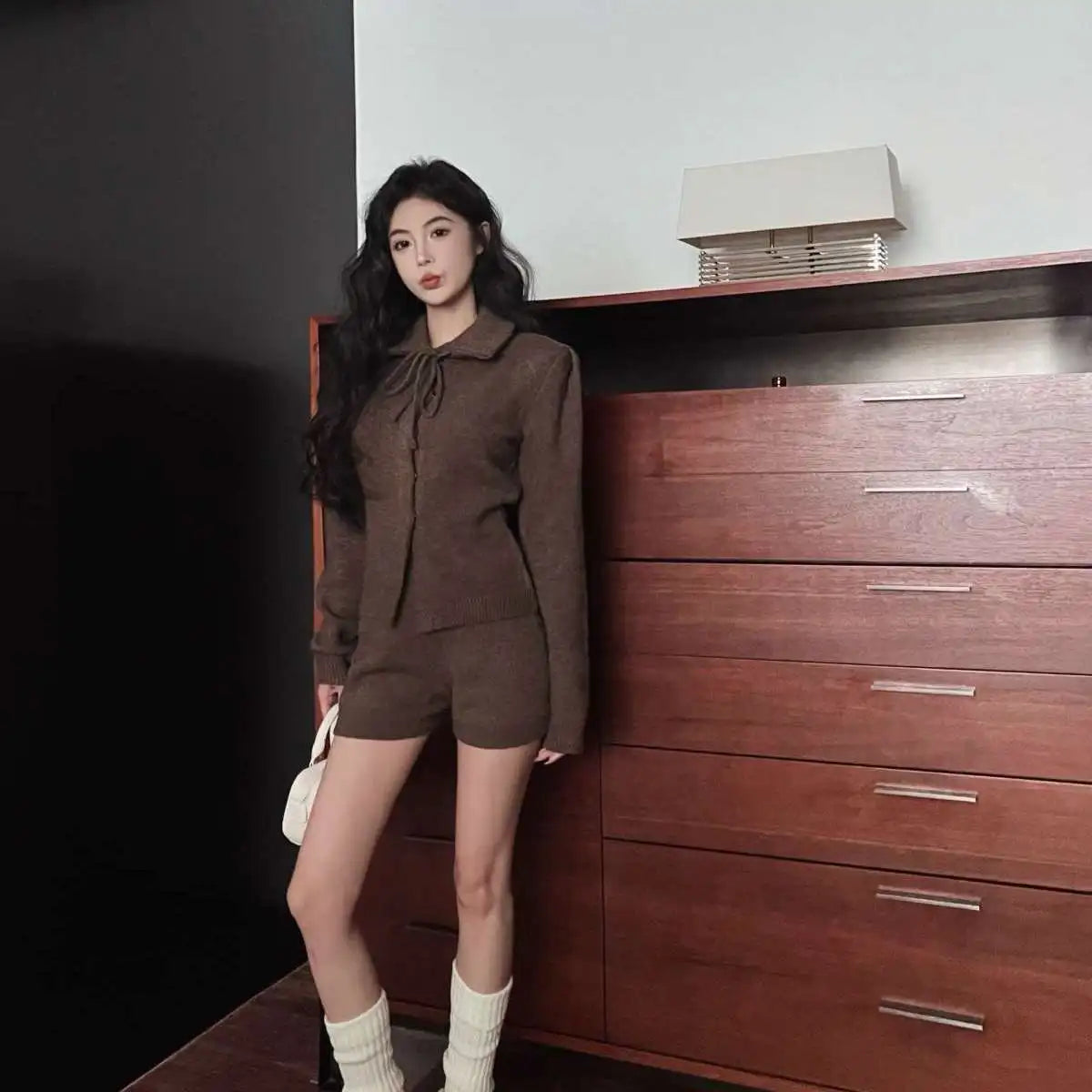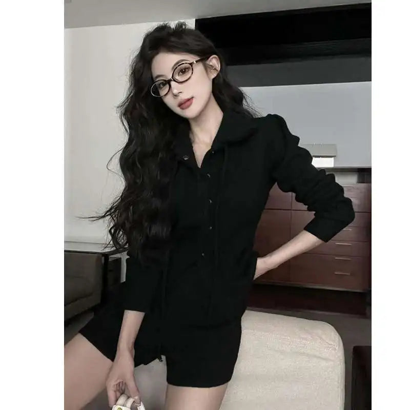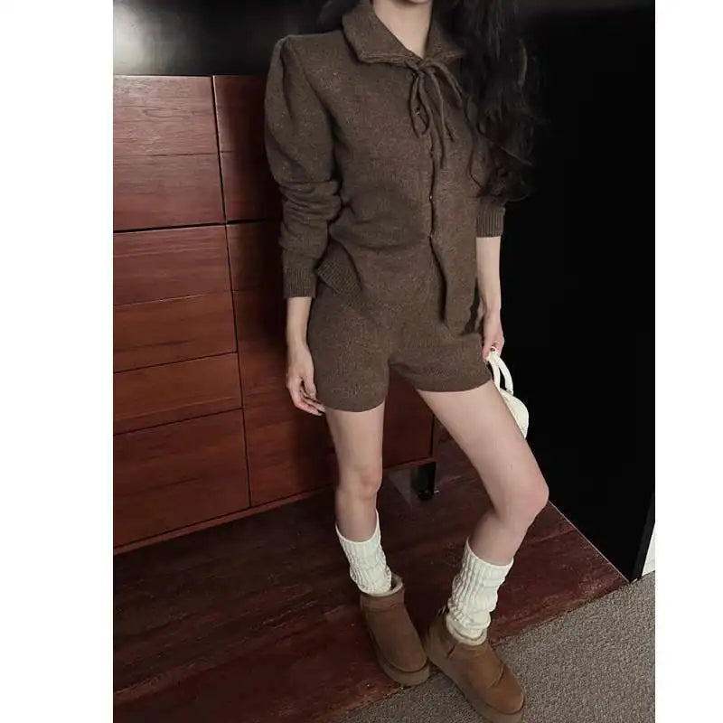 KYLTHOMASW - Sweet Hot Girl Casual Suit Women's Spring Turn-down Collar Knitted Cardigan High Waisted Shorts Two-piece Set Female Clothes