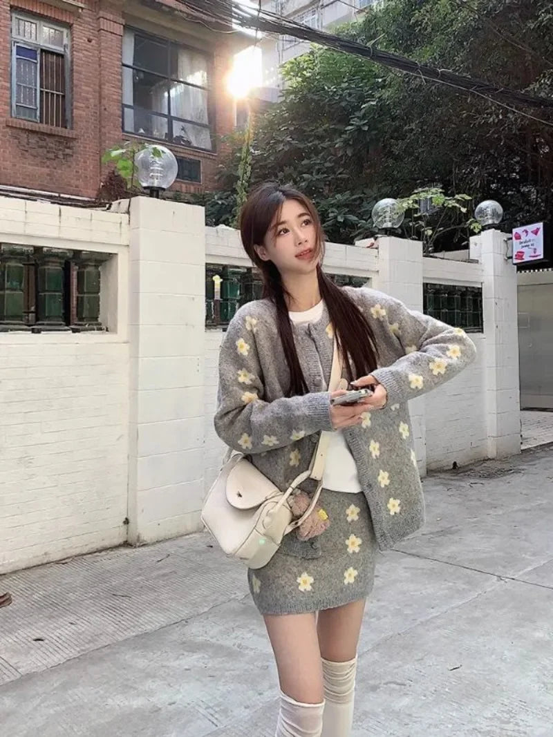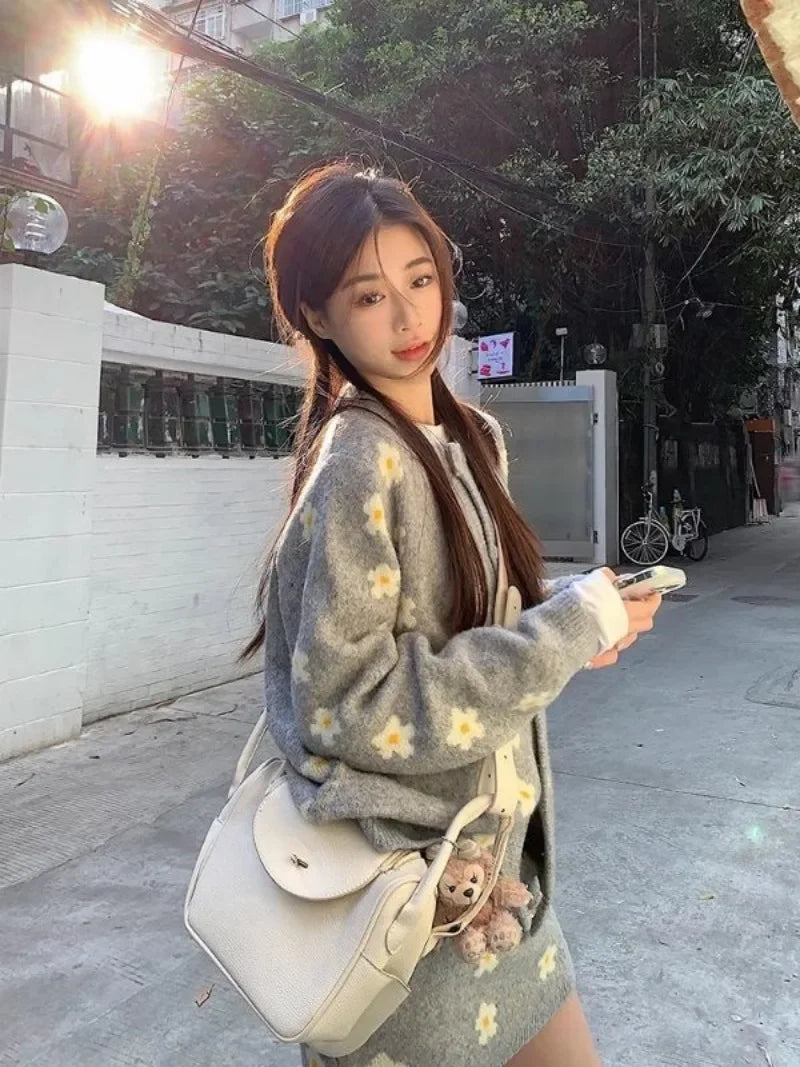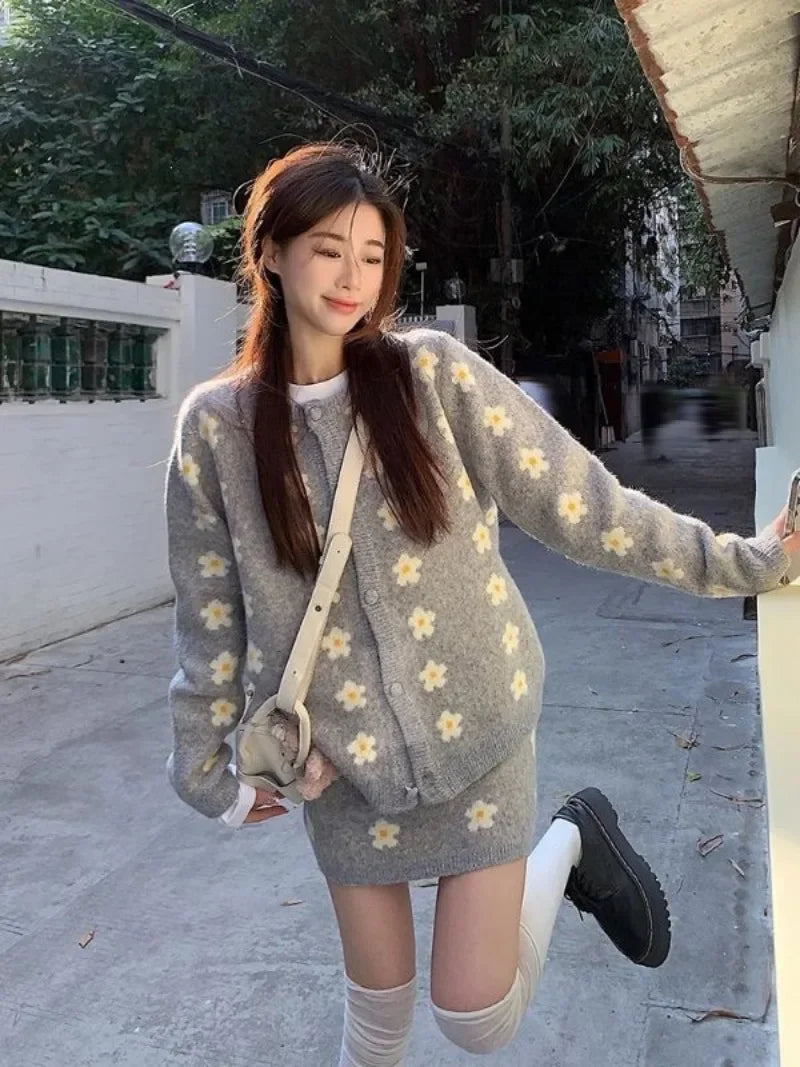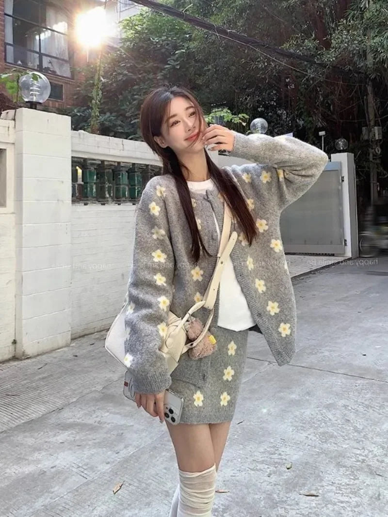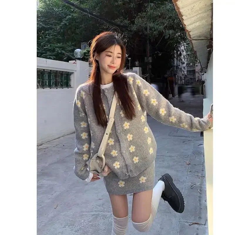 KYLTHOMASW - Sweet Hot Girl Knitted Suit Women's Autumn and Winter O-neck Loose Cardigan Wrap Hip Skirt Two-piece Set Fashion Female Clothes