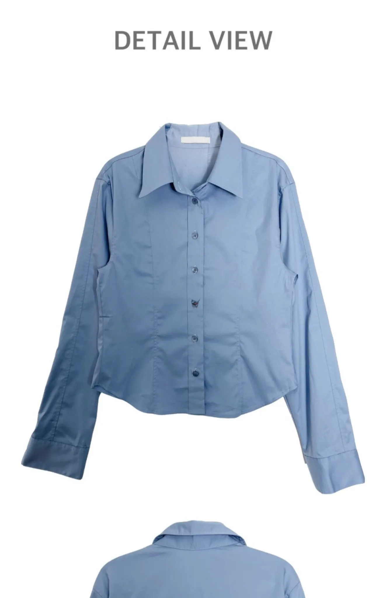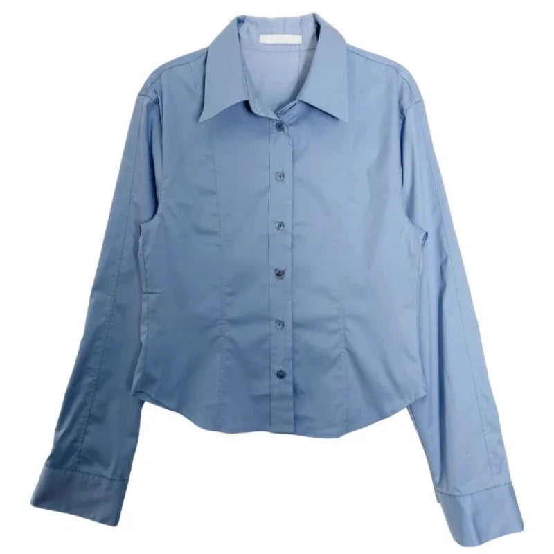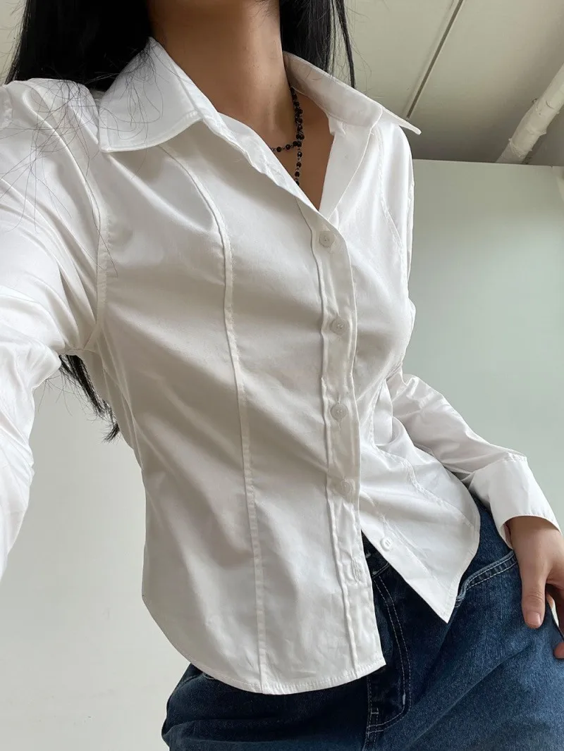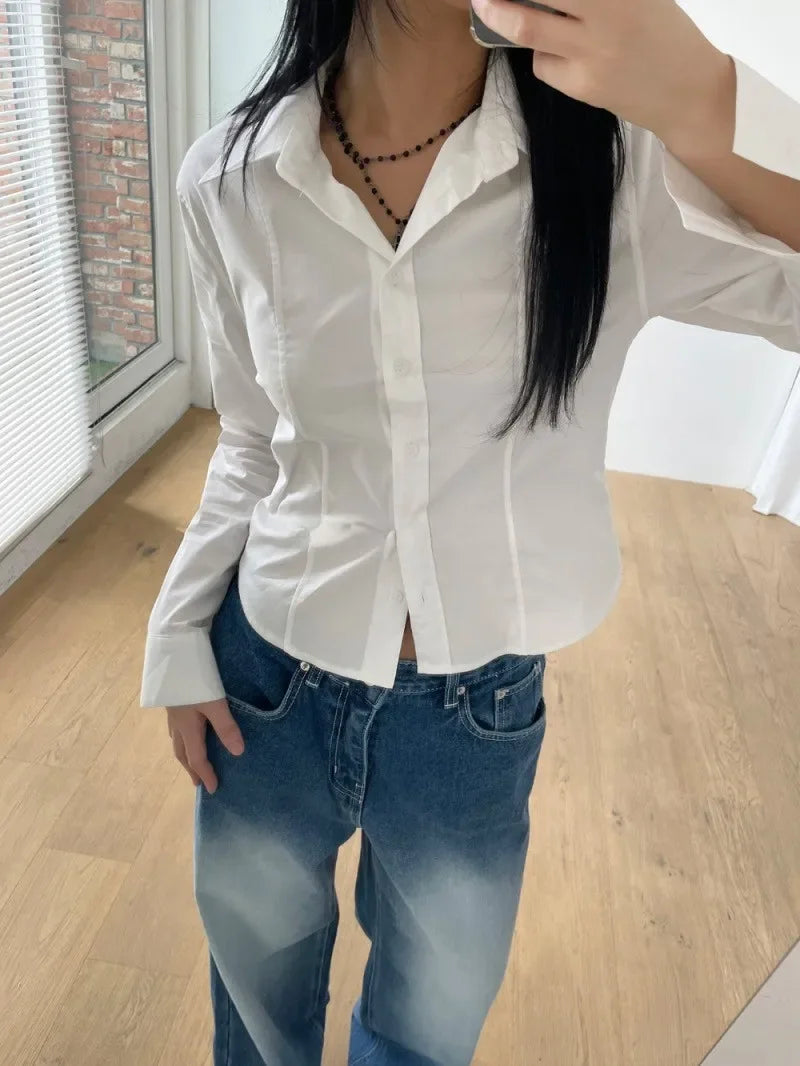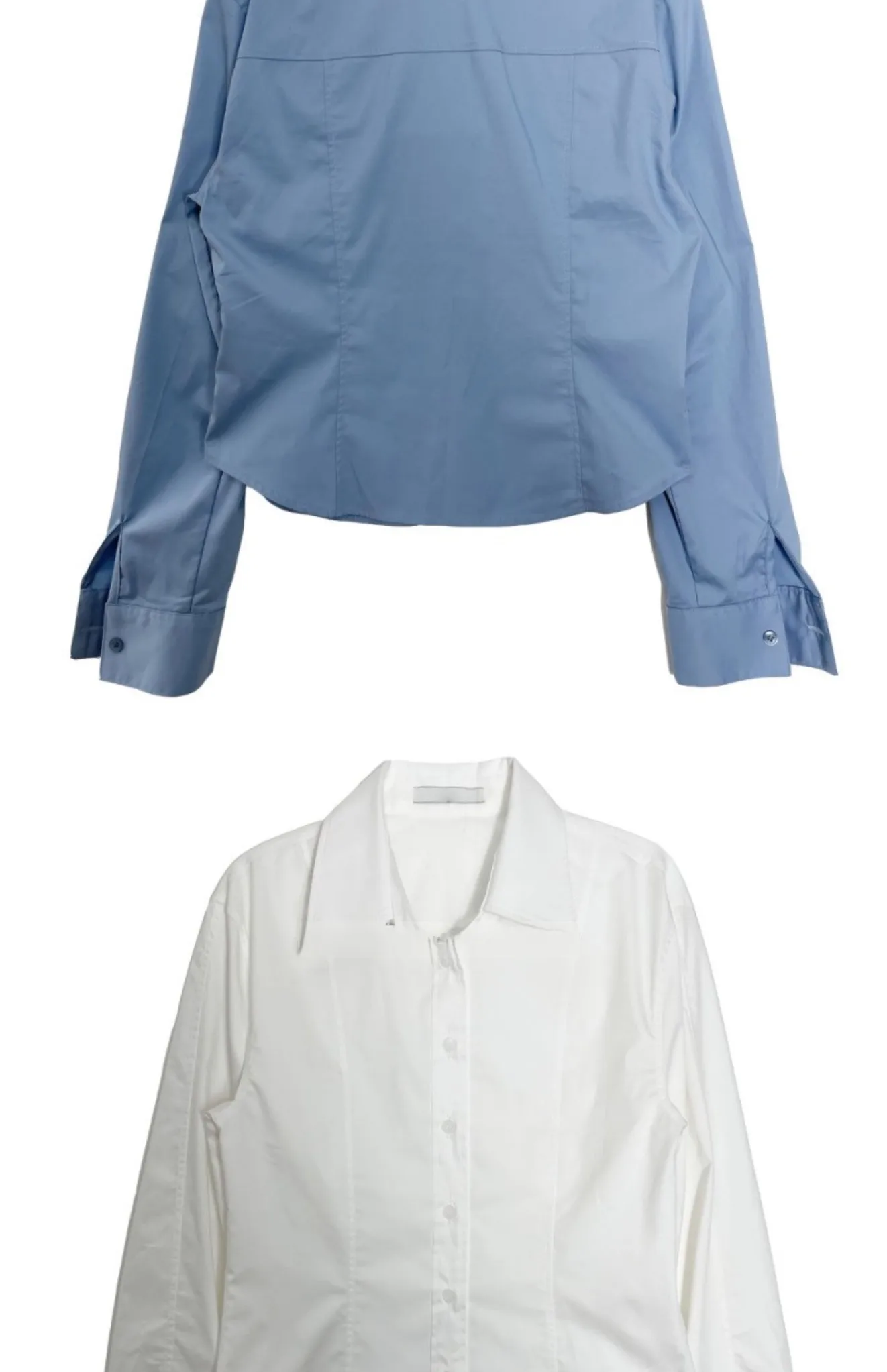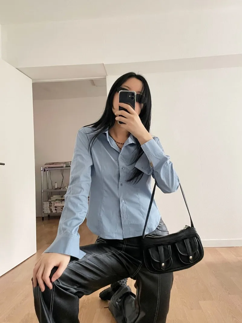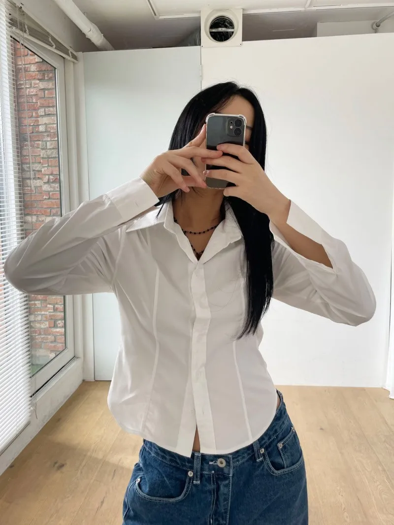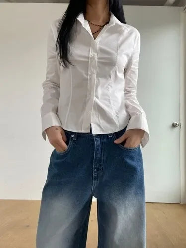 KYLTHOMASW - Women Shirts 2024 Autumn Long Sleeve Polo Neck Blouse Pattern Embroidery White Blue Chic Casual Streetwear Tops