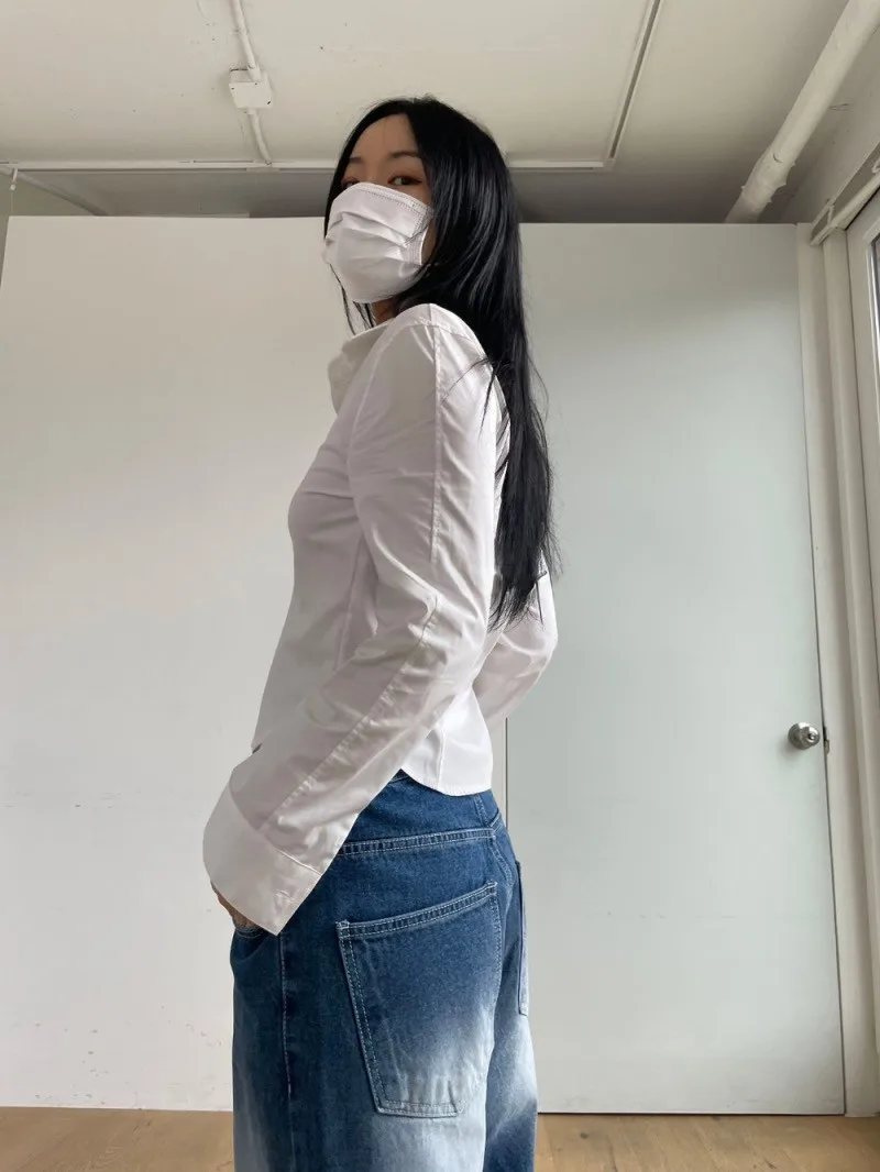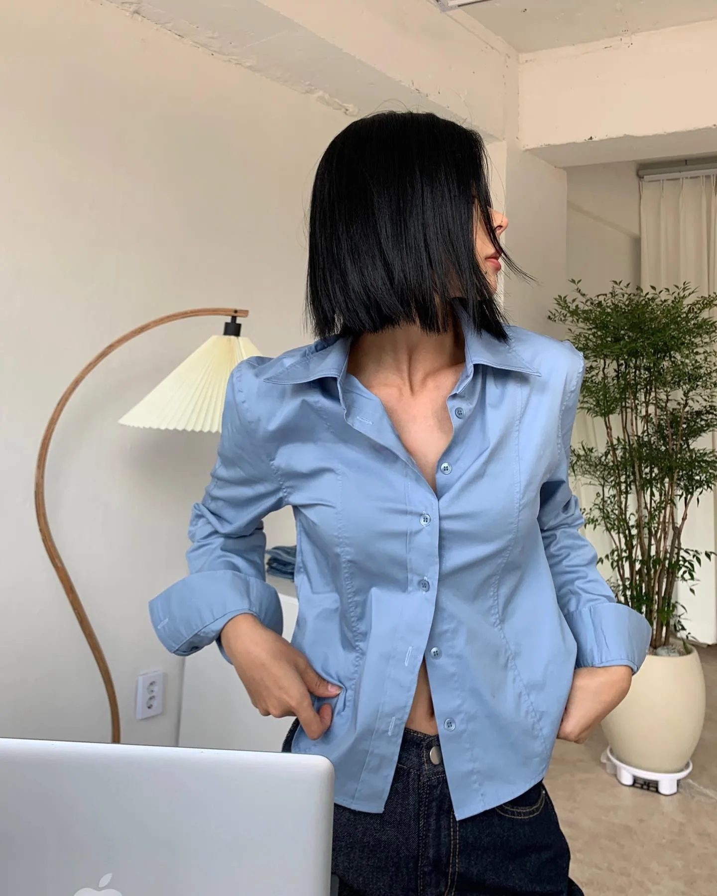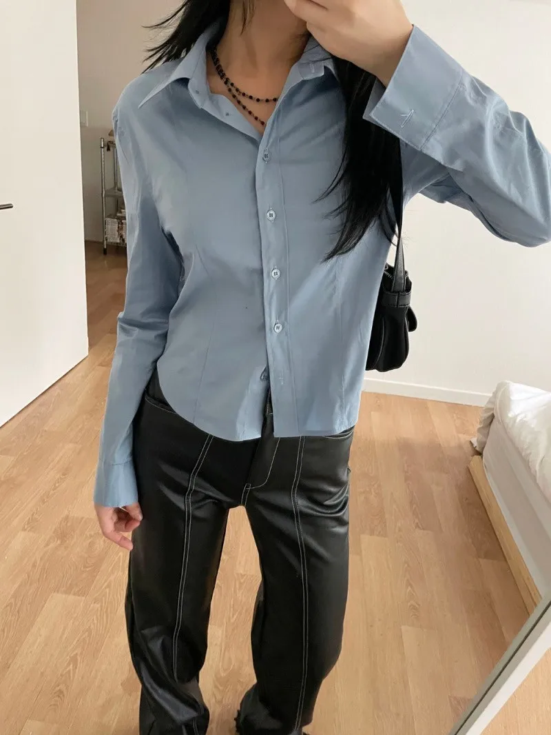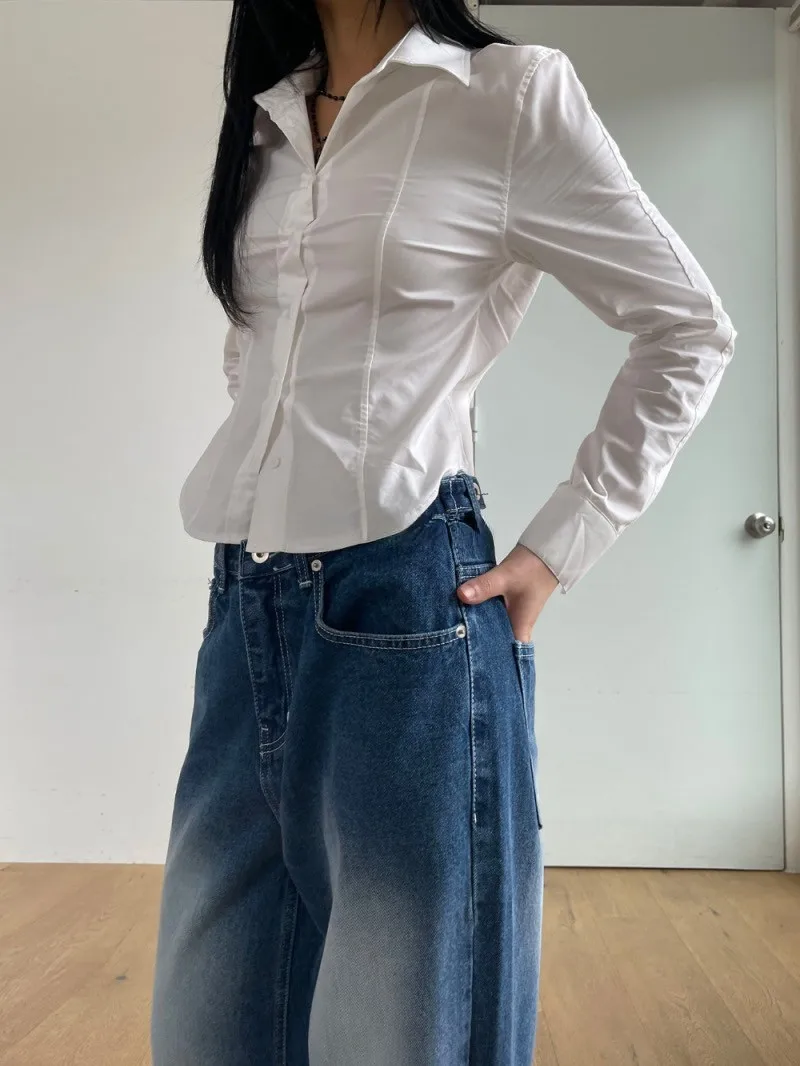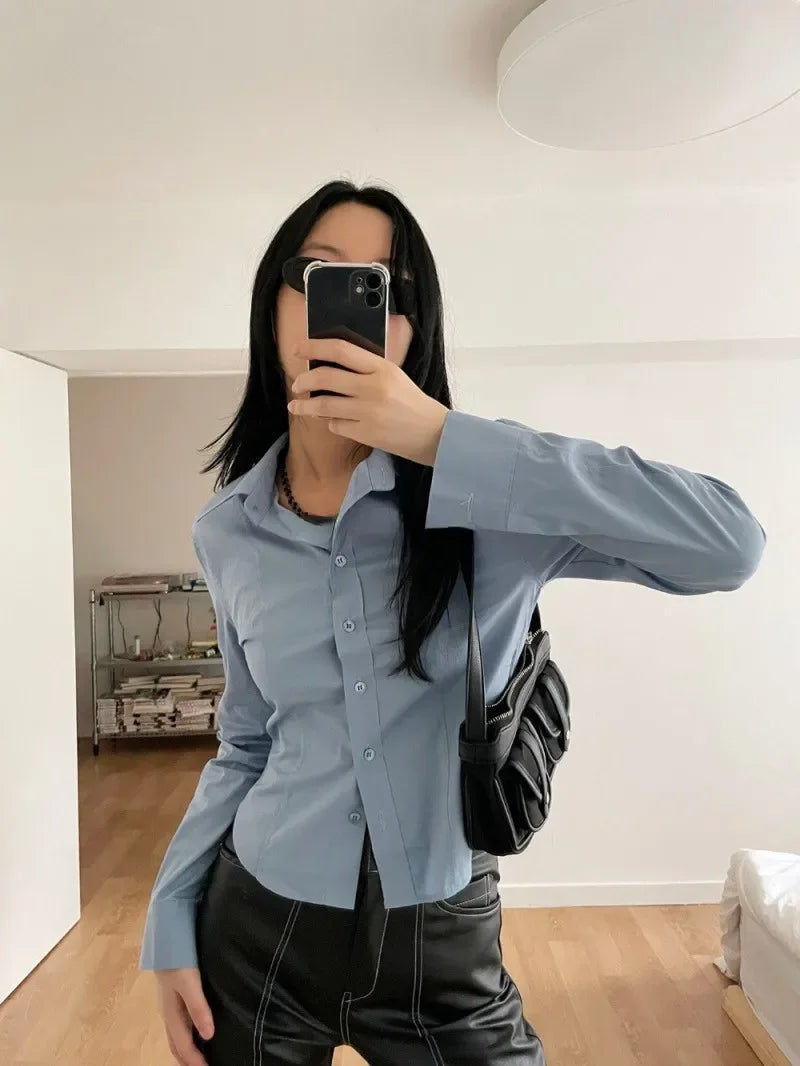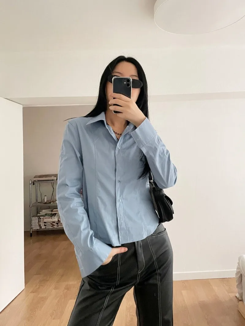 KYLTHOMASW - Women Shirts 2024 Autumn Long Sleeve Polo Neck Blouse Pattern Embroidery White Blue Chic Casual Streetwear Tops