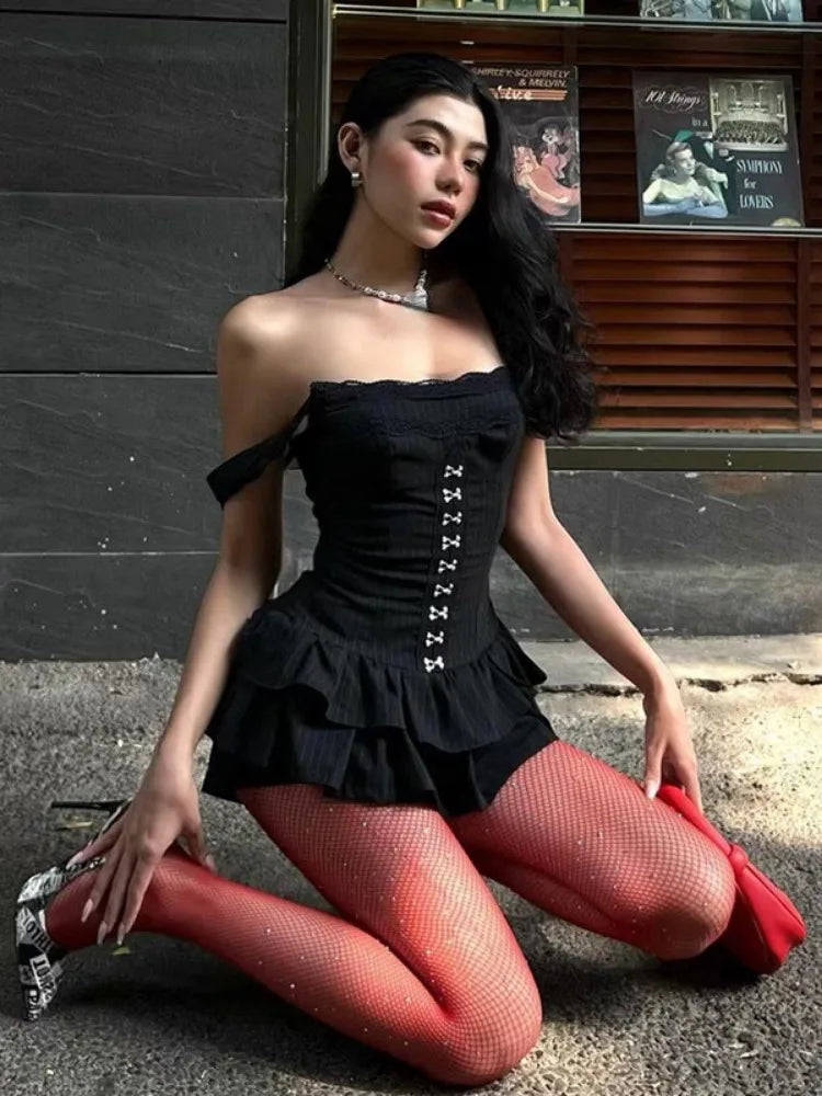 KYLTHOMASW - Y2k Aesthetic Lace Patchwork Women Dress Vintage Grunge Slim Harajuku Sexy Ruffled Dresses Stripe Streetwear Vestidos De Mujer
