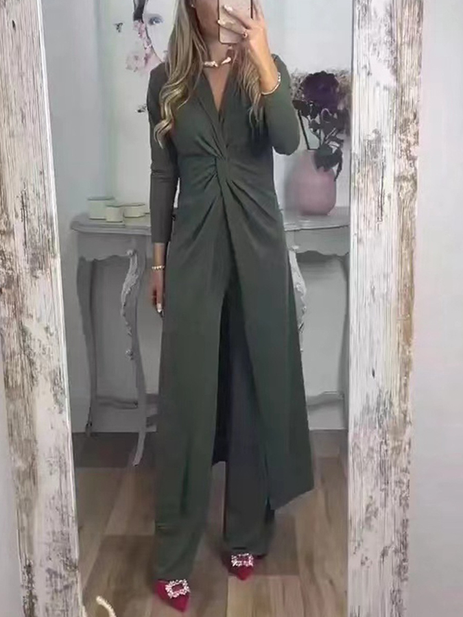 Long Sleeves Solid Knot-bot Top and Pants Sets