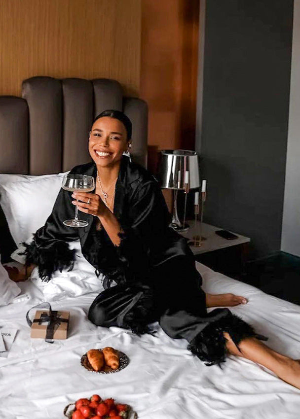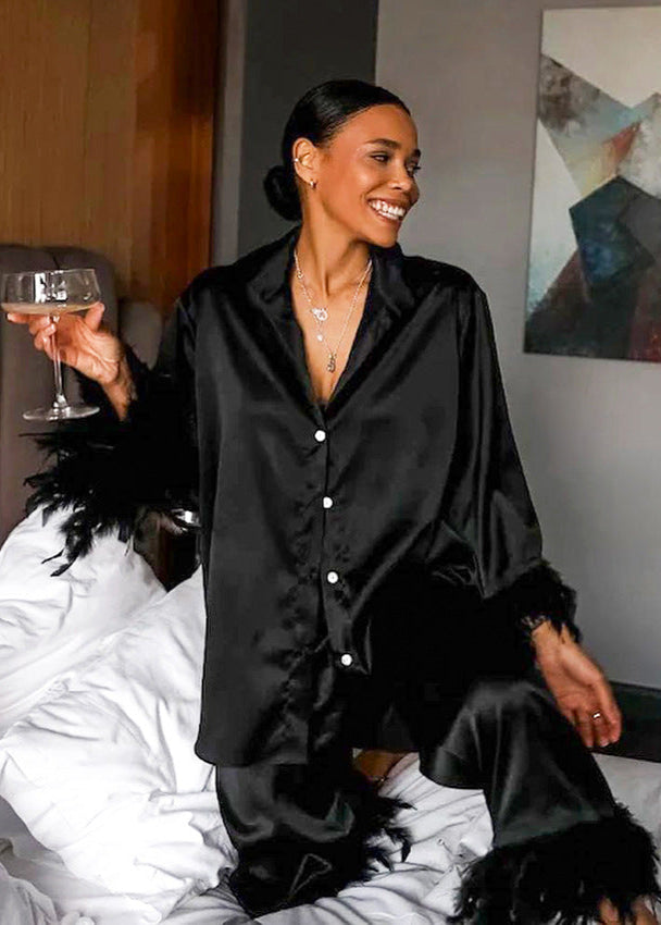 The Luxe Satin Feather Trim Set is your go-to for glamorous lounging and elevated evenings at home. Made from ultra-soft satin with a radiant finish, this two-piece set features a relaxed-fit button-down top and wide-leg pants. Feather trim accents at the cuffs and hems add a bold, playful twist to the classic silhouette. Lightweight and breathable, it delivers effortless comfort while making a striking impression—ideal for self-care nights or chic at-home entertaining.