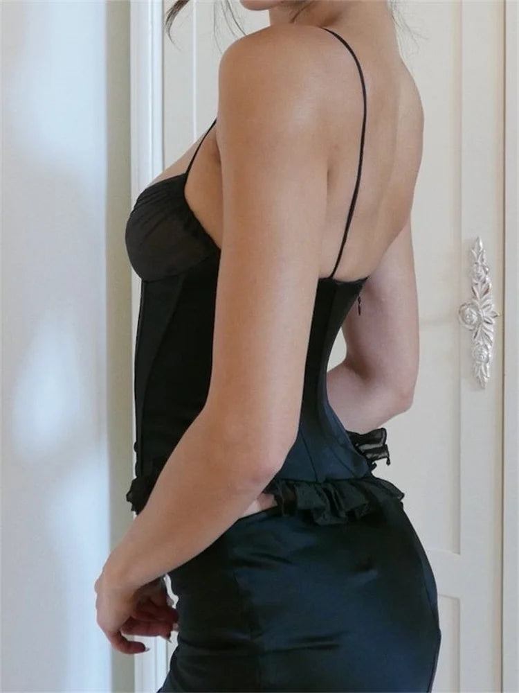 Mesh Sheer See Through Patchwork for Women V-neck Ruffles Hem Buttons Sleeveless Strap Summer Mini Vests Crop Top