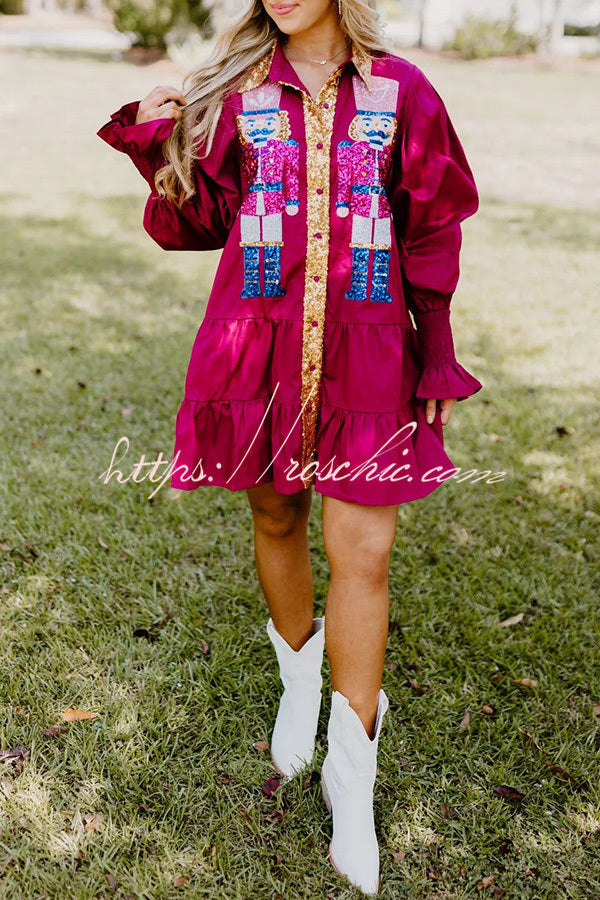 Visions of sugar-plums dance in your head with this festive dress! A pink, blue, white, and gold colored sequined nutcracker design - A sequined collared neckline that goes into a buttoned front - Long, loose sleeves with smocked ruffle cuffs - Hidden side pockets - A flowy silhouette that ends in a mini dress length hemline. _